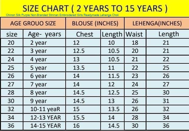 - Fabric Detail: Lehenga : Chinon Silk Beautiful Sequence Embroidered And Fancy Latkan Dore Design Diamond Grid Pattern Waistband Pattern, Inner : Micro Cotton , Blouse : Heavy Chinon Silk With Beautiful Sequence Embroidered Work, Inner : Micro Cotton , Dupatta : Heavy Net With Beautiful Lace Border , Size And Year : 20(2 Year ), 22 ( 3 Year ), 24(4 Year), 25( 5 Year ), 26 (6 Year), 27 (7 Year ), 28 ( 8 Year ), 30 (9 Year ), 32 (10-11 Year ), 34 (12-13 Year ), 36 (14-15 Year ) Size Chart Available