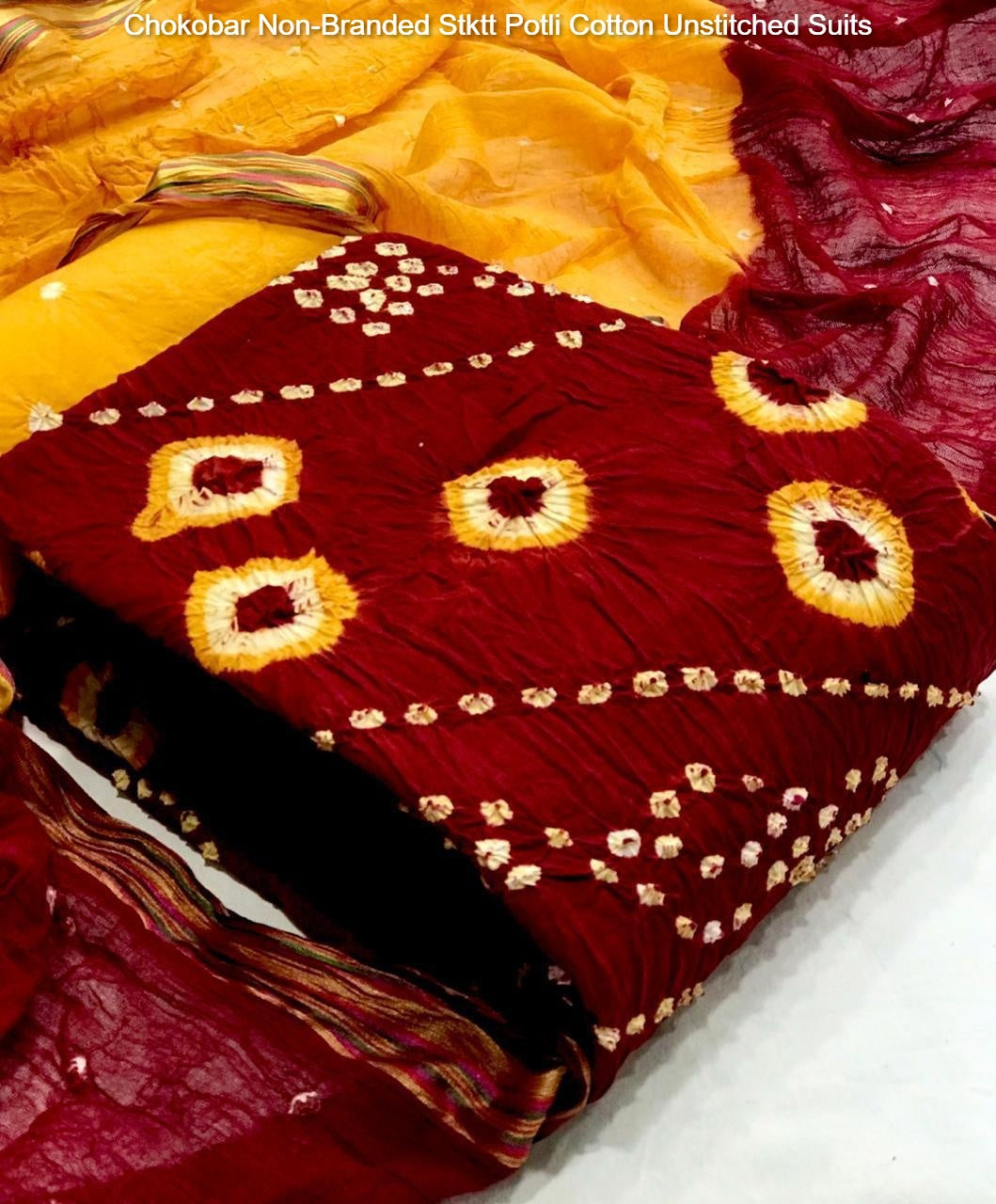 - Fabric Detail: Top : Original Potli Cotton Bandhni , Bottom : Cotton Print , Dupatta : Cotton With Banarasi Border ,