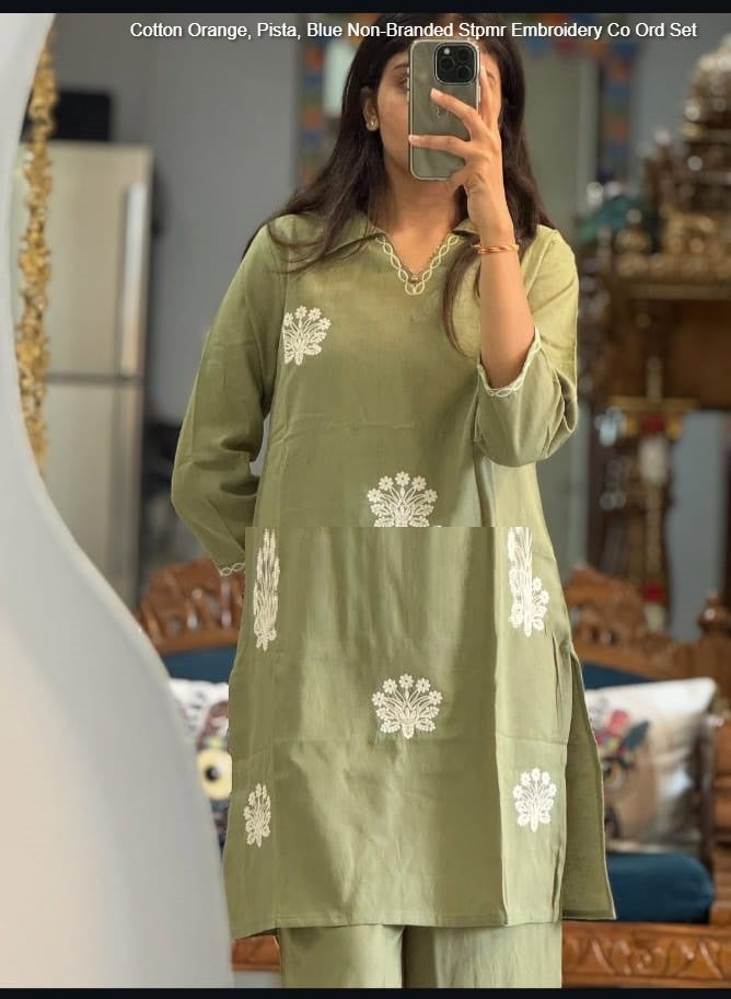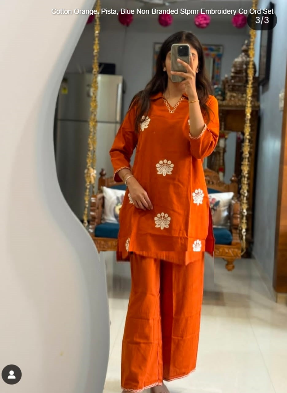 - Cotton Orange, Pista, Blue Non-Branded Stpmr Embroidery Co Ord Set Dealer Ahmedabad Surat Wholesale Gujarat India Lowest Price Best Quality Buy Purchase Shipping Kurta Salwaar Kameez Also free Cash on delivery
