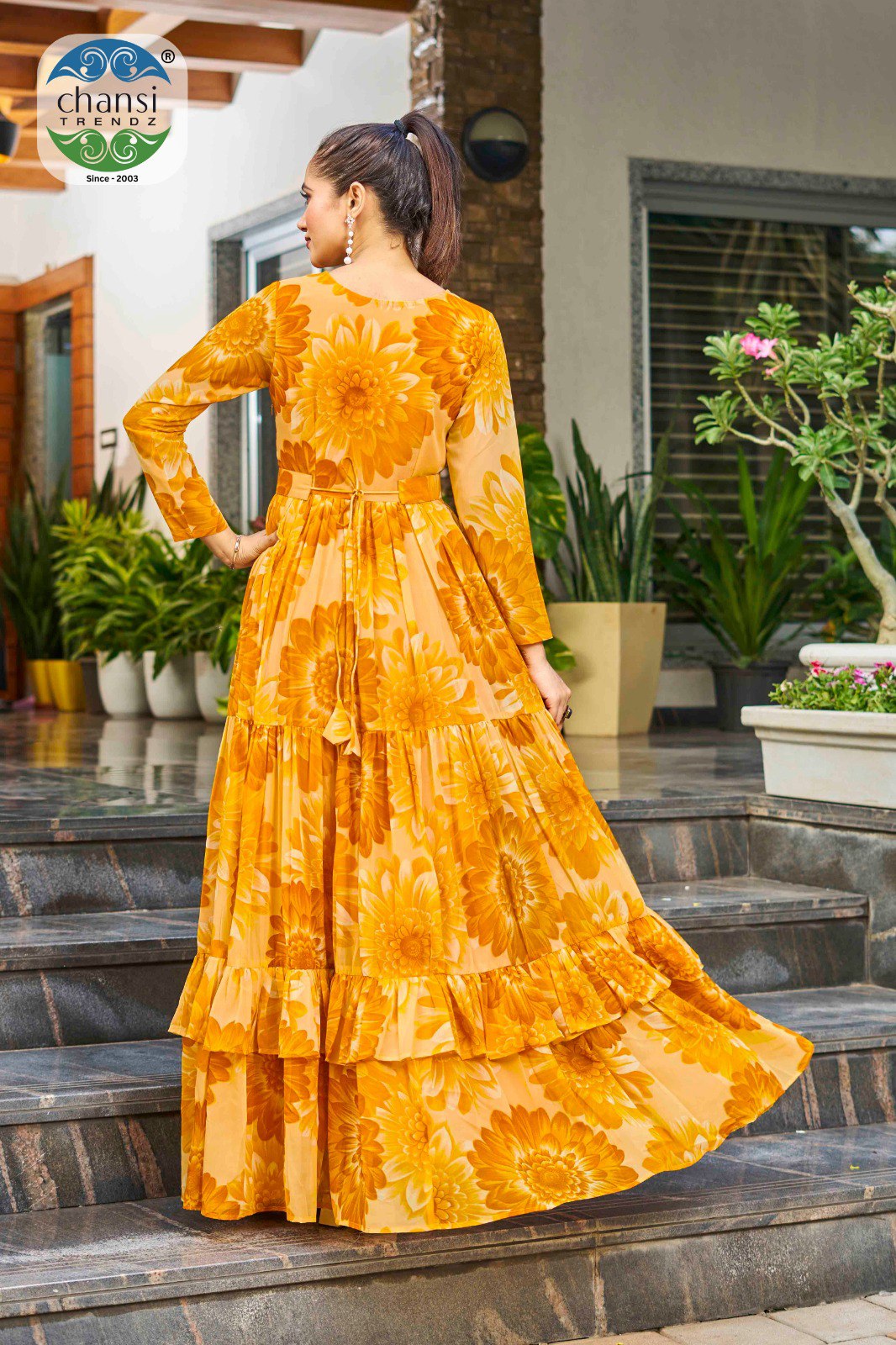- Fabric Detail: Georgette Fit And Flare Multilayer Floral Printed Maxi Gown, Length : 58 Apx, Flair : 6 Mtr Apx , , , Size : S, M, L, Xl, 2Xl