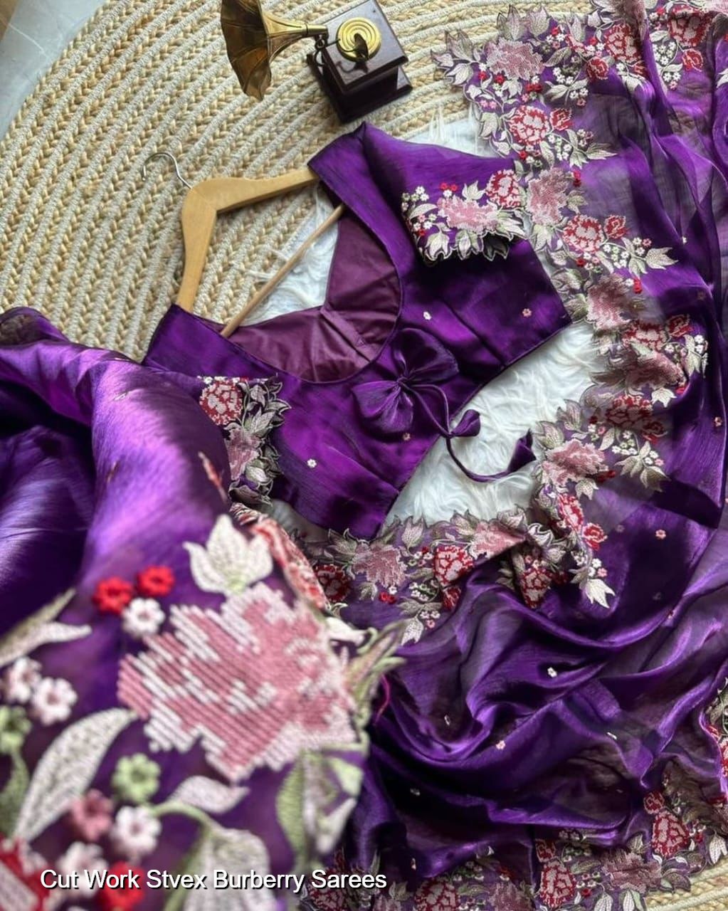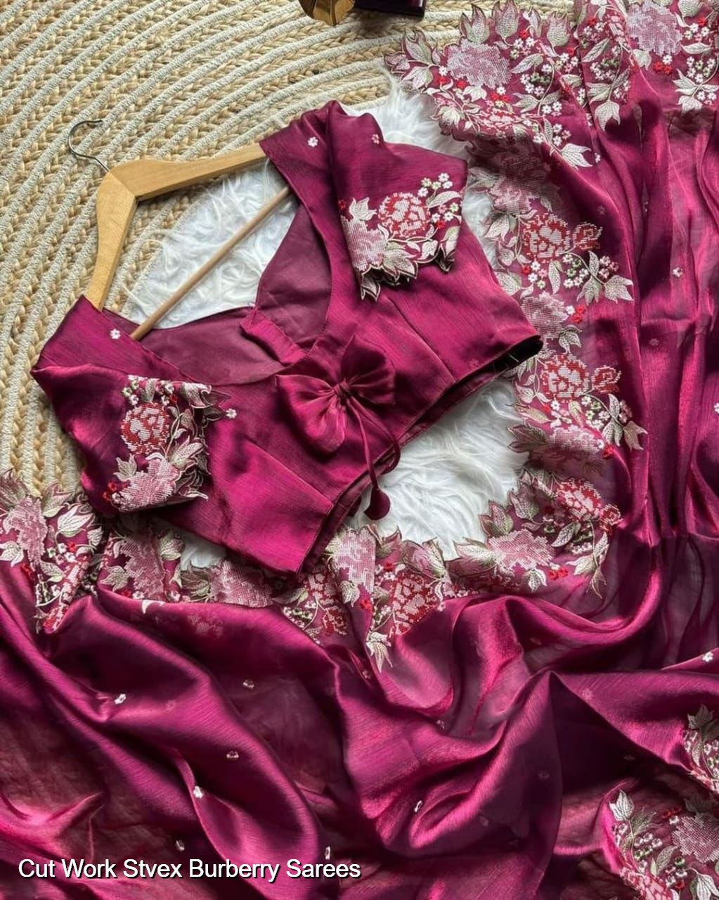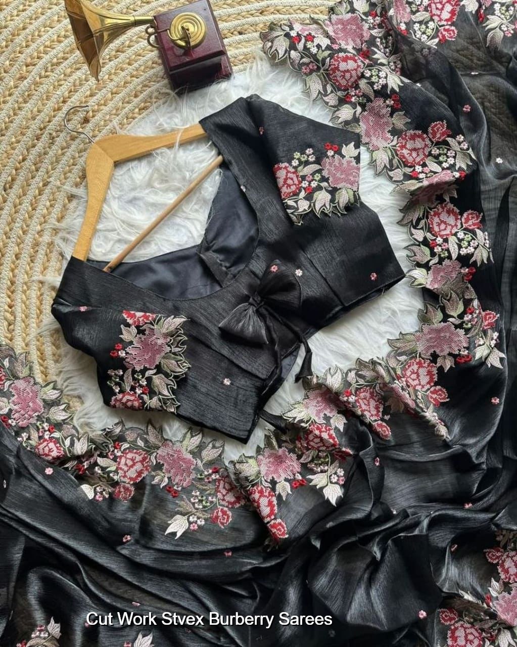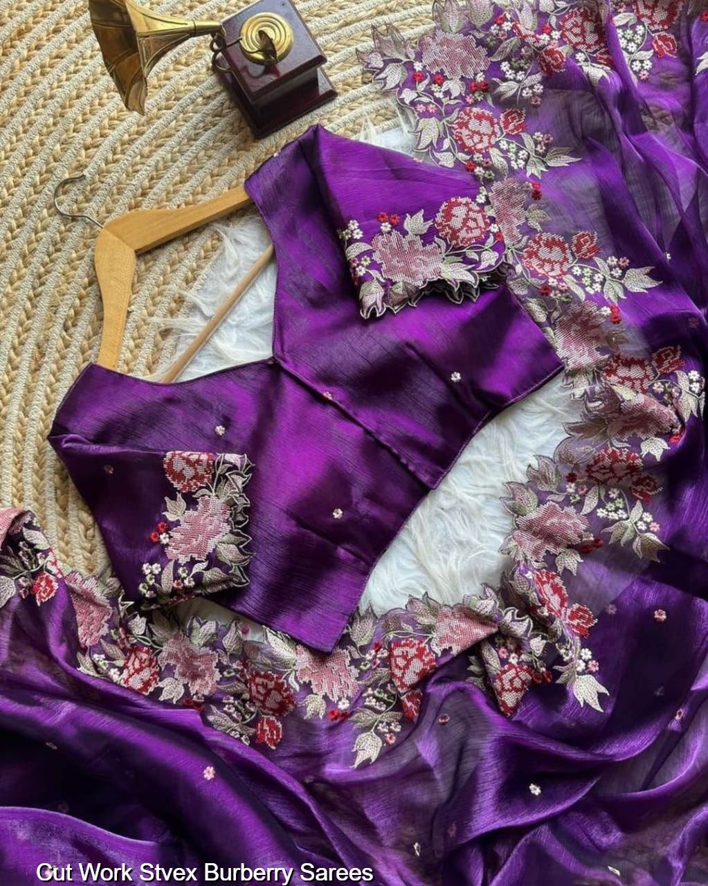 - Fabric Detail: Saree : Burberry Rich Cut Work Embroidery Work Four Side Rich Cut Work Full Length : 6.40 Mtr , Blouse : Burberry Embroidery , Note : Stitch Blouse 150 Rs Extra Rate ,