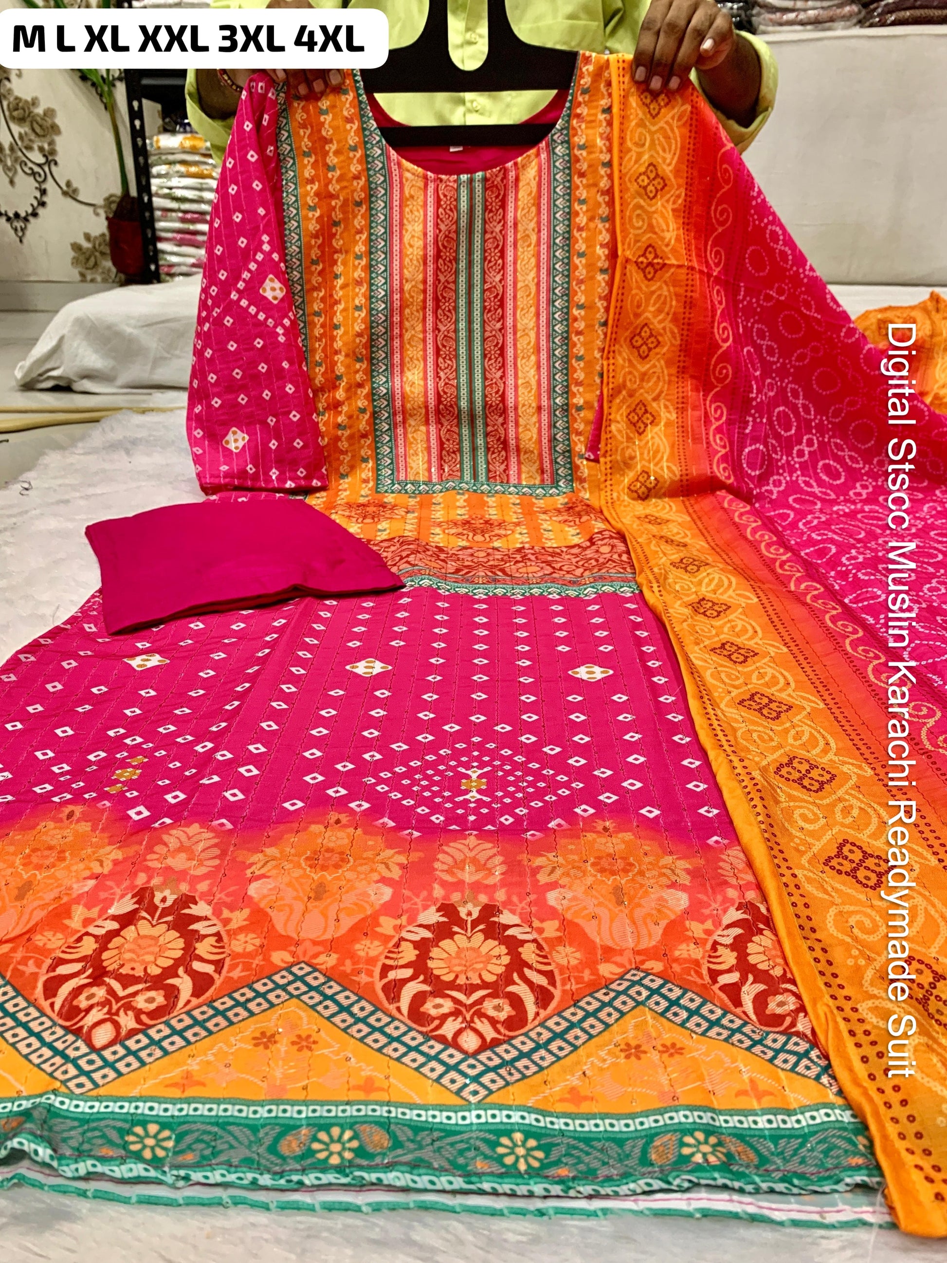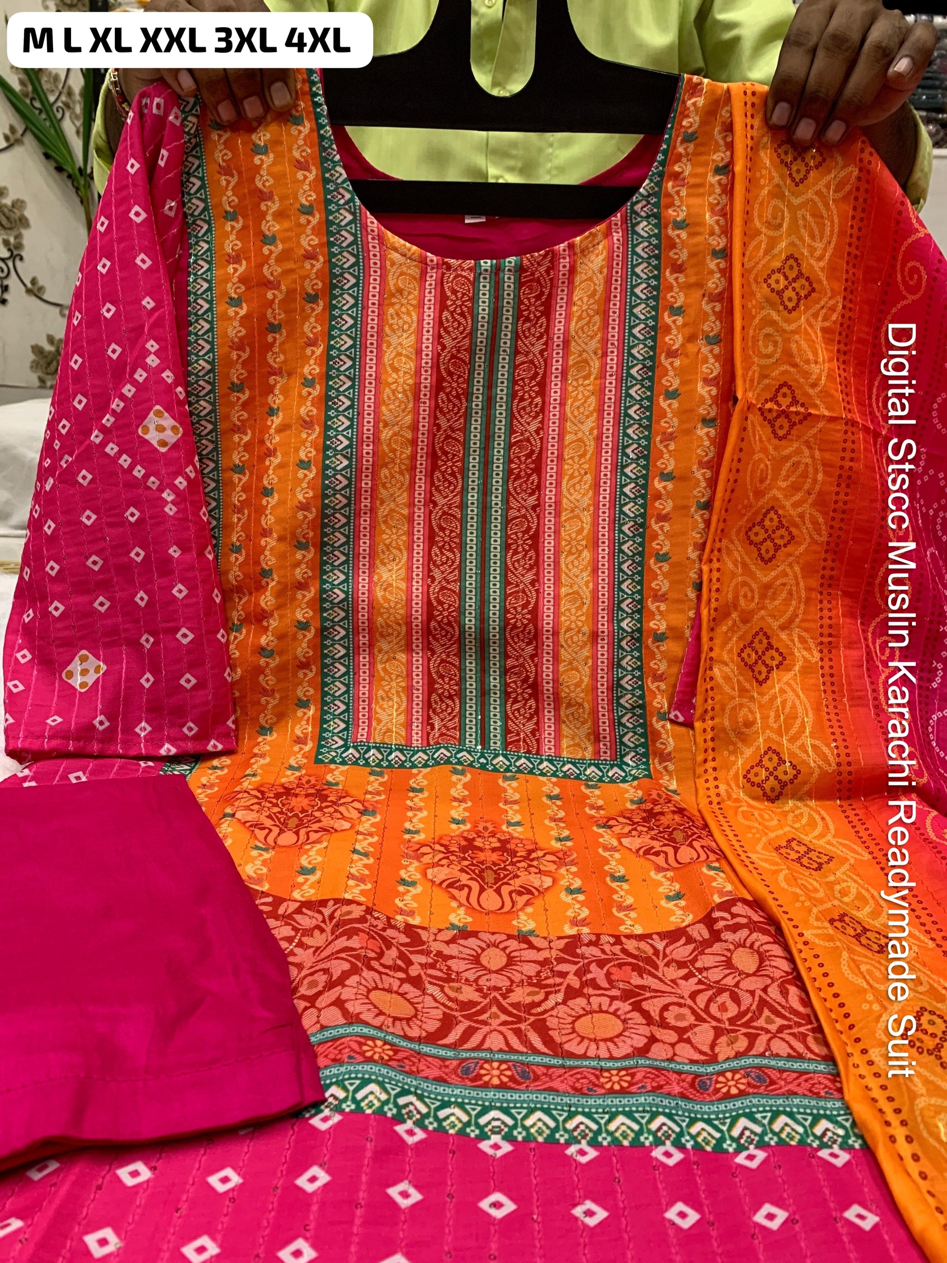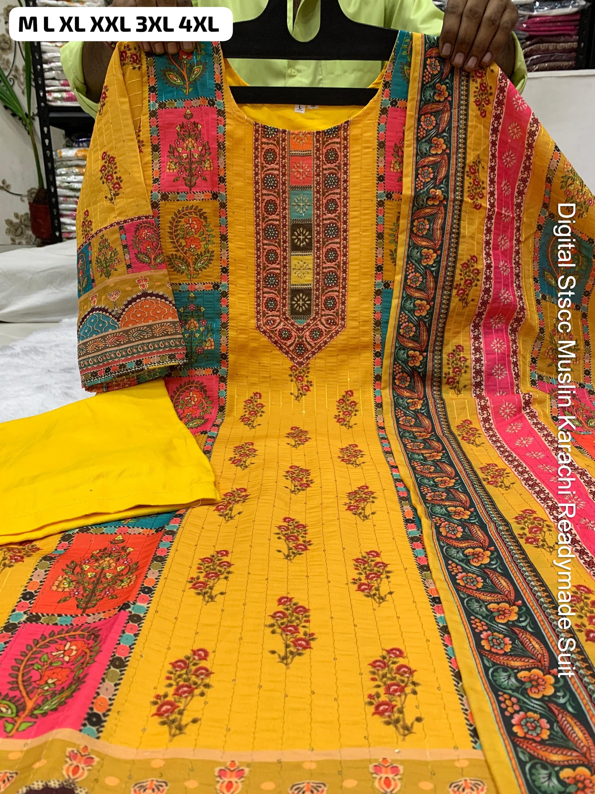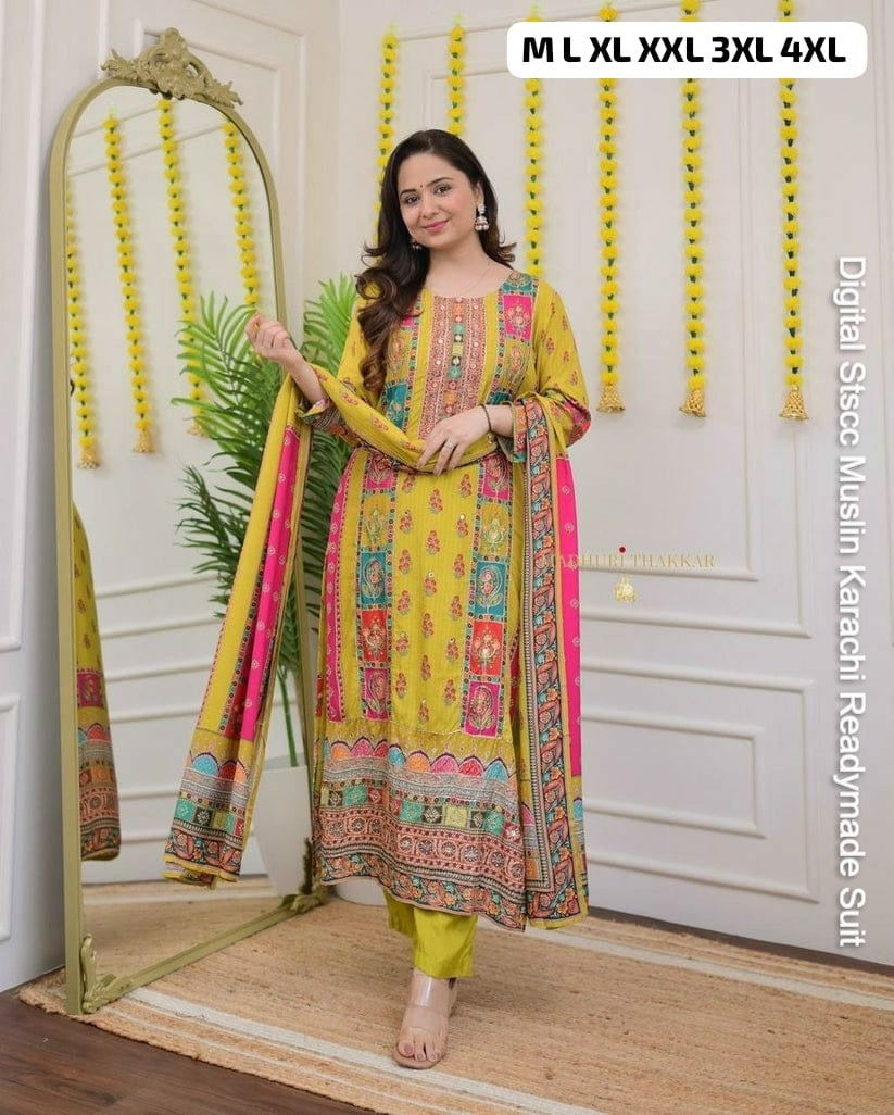 - Fabric Detail: Top : Pure Muslin Digital Print And Sequence Work Detailing Sound Like A Fashionable Choice For Upcoming Occasions, Bottom : Pure Muslin , Dupatta : Pure Muslin , Size : M, L, Xl, 2Xl, 3Xl,4Xl