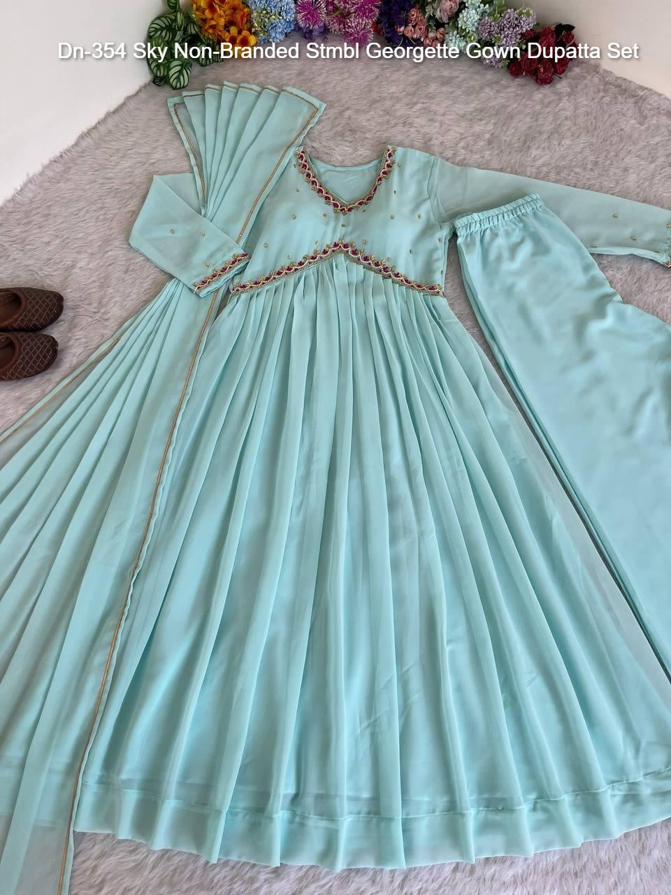 Dn-354 Sky Non-Branded Stmbl Georgette Gown Dupatta Set