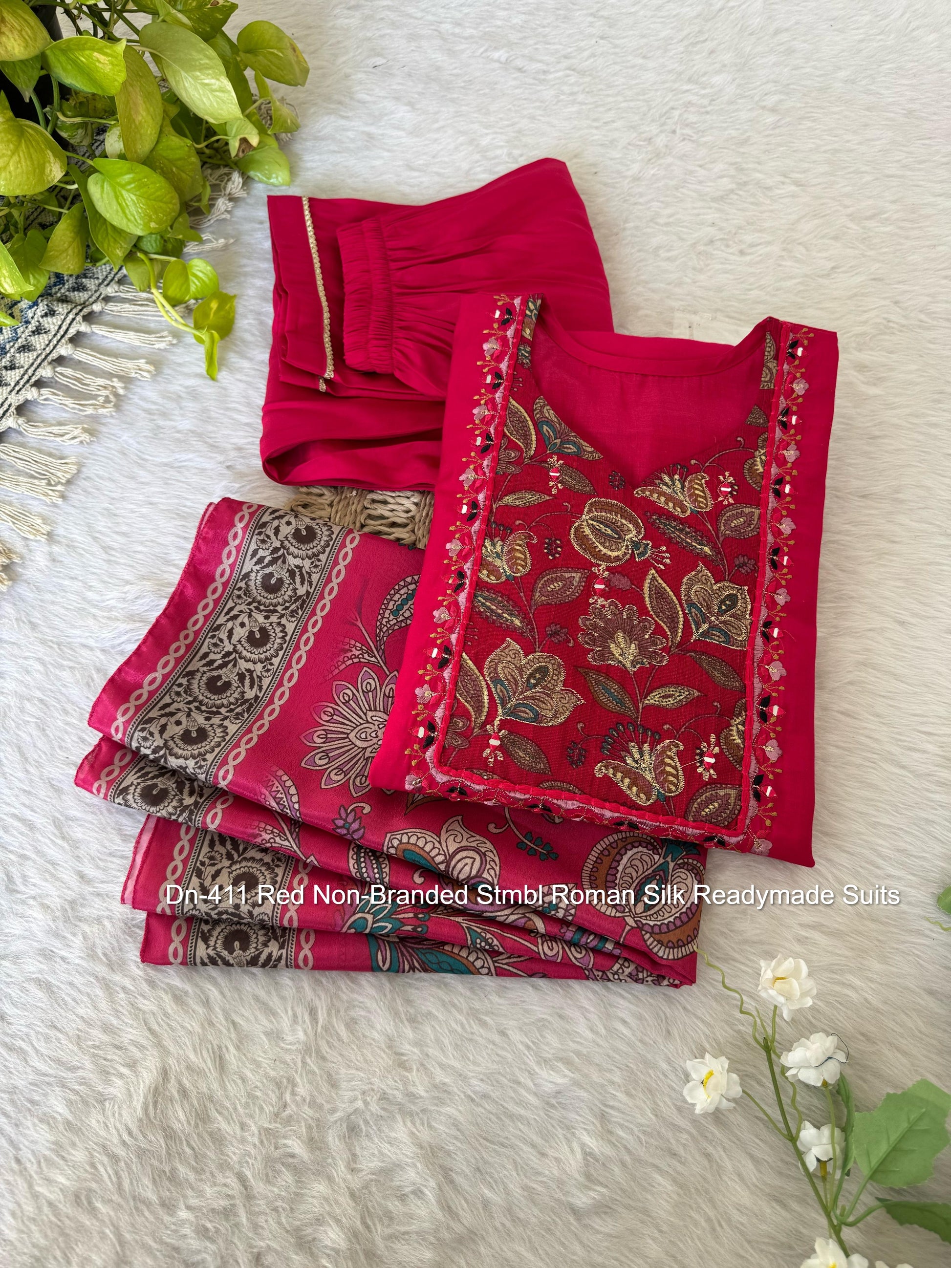 Dn-411 Red Non-Branded Stmbl Roman Silk Readymade Suits