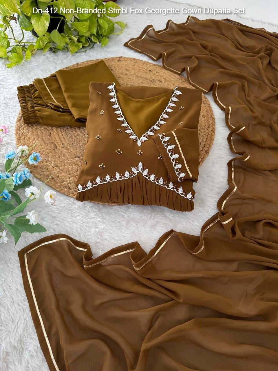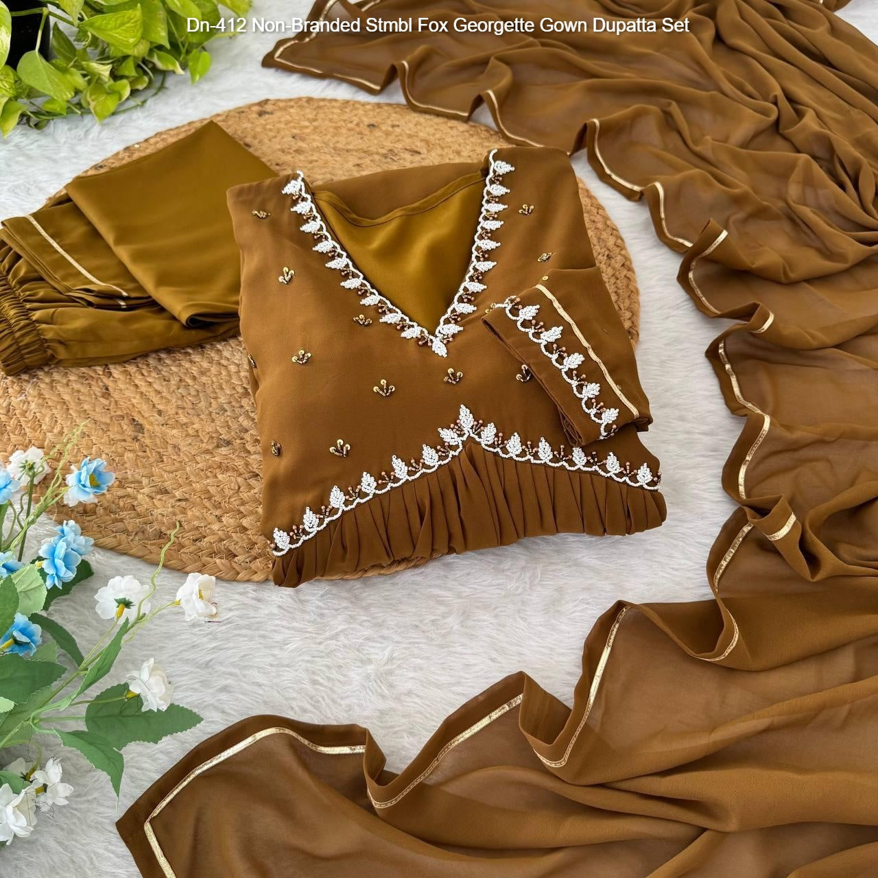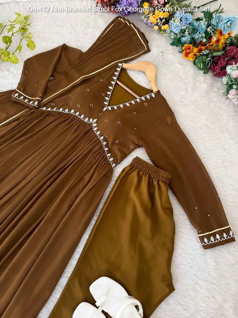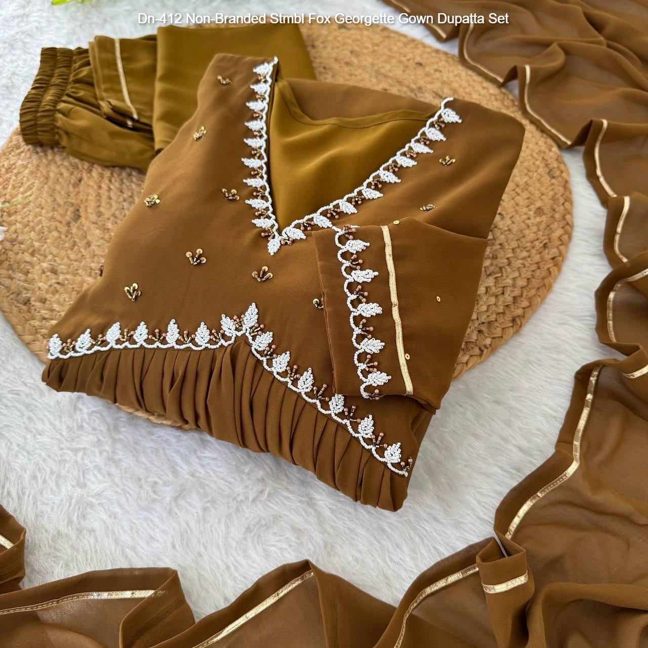 Dn-412 Non-Branded Stmbl Fox Georgette Gown Dupatta Set