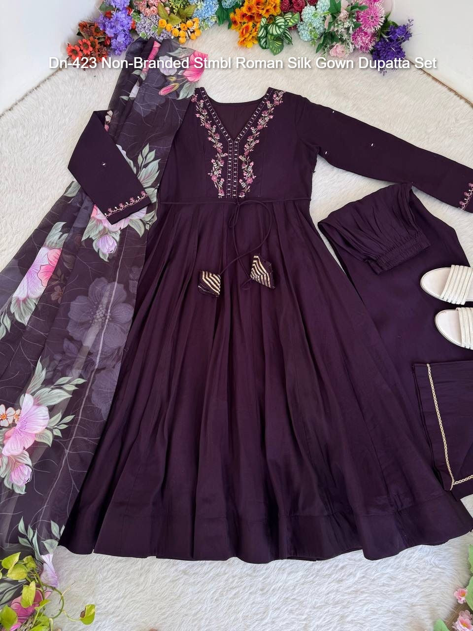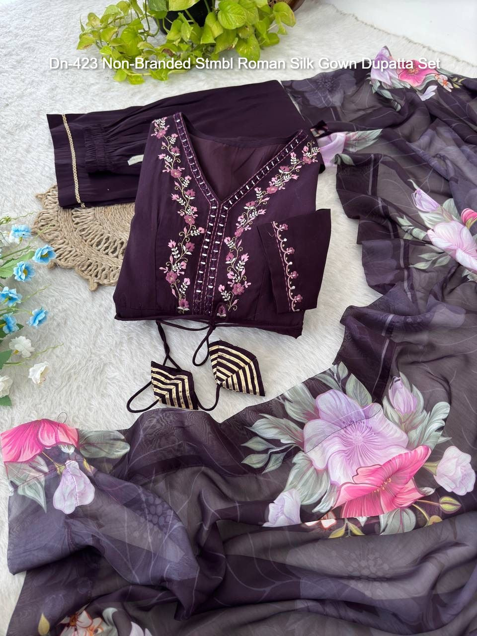 Dn-423 Non-Branded Stmbl Roman Silk Gown Dupatta Set