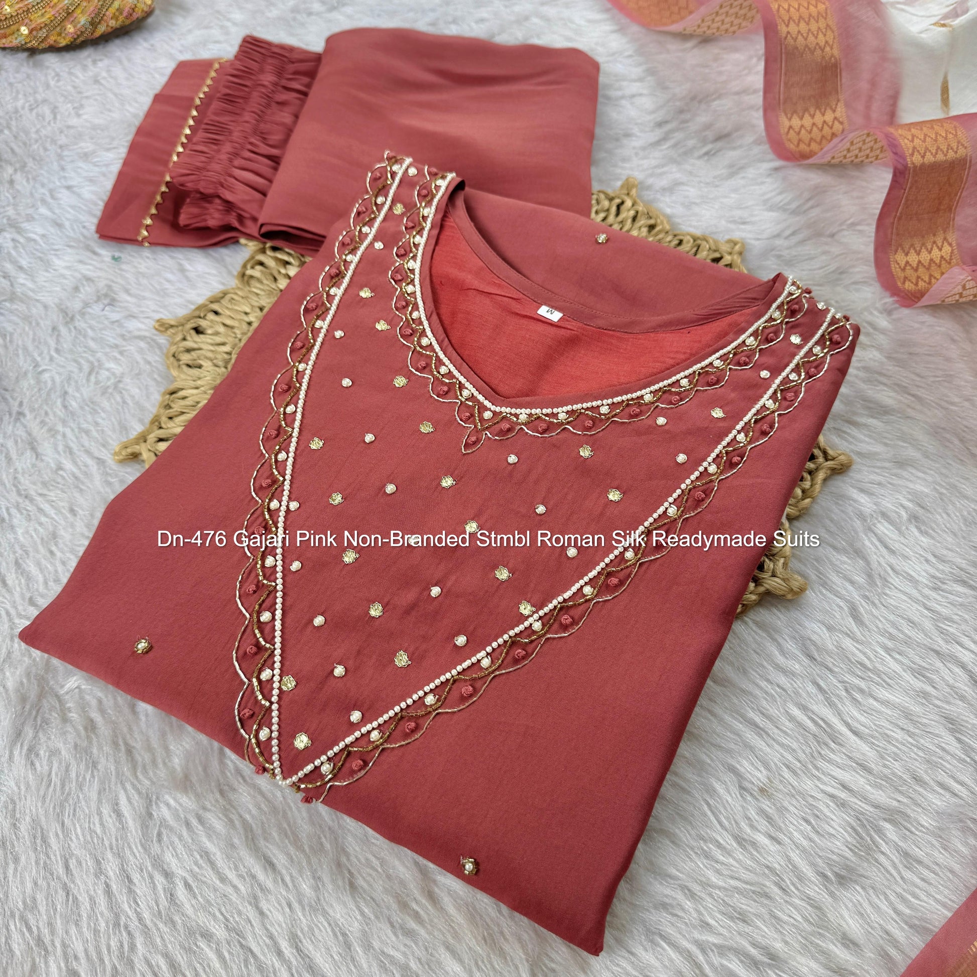 - Dn-476 Gajari Pink Non-Branded Stmbl Roman Silk Readymade Suits Dealer Ahmedabad Surat Wholesale Gujarat India Lowest Price Best Quality Buy Purchase Shipping Kurta Salwaar Kameez Also free Cash on delivery