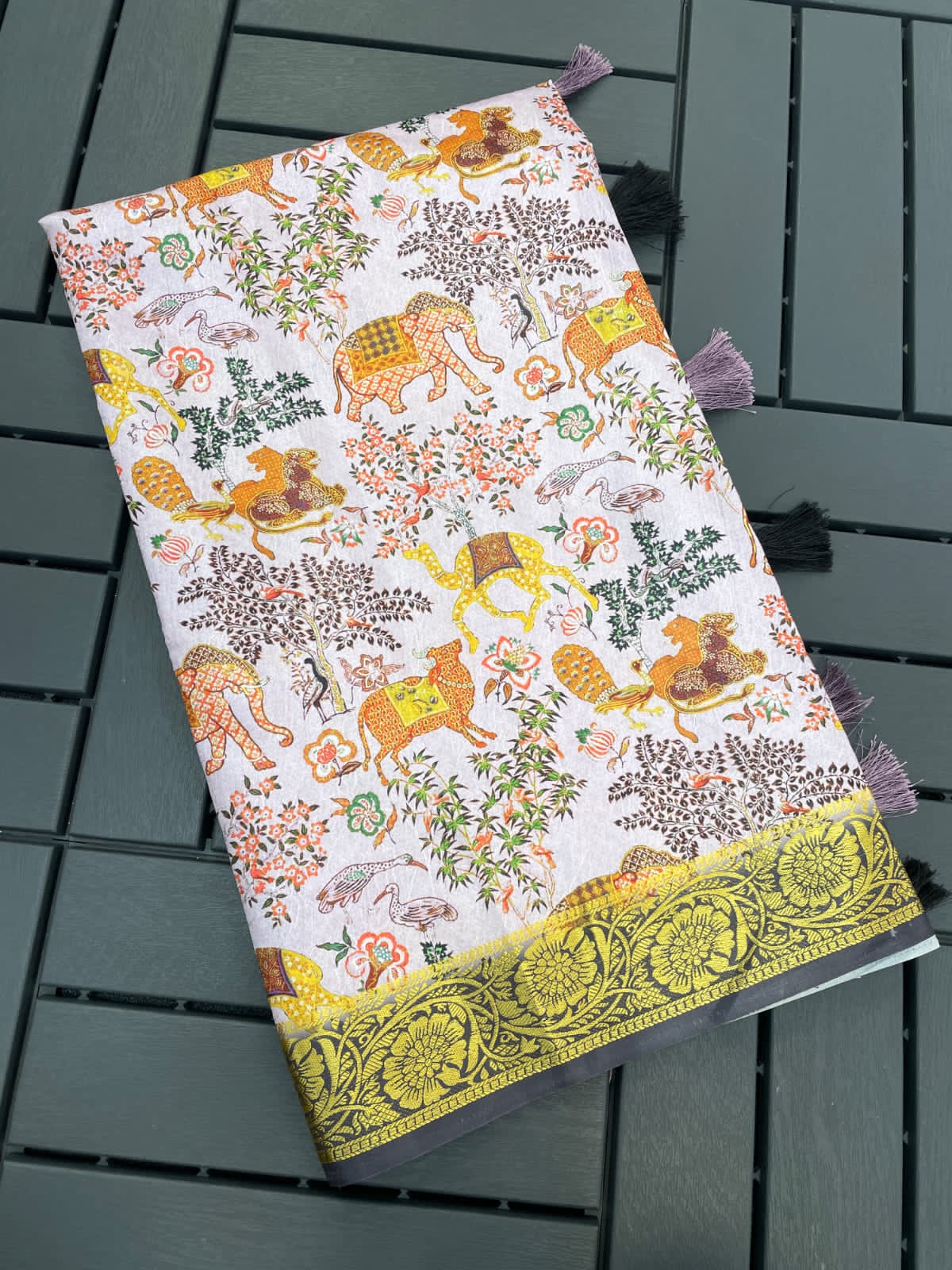 - Fabric Detail: Saree : Pure Dola Silk With Self Weaving All Over And Viscose Jacquard Weaving Border Beautiful Digital Print , Blouse : Contrast Border Pallu With Tassels , ,