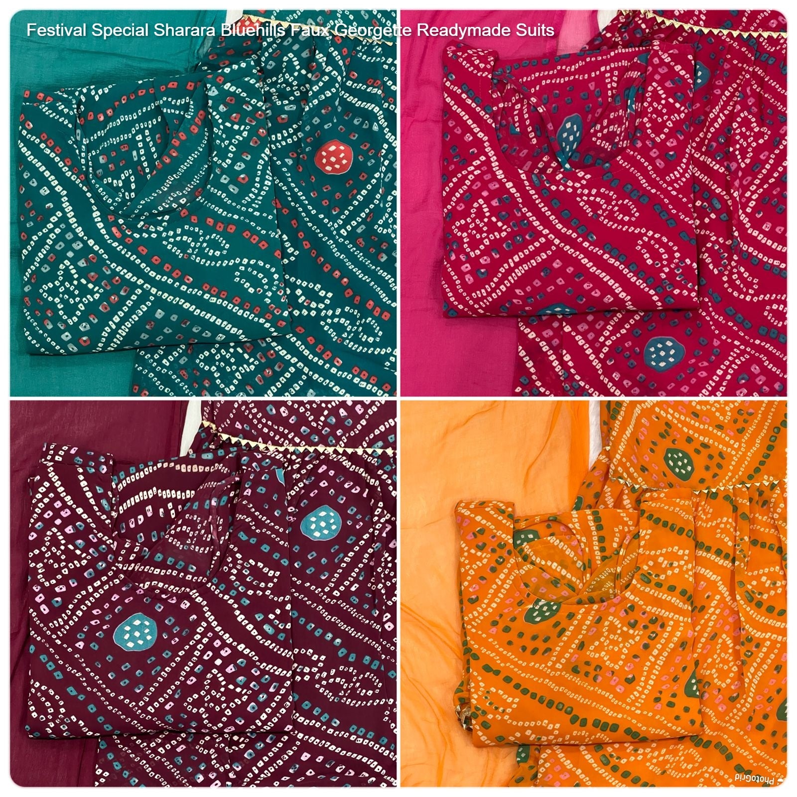 - Fabric Detail: Top : Faux Georgette Print With Back Pattern Bandhani Print, Inner : Crepe, Length : 35 Apx, Bottom : Faux Georgette With Lace Border Elastic Waist, Length : 40 Apx, Inner : Crepe , Dupatta : Nazmeen, Cut : 2.15 Mtr, Colours : Pink, Teal, Orange,Maroon, Size : L, Xl, 2Xl