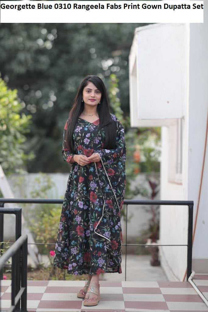 - Georgette 0310 Blue Rangeela Fabs Print Gown Dupatta Set Dealer Ahmedabad Surat Wholesale Gujarat India Lowest Price Best Quality Buy Purchase Shipping Kurta Salwaar Kameez Also free Cash on delivery