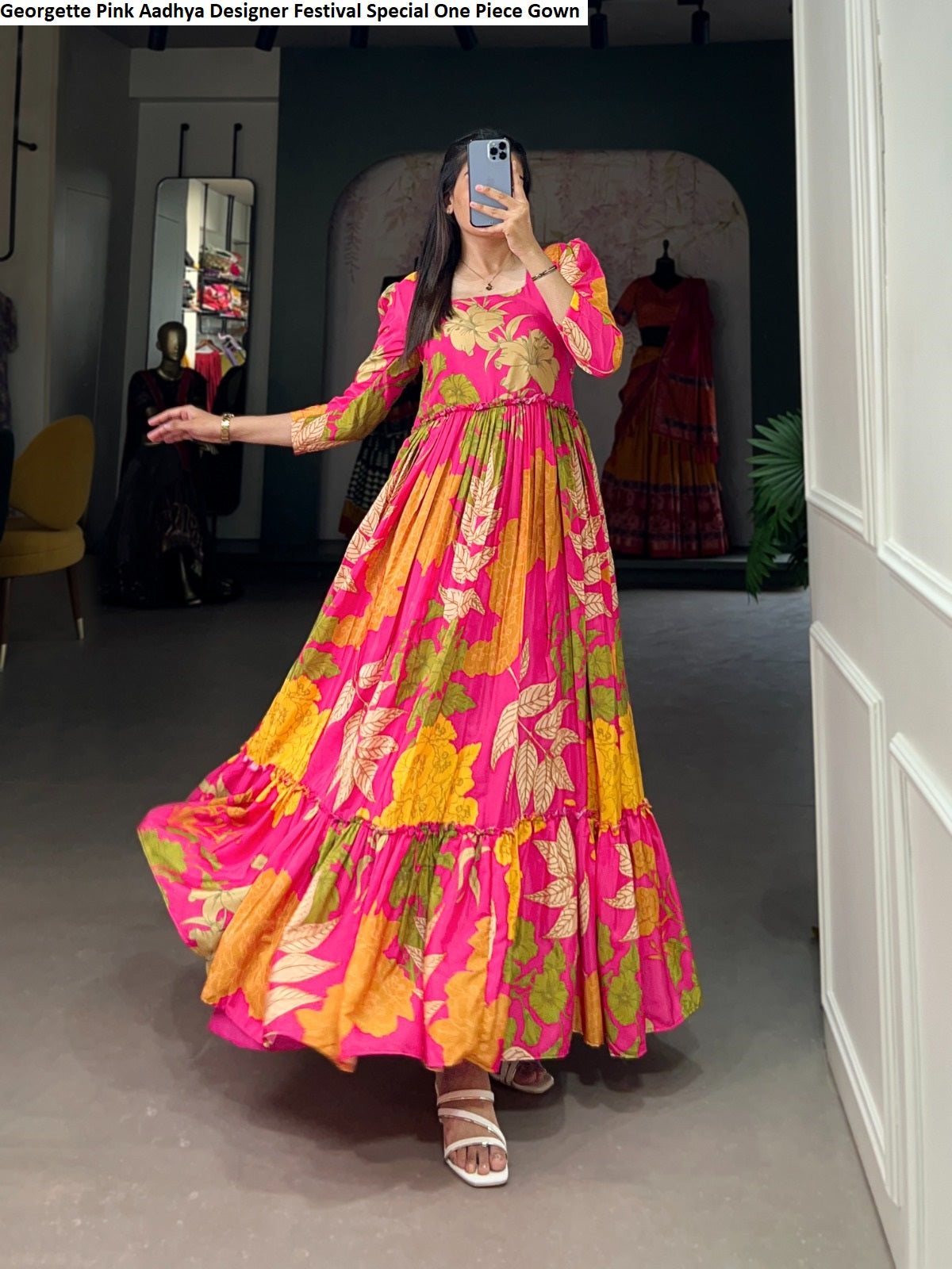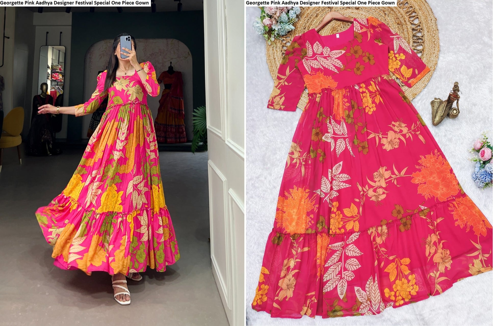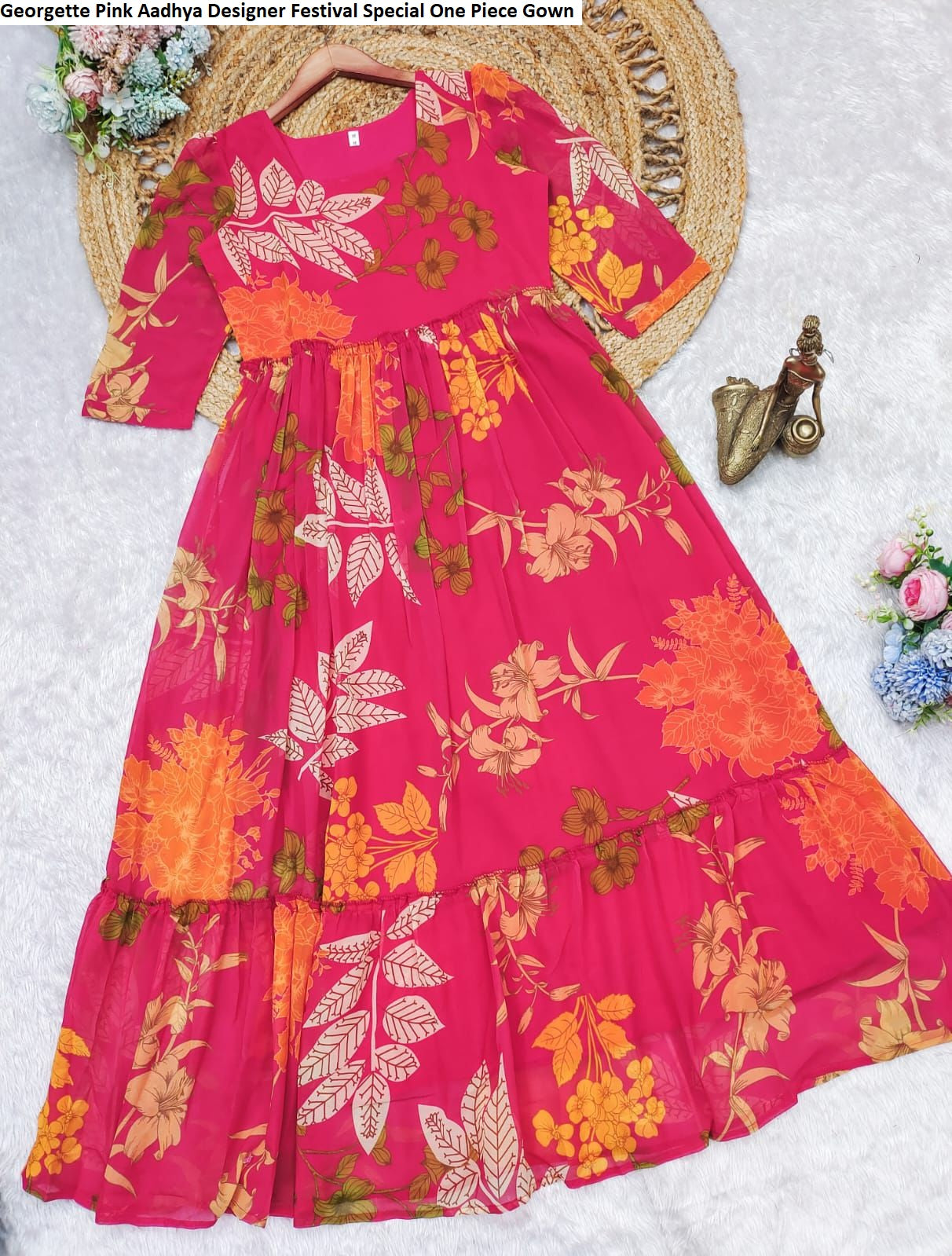 - Georgette Pink Aadhya Designer Festival Special One Piece Gown Dealer Ahmedabad Surat Wholesale Gujarat India Lowest Price Best Quality Buy Purchase Shipping Kurta Salwaar Kameez Also free Cash on delivery