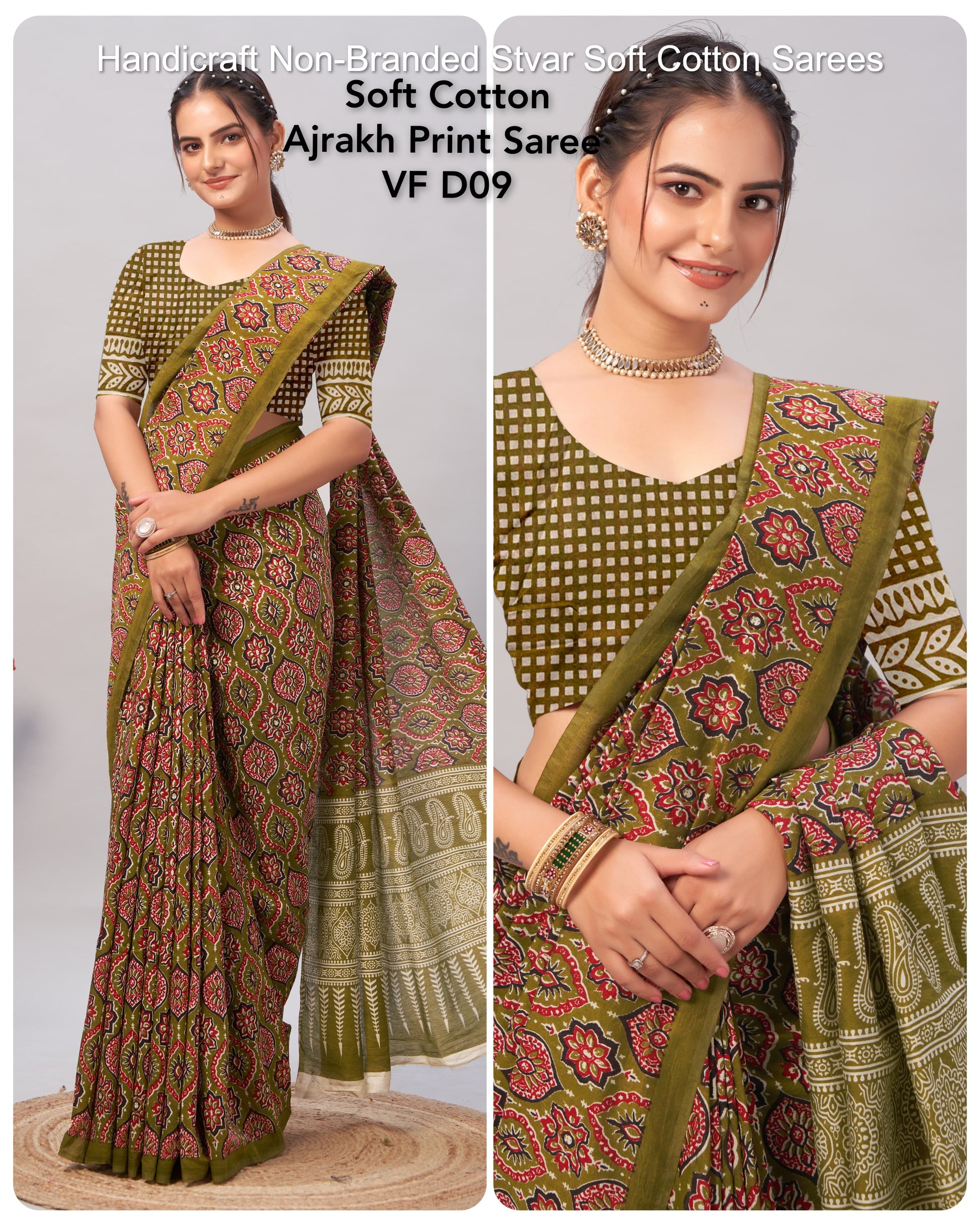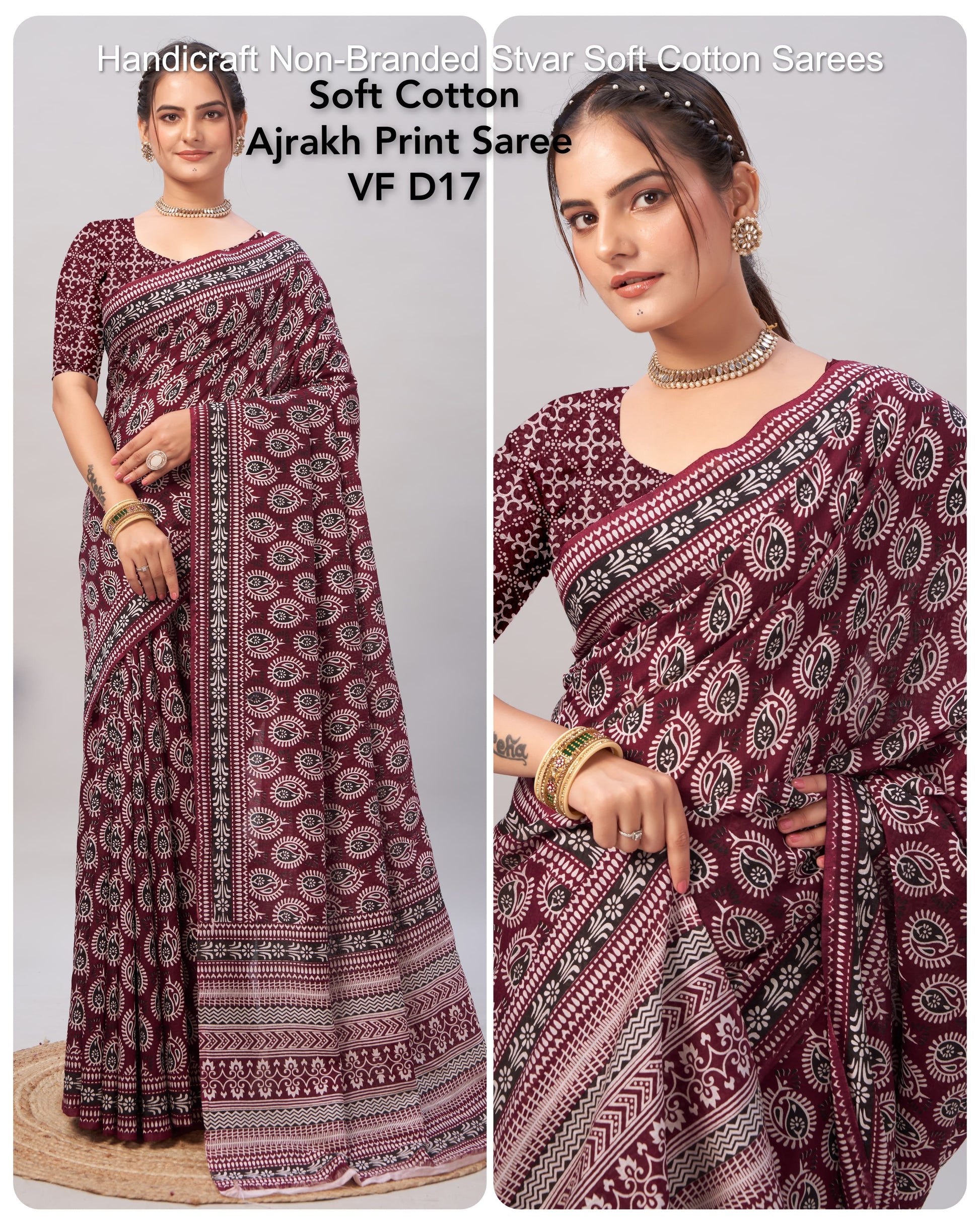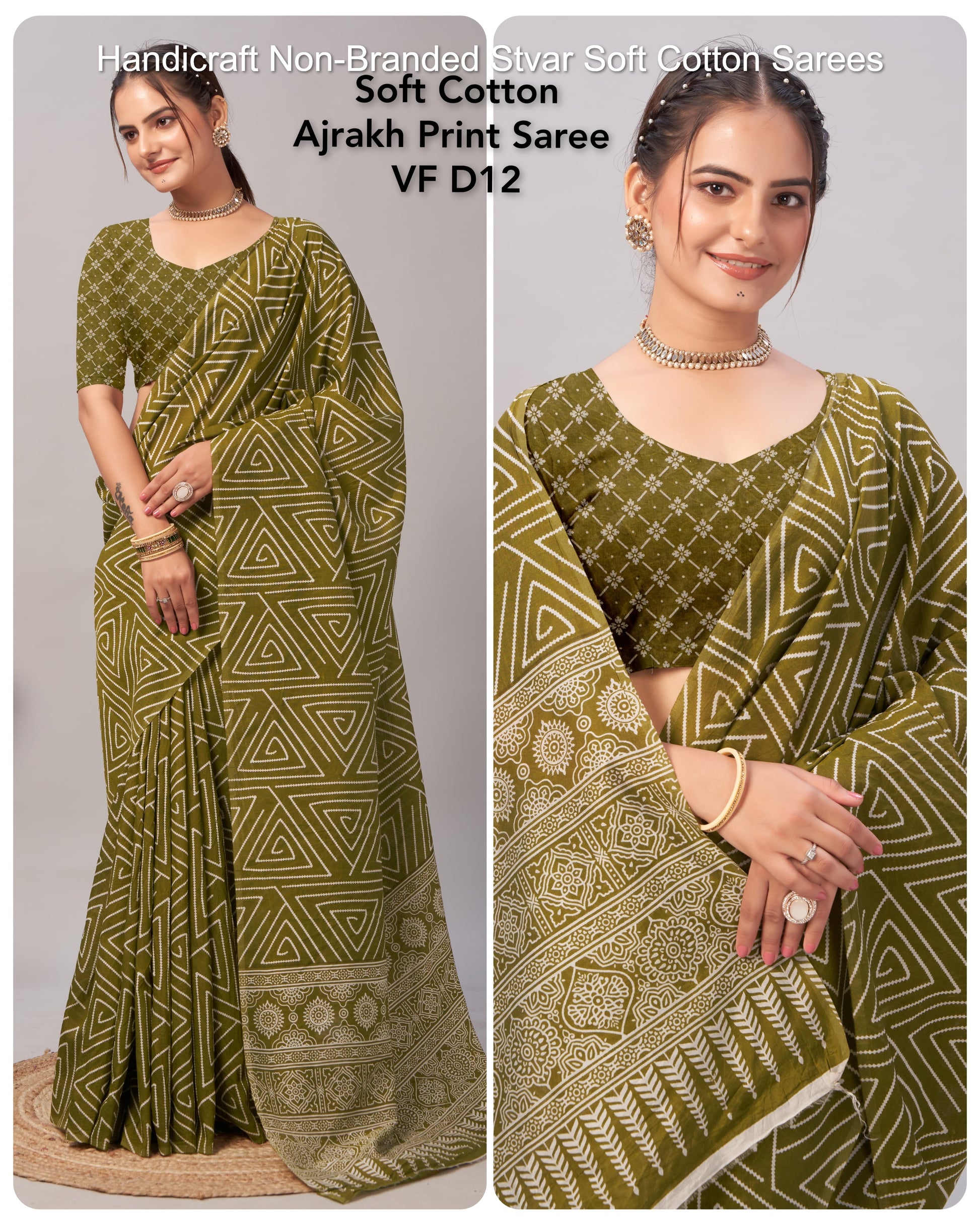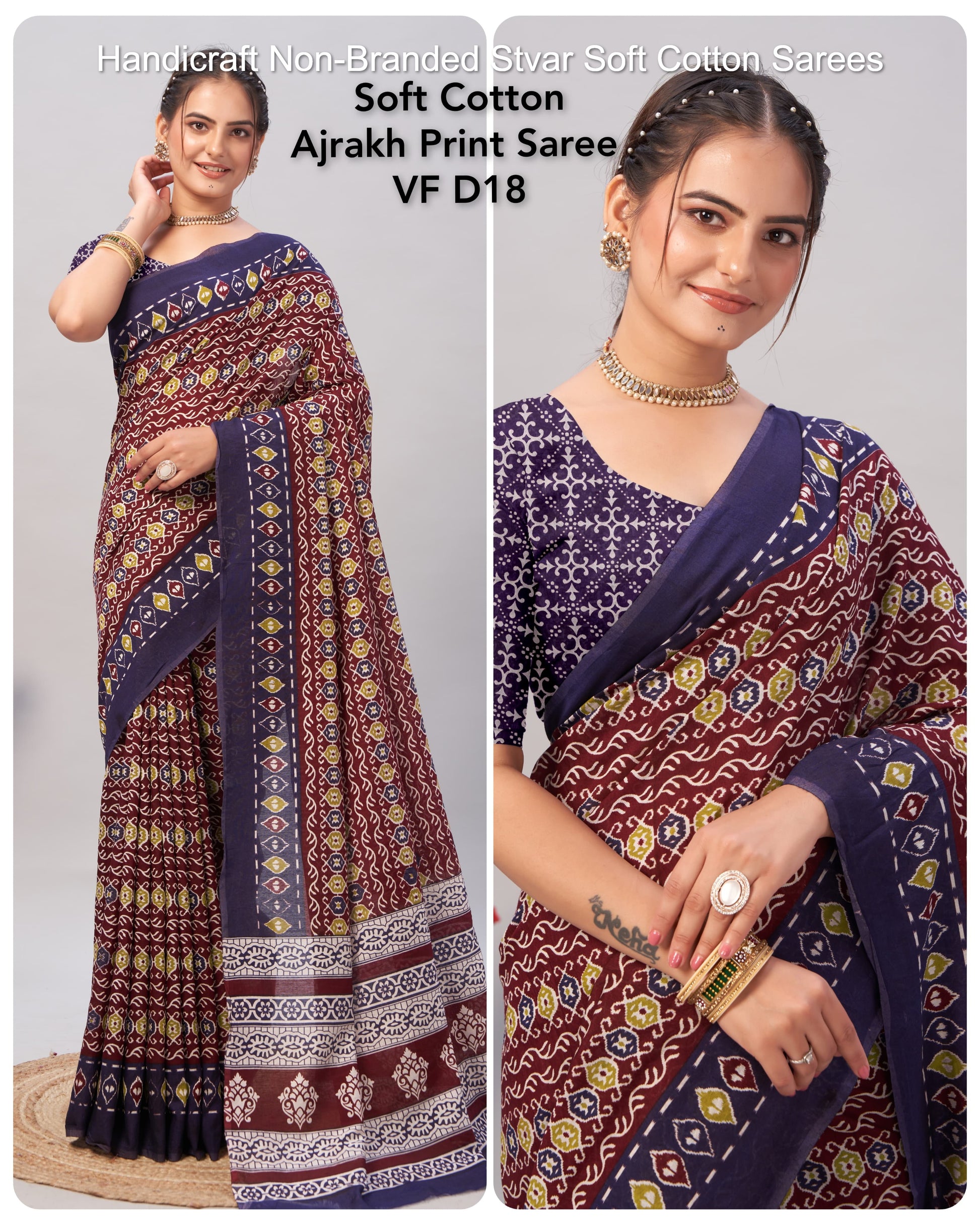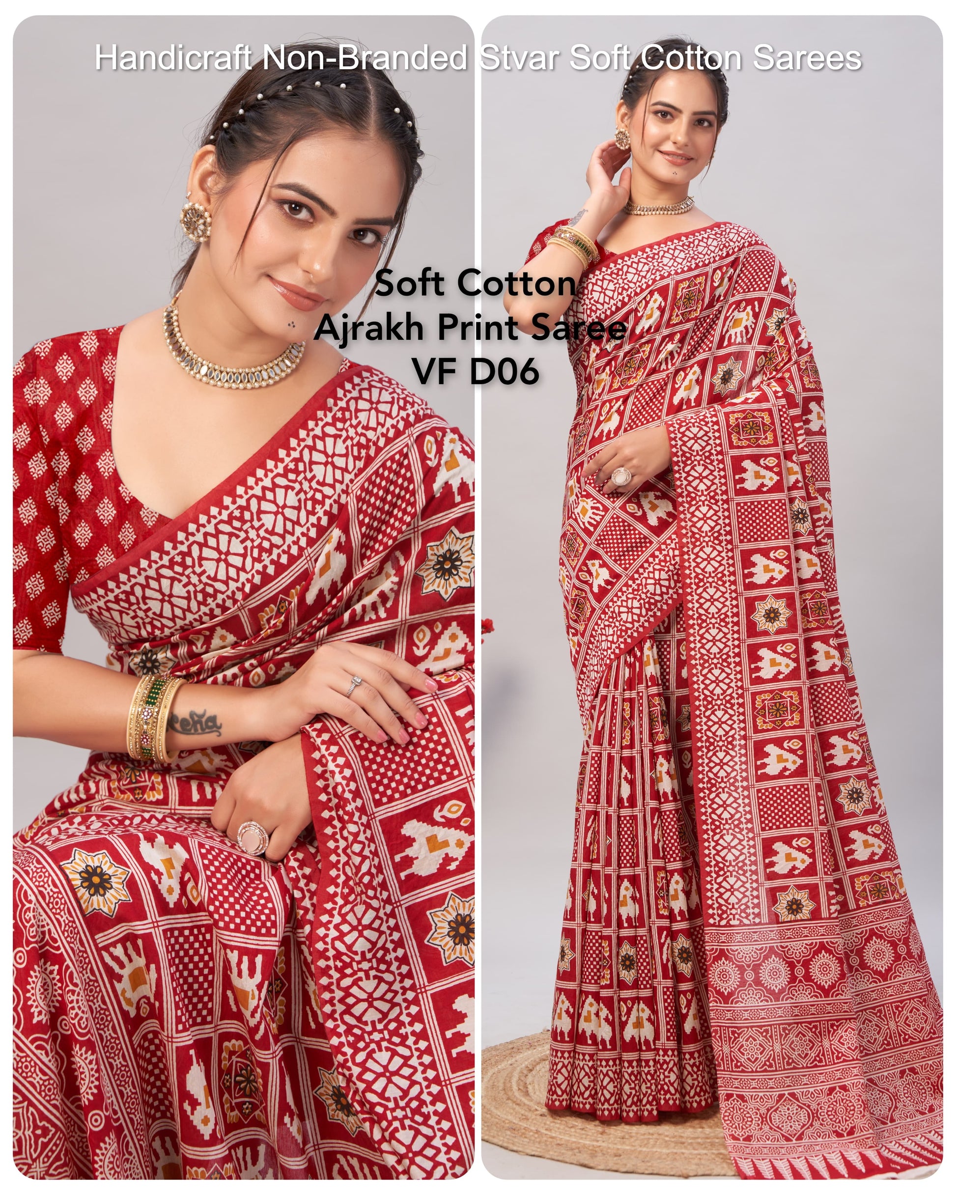 - Fabric Detail: Saree : Soft Cotton Handicraft Ajrakh Print, Cut : 5.5 Mtr , Blouse : Running, Cut : 0.90 Mtr Unstitched , ,