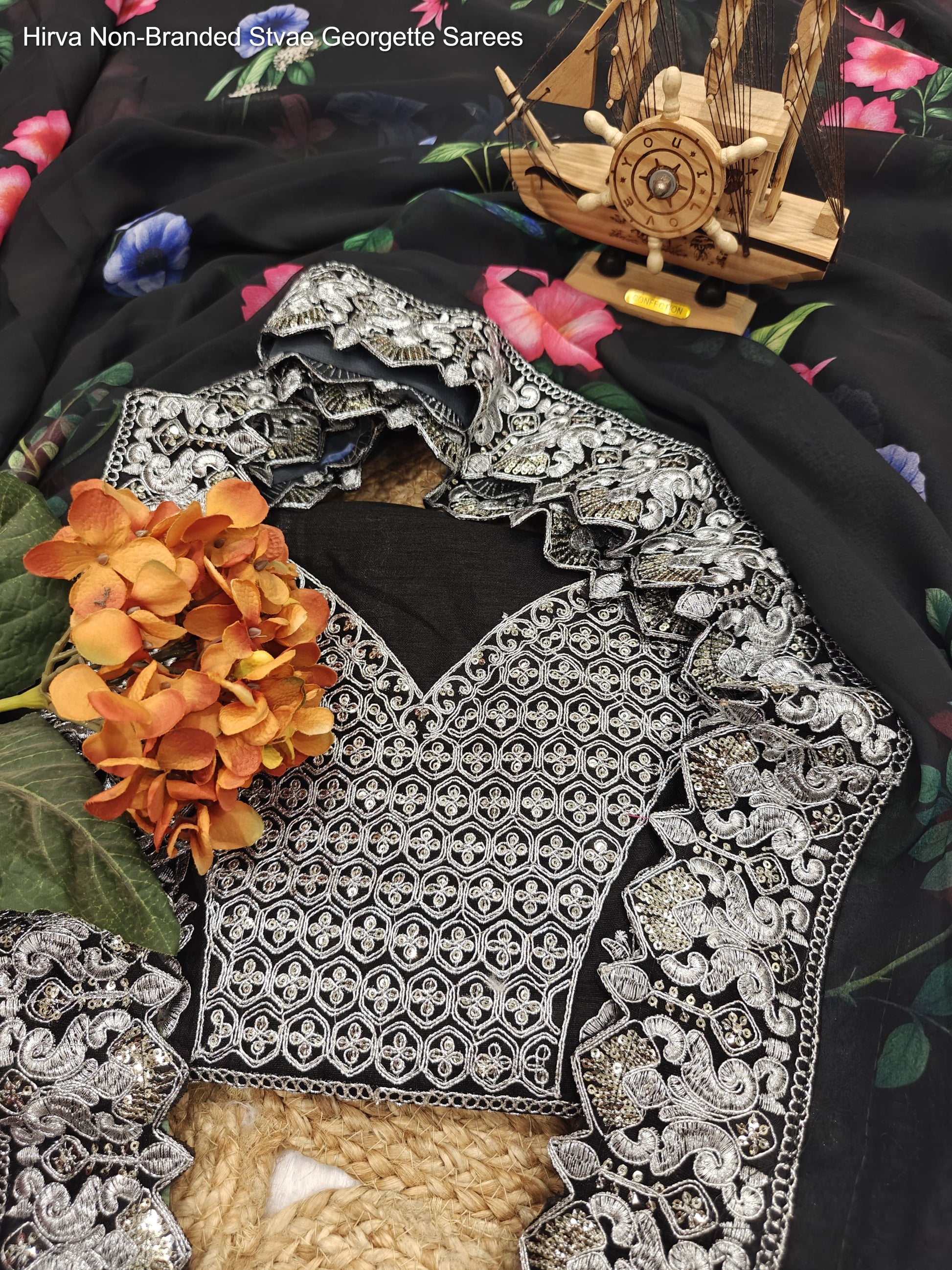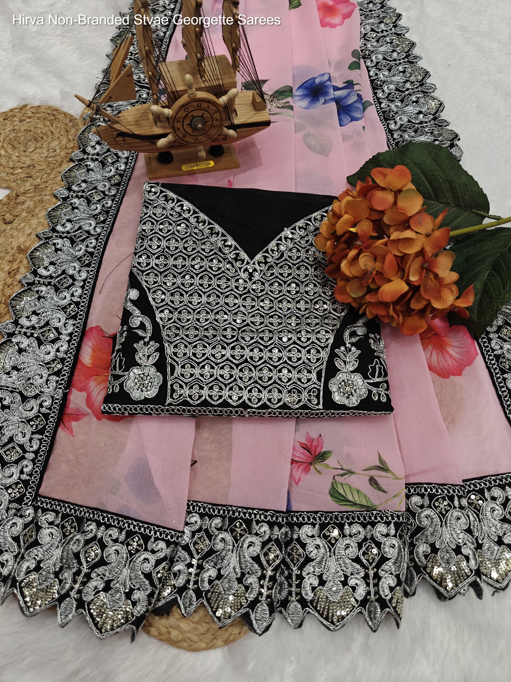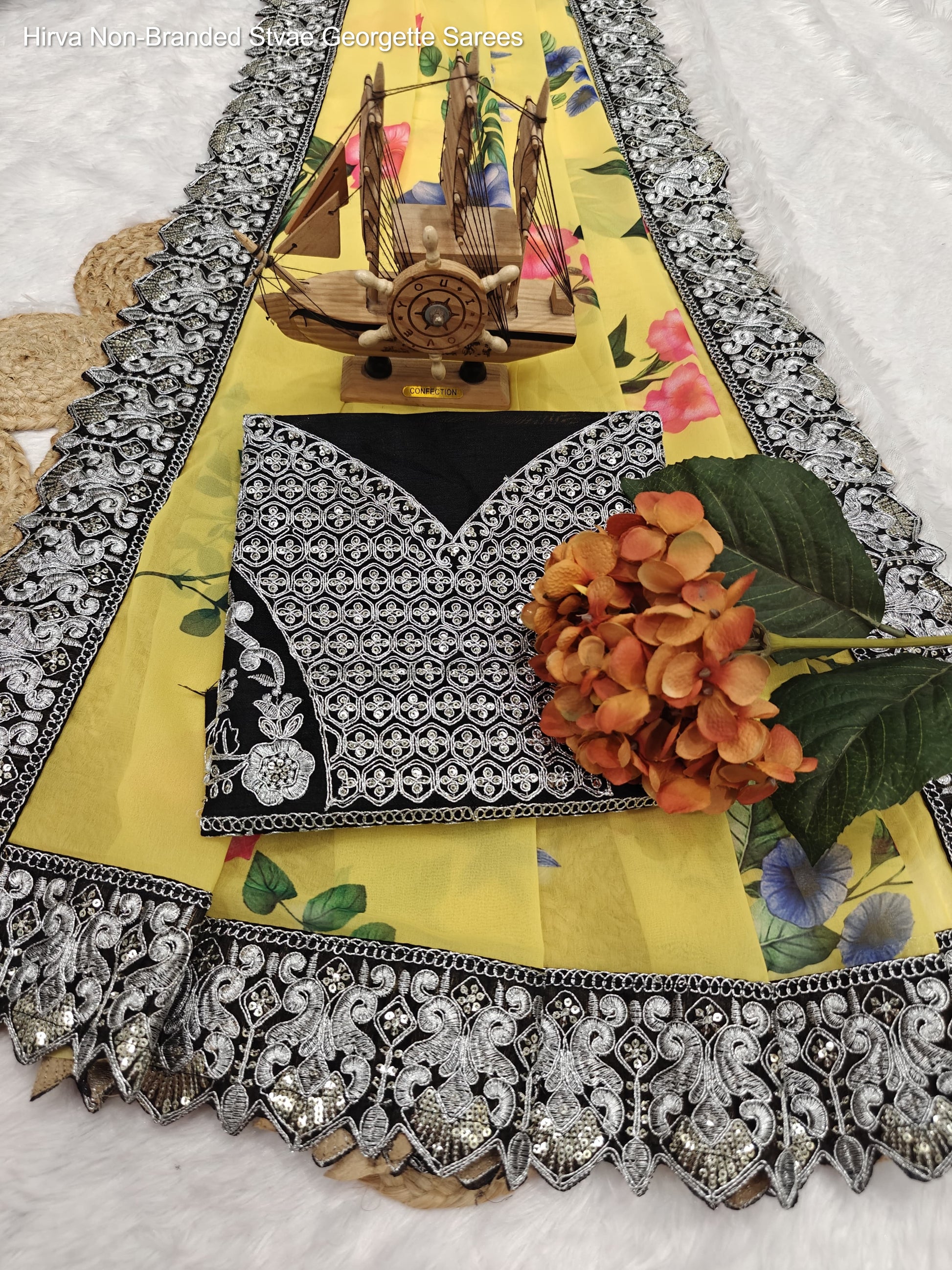 - Fabric Detail: Saree : Soft Georgette With Floral Print And Sequence Coding Work Designer Cutwork Lace Border Floral Print Oornate Border , Blouse : Full Heavy Work , Colours : Pink, Yellow, Black ,