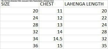 - Fabric Detail: Lehenga : Jacquard With Beautiful Weaving Design And Lace Border Round Mirror , Blouse : Full Stitch With Dori Pattern , Dupatta : Jacquard With Lace Border, Colours : Purple, Brown, Pink, Orange,Navy Blue, Magenta, Dark Green, Yellow, Peacock Blue, Size And Year : (1-2 Year ) =20, (3-4 Year) =24, (5-6 Year) =28, (7-8 Year) =32, (9-10 Year) =34, (10-12 Year ) =36