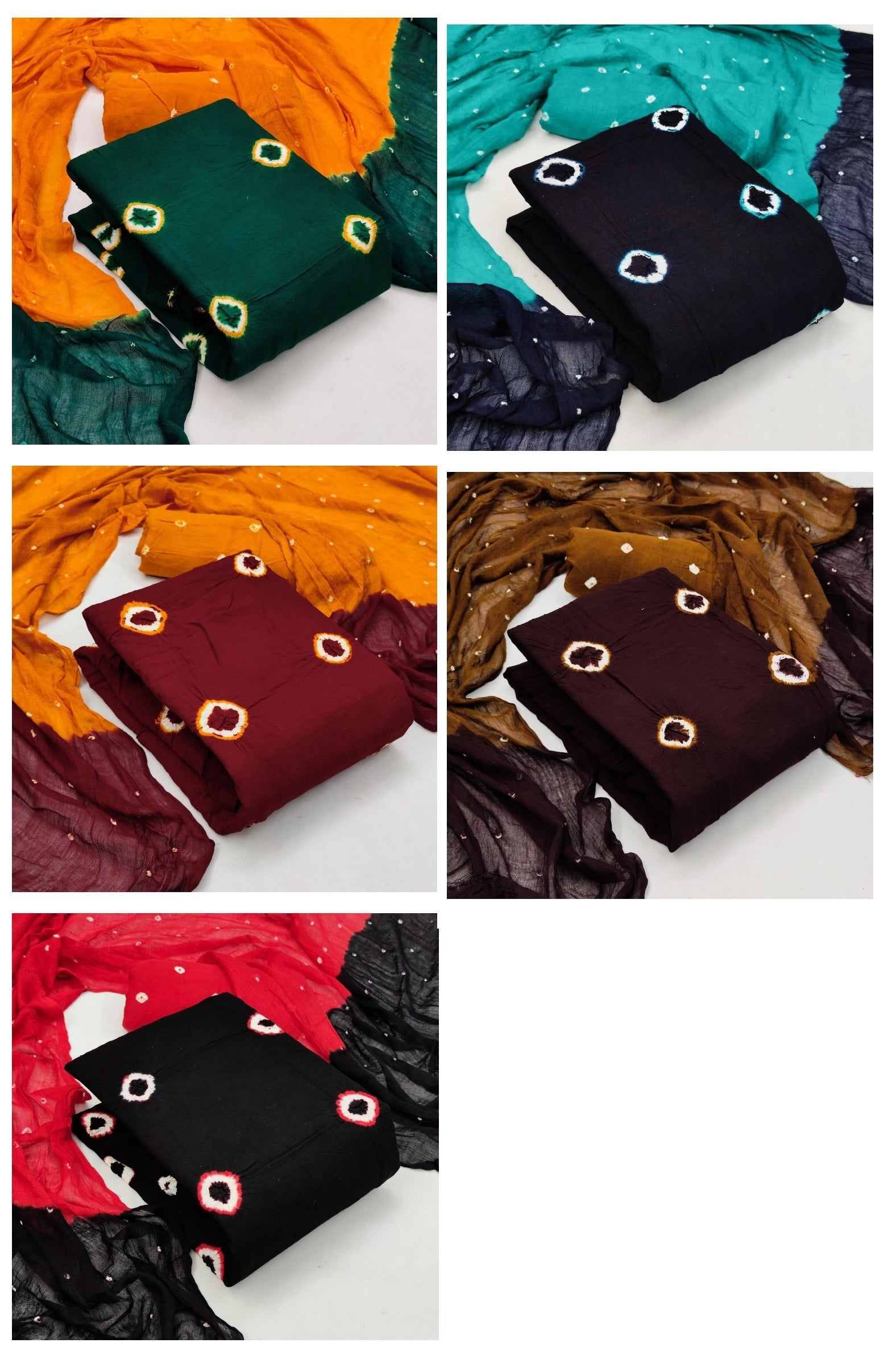 - Fabric Detail: Top : Original Potli Heavy Rayon Bandhani , Bottom : Rayon With Hand Bandhej Print, Dupatta : Rayon With Hand Bandhej Print , Colours : Coffee, Green, Red,Maroon, Sky