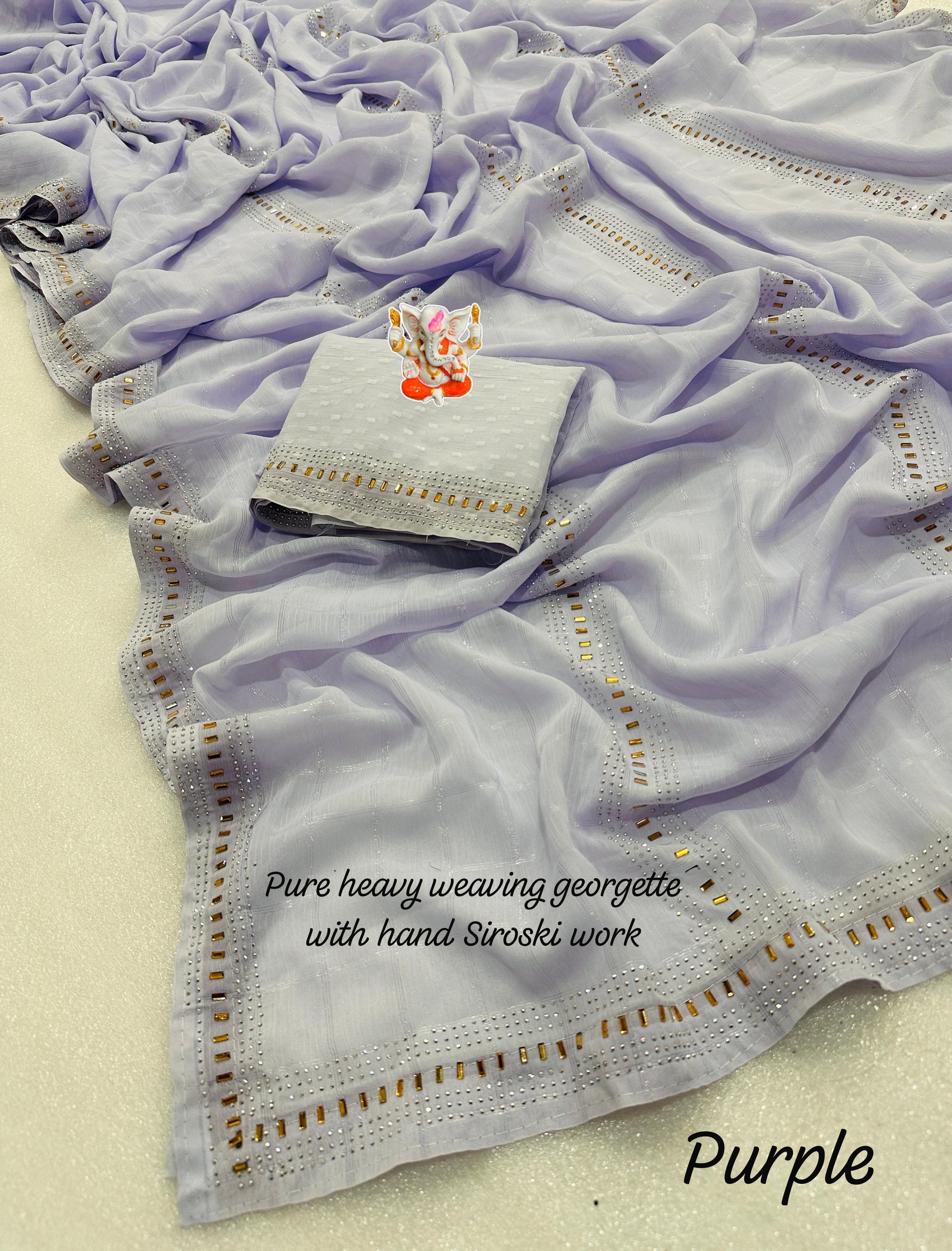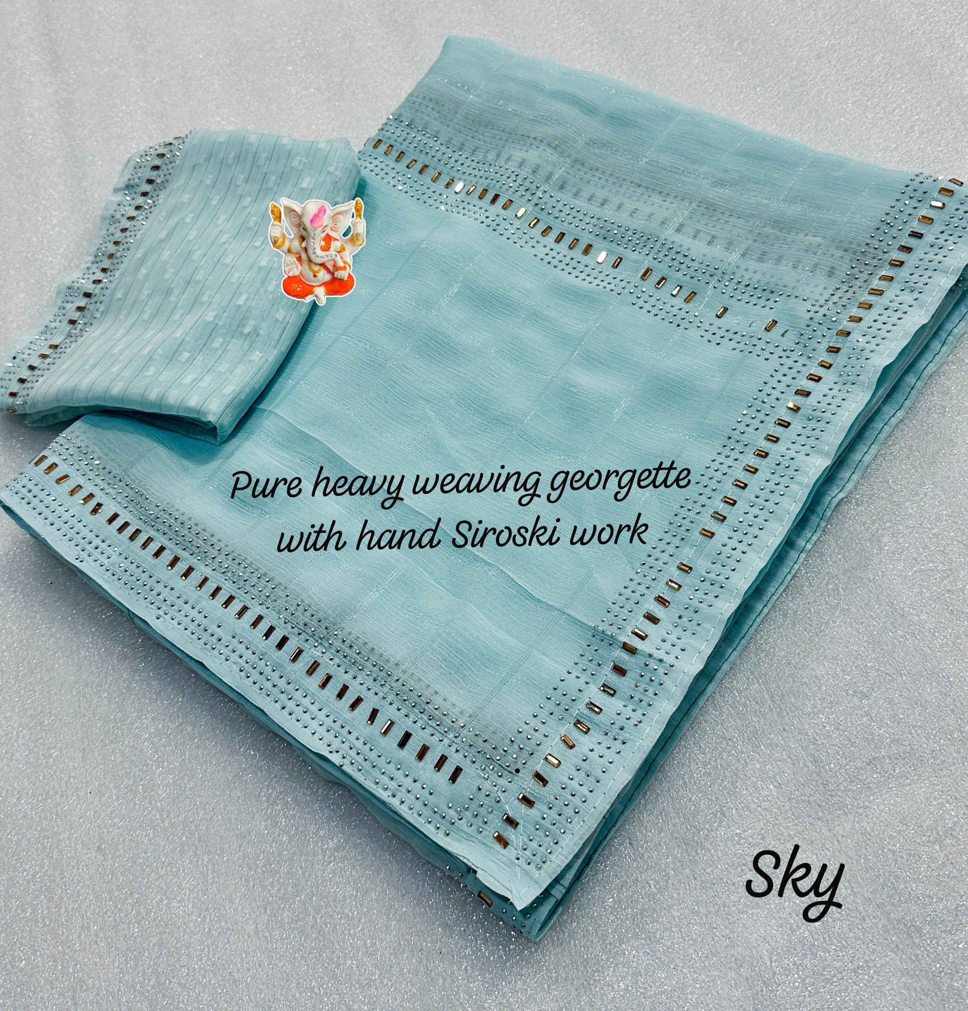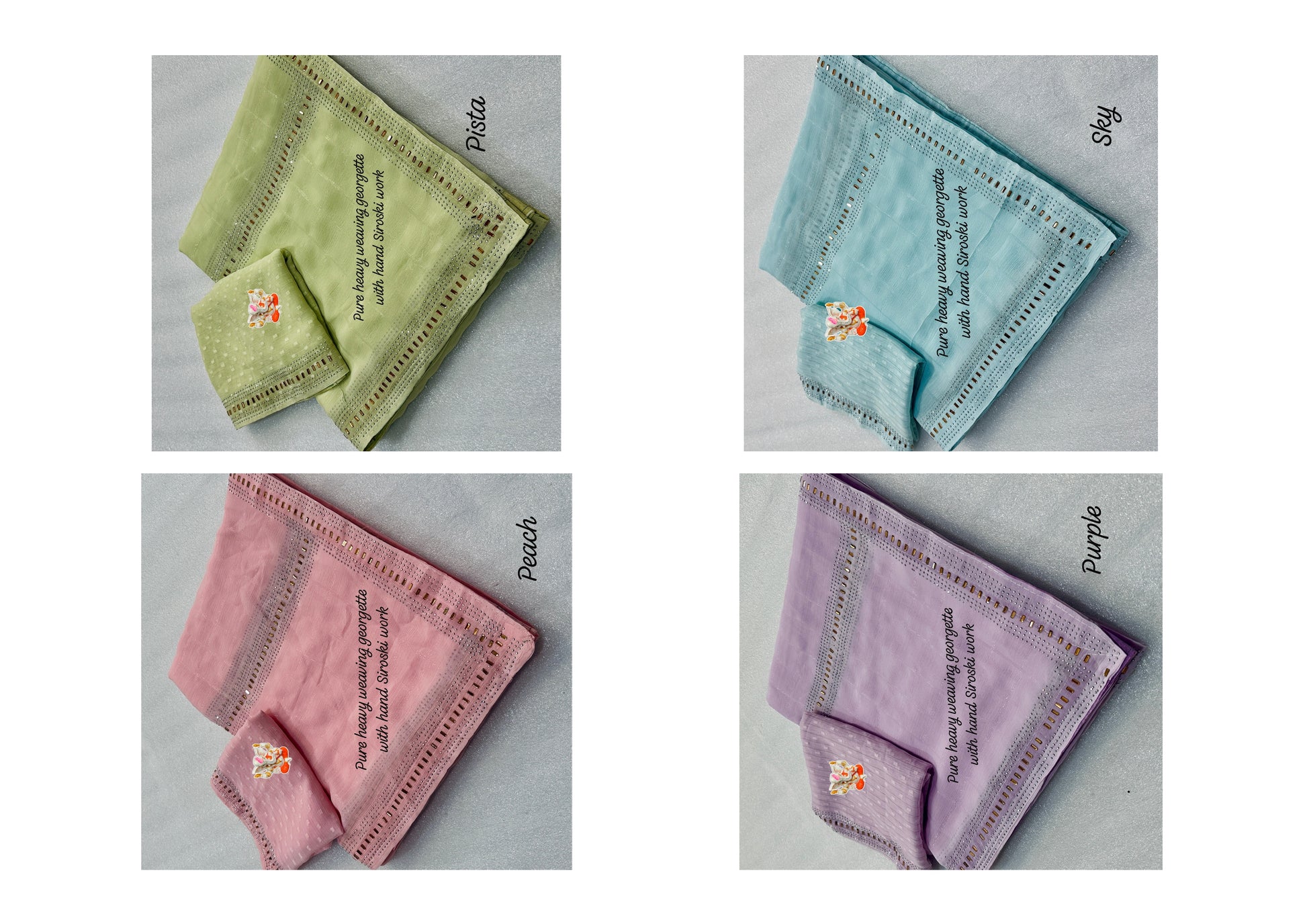 - Fabric Detail: Saree : Pure Georgette Weaving Jari Chex With Full Heavy Siroski C.Pallu , Blouse : Pure Geor1000 Butti With Siroski Work, Color : Sky,Peach,Purple,Pista,Onion,