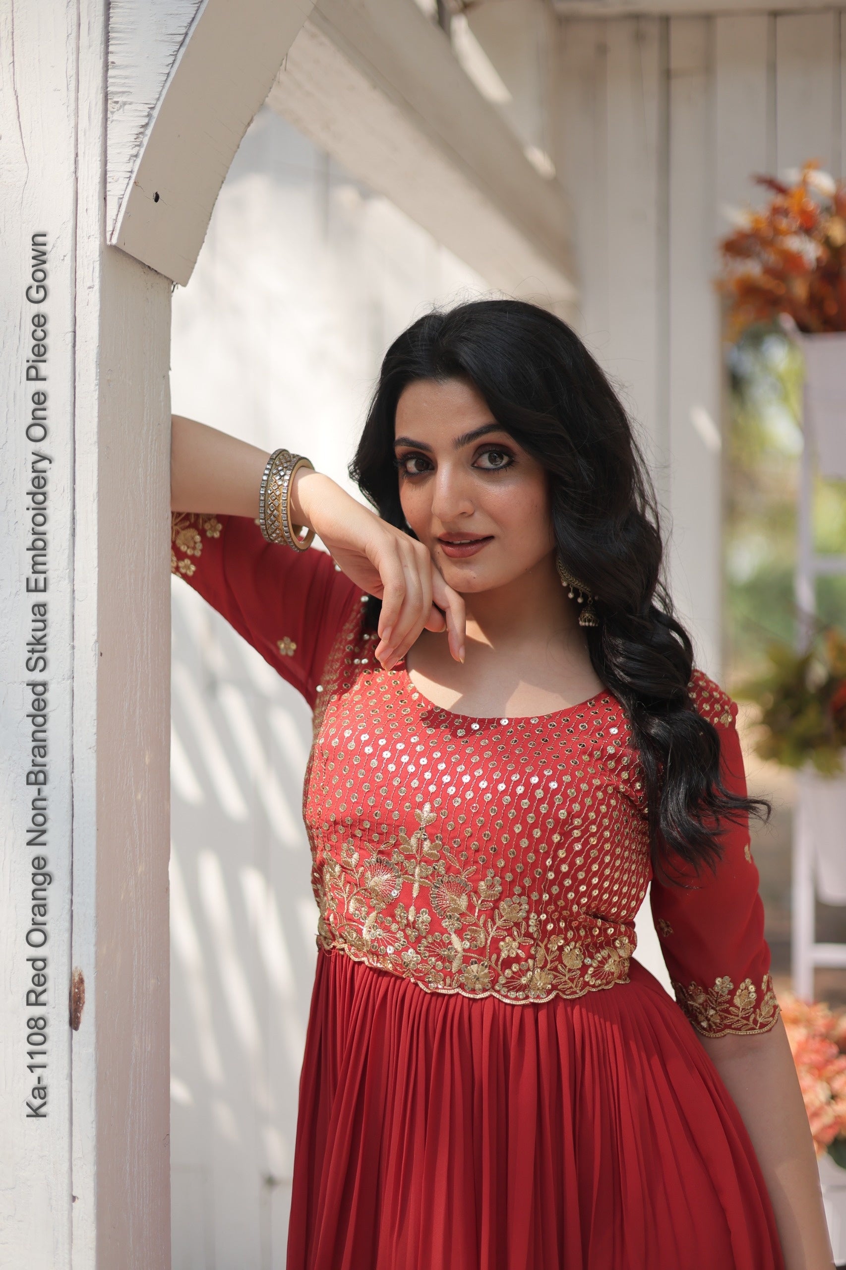- Ka-1108 Red Orange Non-Branded Stkua Embroidery One Piece Gown Dealer Ahmedabad Surat Wholesale Gujarat India Lowest Price Best Quality Buy Purchase Shipping Kurta Salwaar Kameez Also free Cash on delivery
