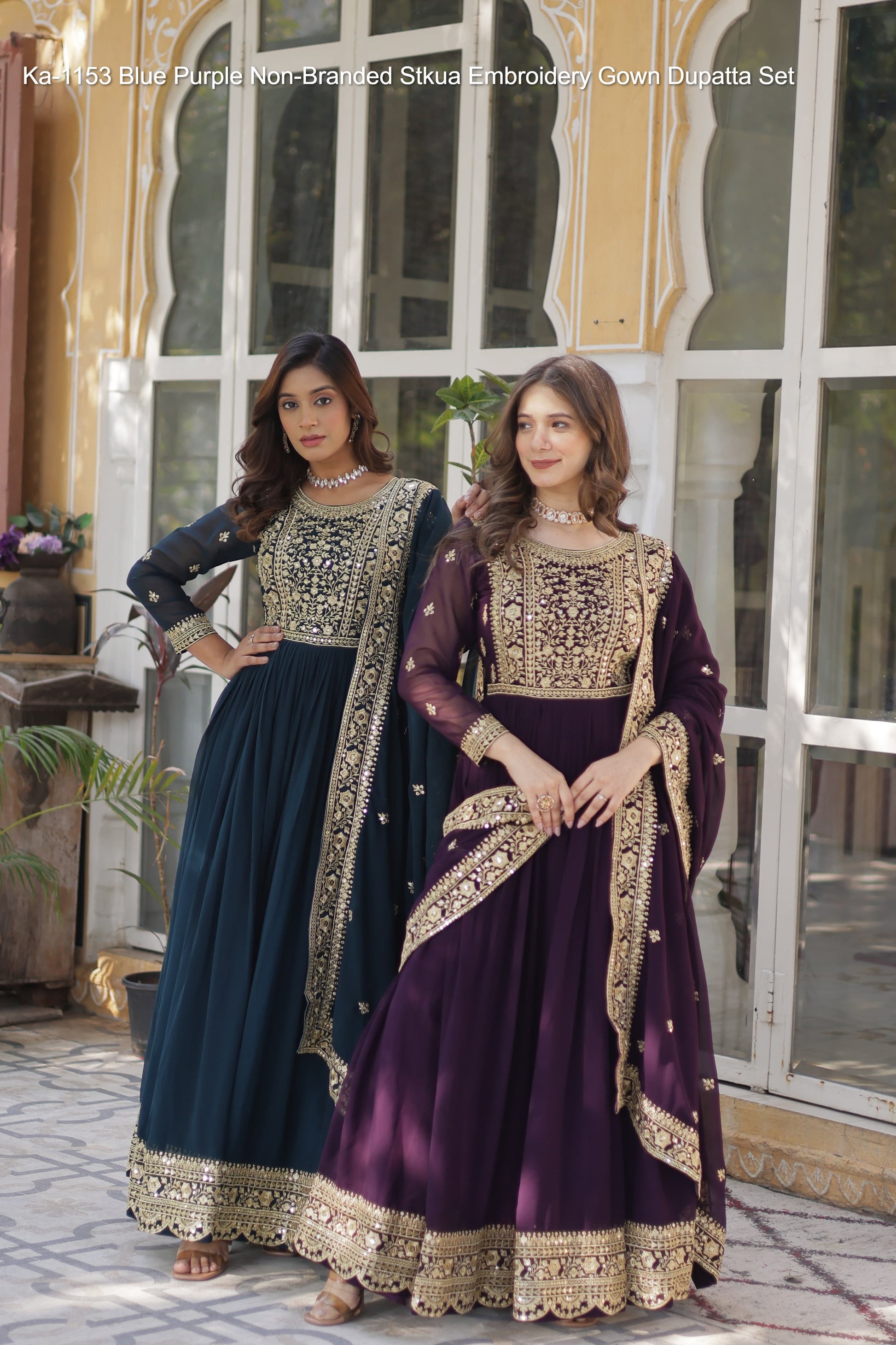 Ka-1153 Blue Purple Non-Branded Stkua Embroidery Gown Dupatta Set
