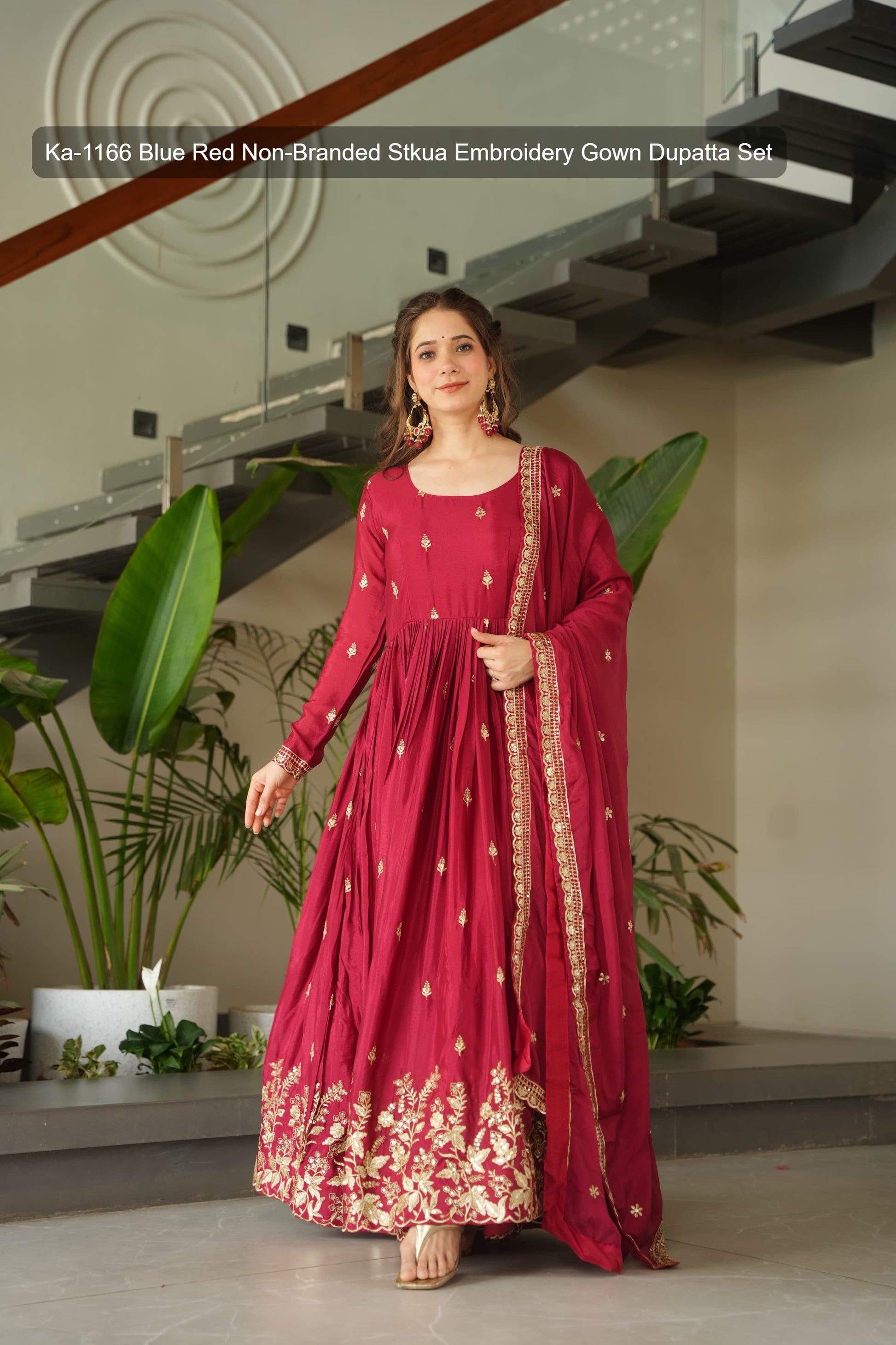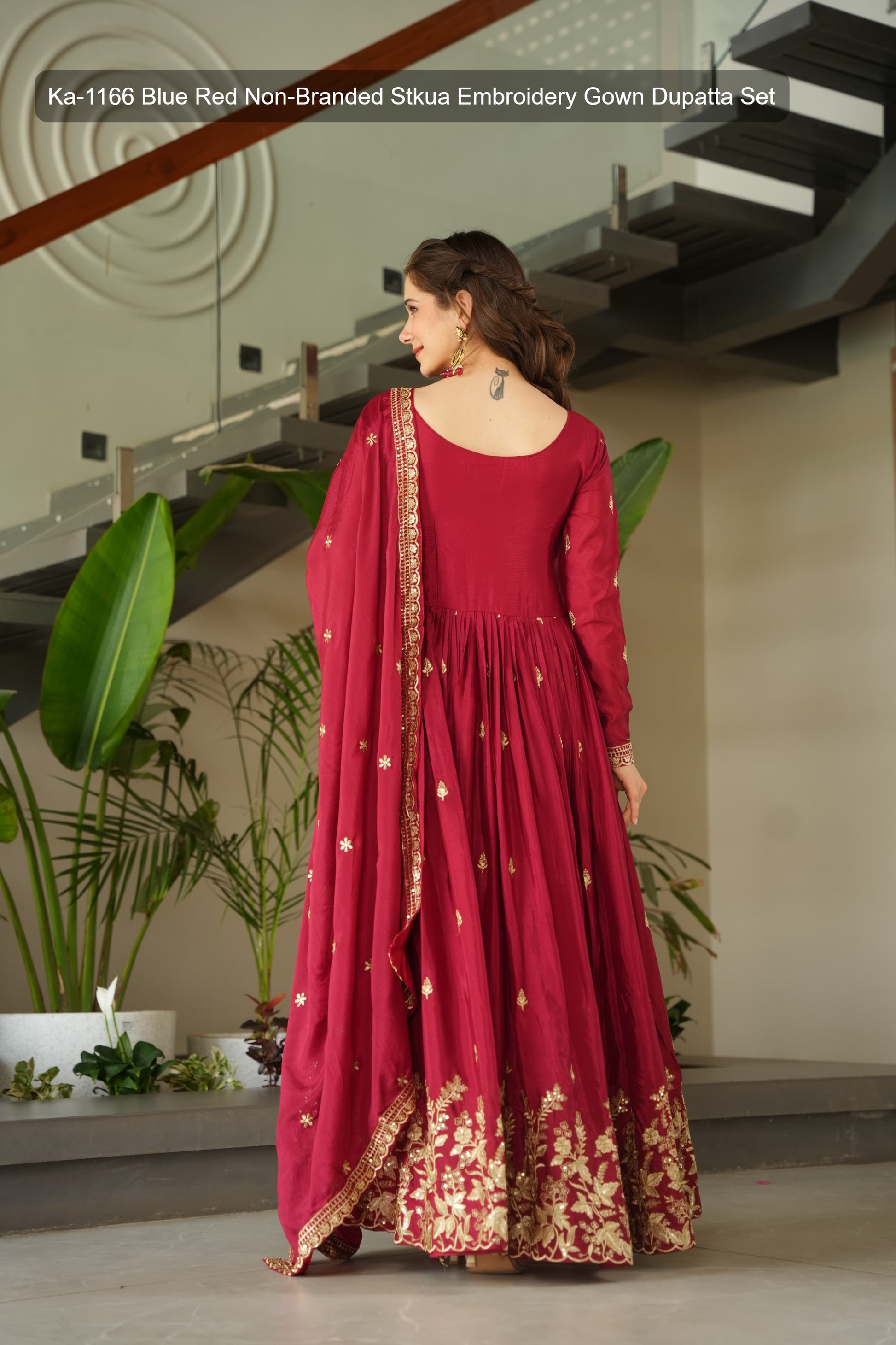 Ka-1166 Blue Red Non-Branded Stkua Embroidery Gown Dupatta Set