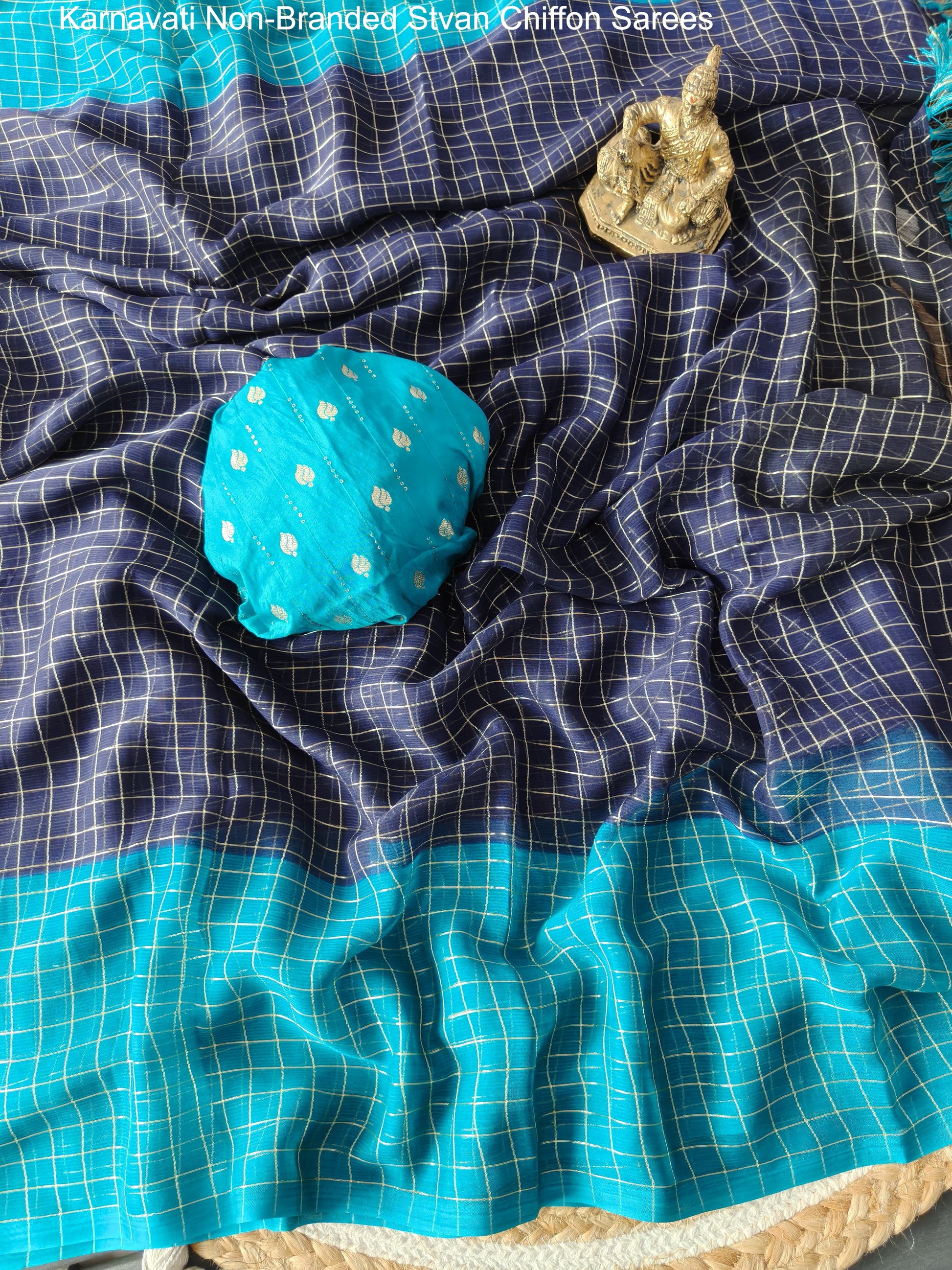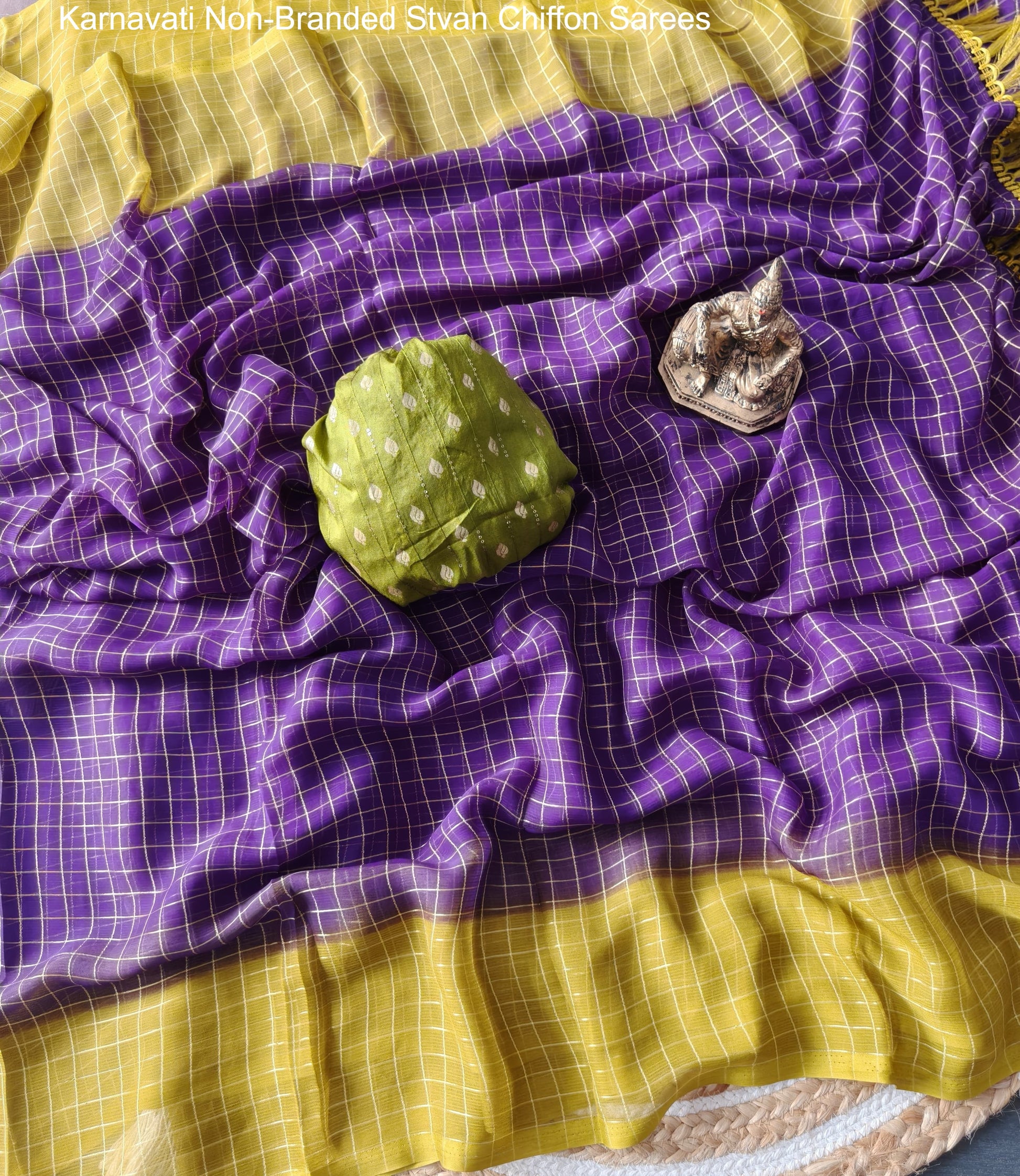 - Fabric Detail: Saree : Heavy Shine Chiffon With Zari Woven Chex Pattern All Over Checkered Or Plaid Design Color-Blocked Stripe, Blouse : Perfectly Matched Viscose Sequence Zari Butti Piece , Colours : (Yellow-Green), (Purple-Yellow), (Grey-Blue), (Pink-Blue), (Teal-Blue), (Red-Blue),