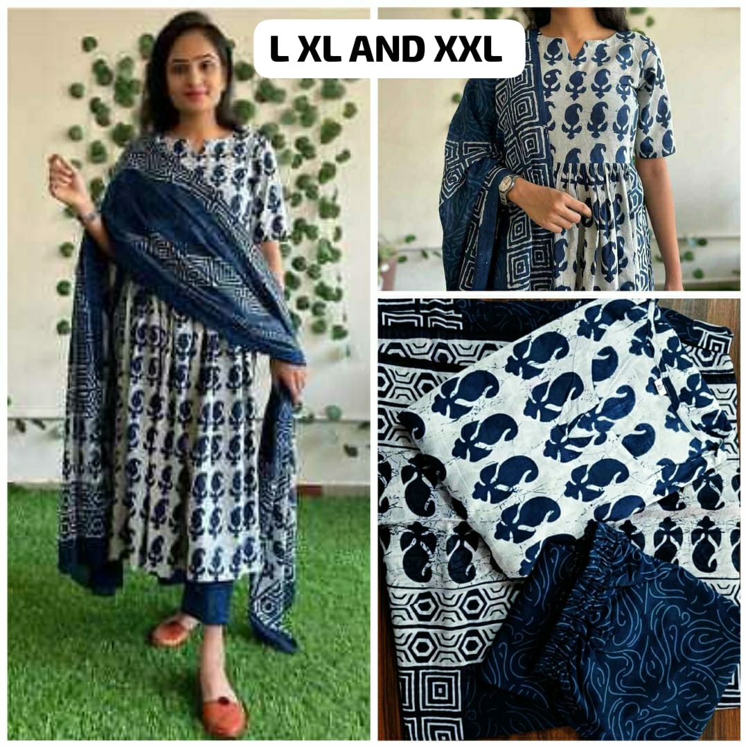 - Fabric Detail: Top : Rayon Cotton With Indigo Prints Full Stitched Readymade Wash First Time Dry Clean , Bottom : Rayon Cotton With Print , Dupatta : Cotton With Prints , Size : L, Xl, 2Xl