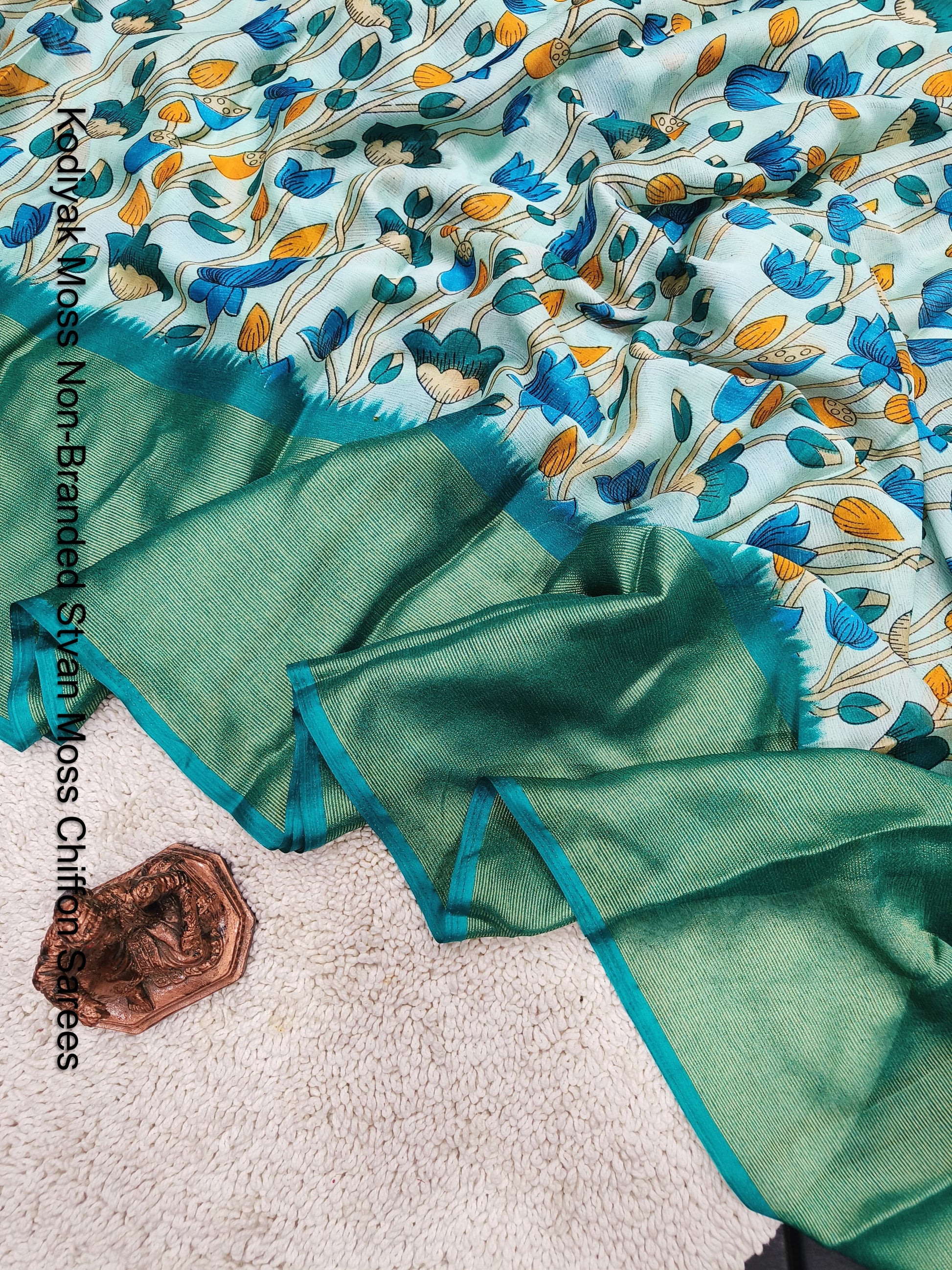 - Fabric Detail: Saree : Moss Chiffon Floral Kalamkari Print And Golden Pattu Kodiyark Border All Over Attached With Perfectly Matched Pallu,Length : 6.30Mts Apx,, Blouse : Chiffon Matched Pallu, ,