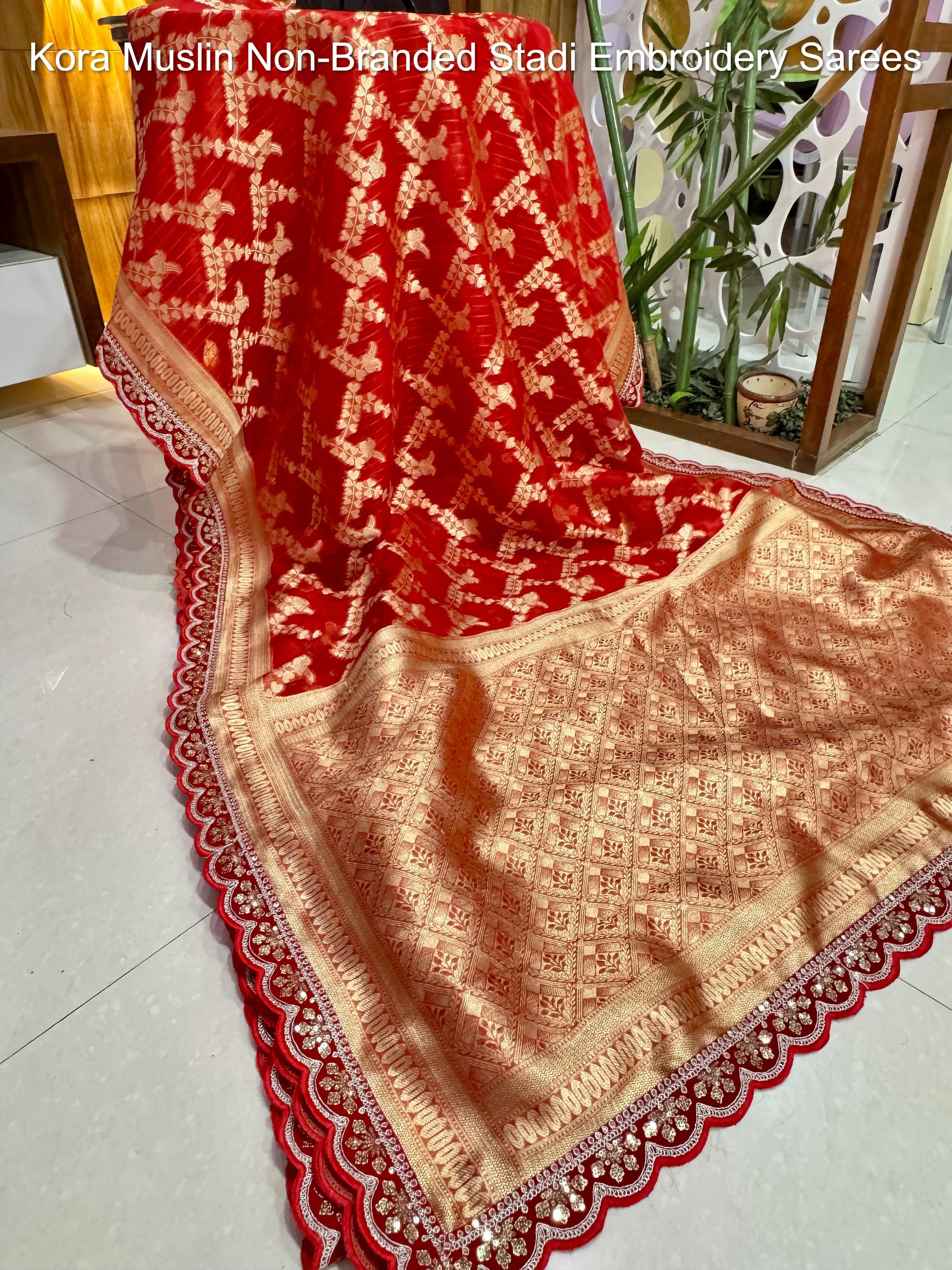 Kora Muslin Non-Branded Stadi Embroidery Sarees