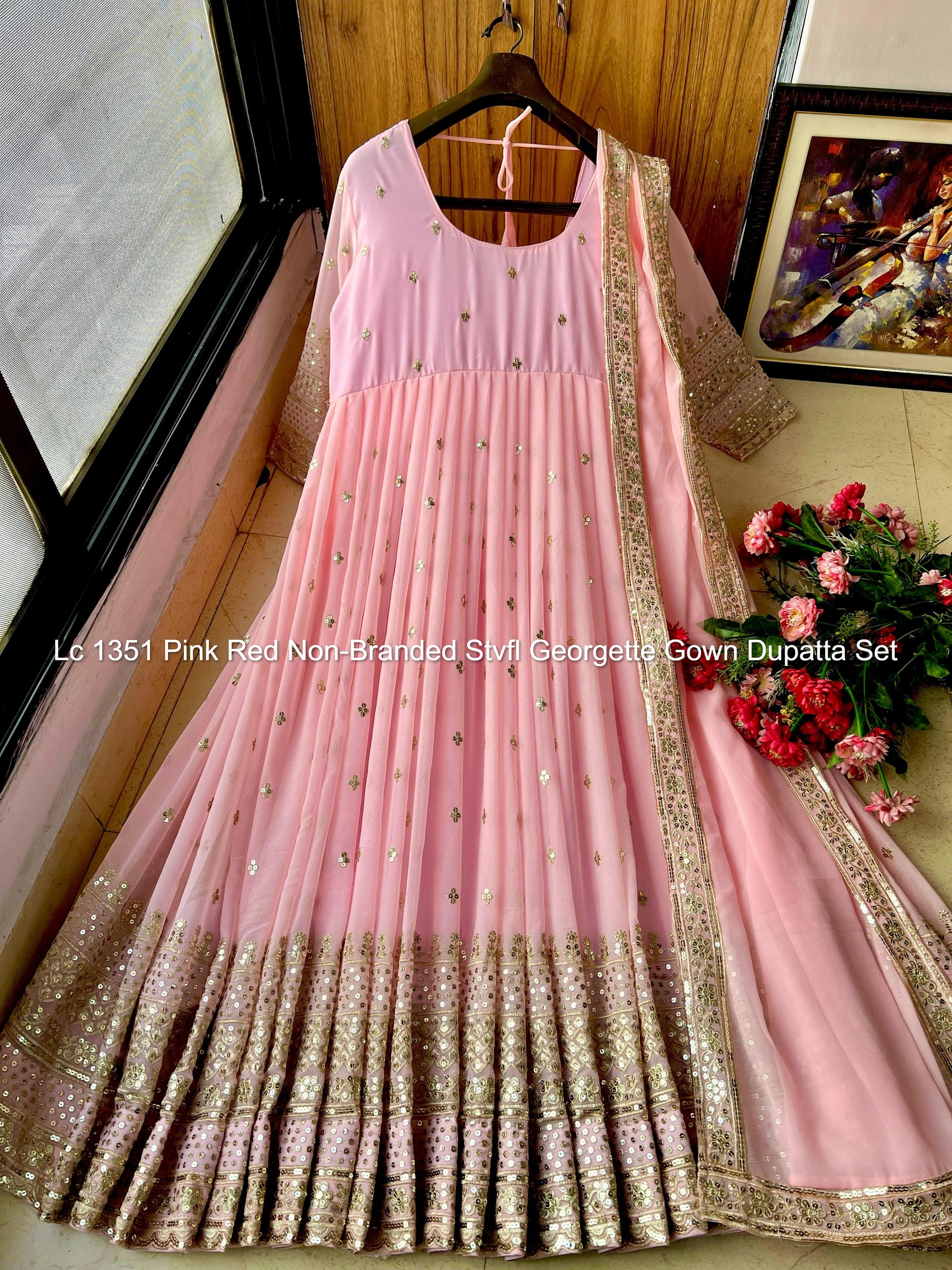 - Lc 1351 Pink Red Non-Branded Stvfl Georgette Gown Dupatta Set Dealer Ahmedabad Surat Wholesale Gujarat India Lowest Price Best Quality Buy Purchase Shipping Kurta Salwaar Kameez Also free Cash on delivery