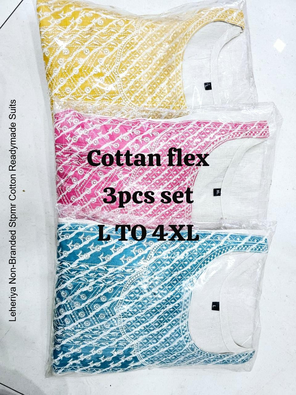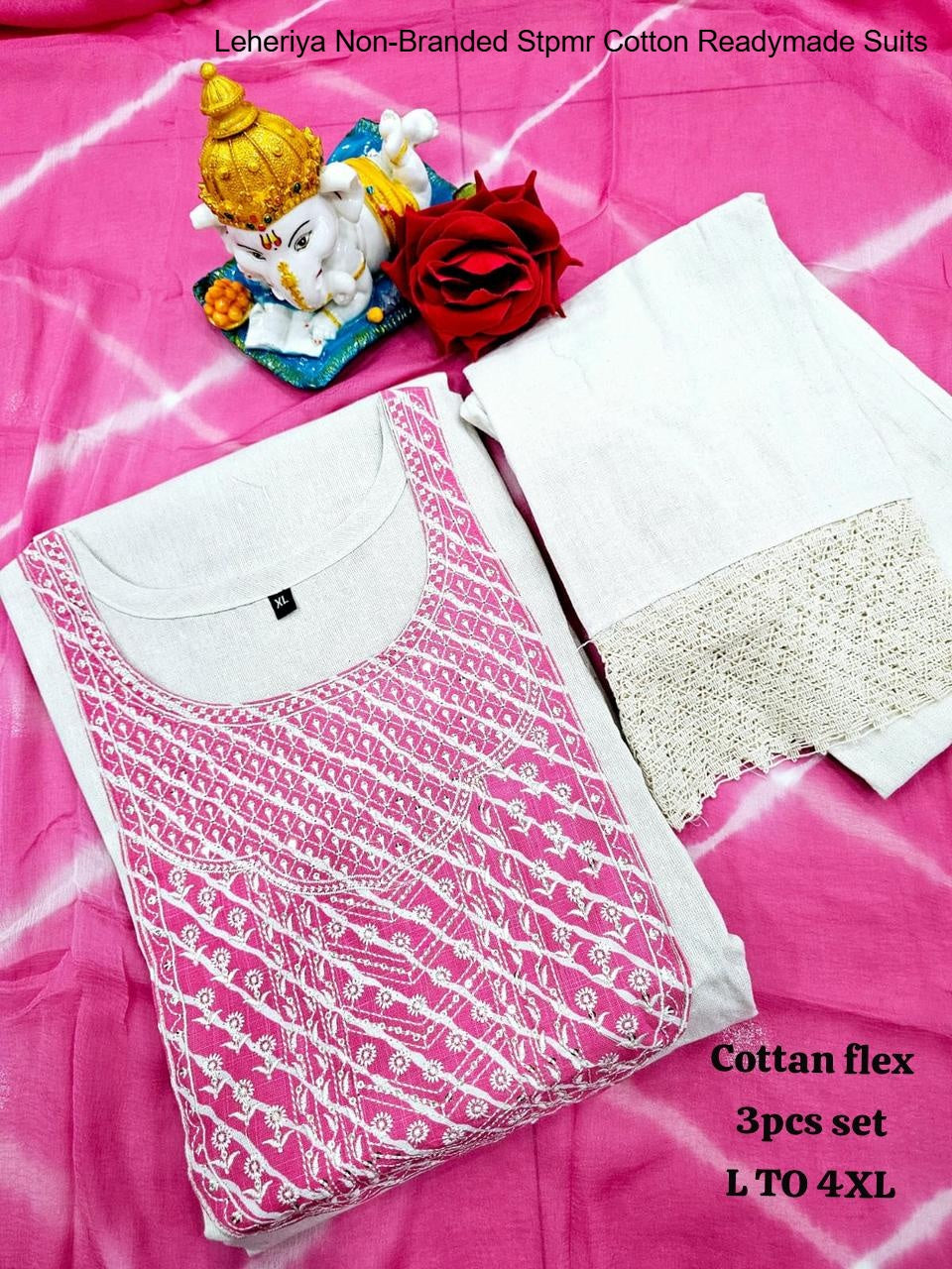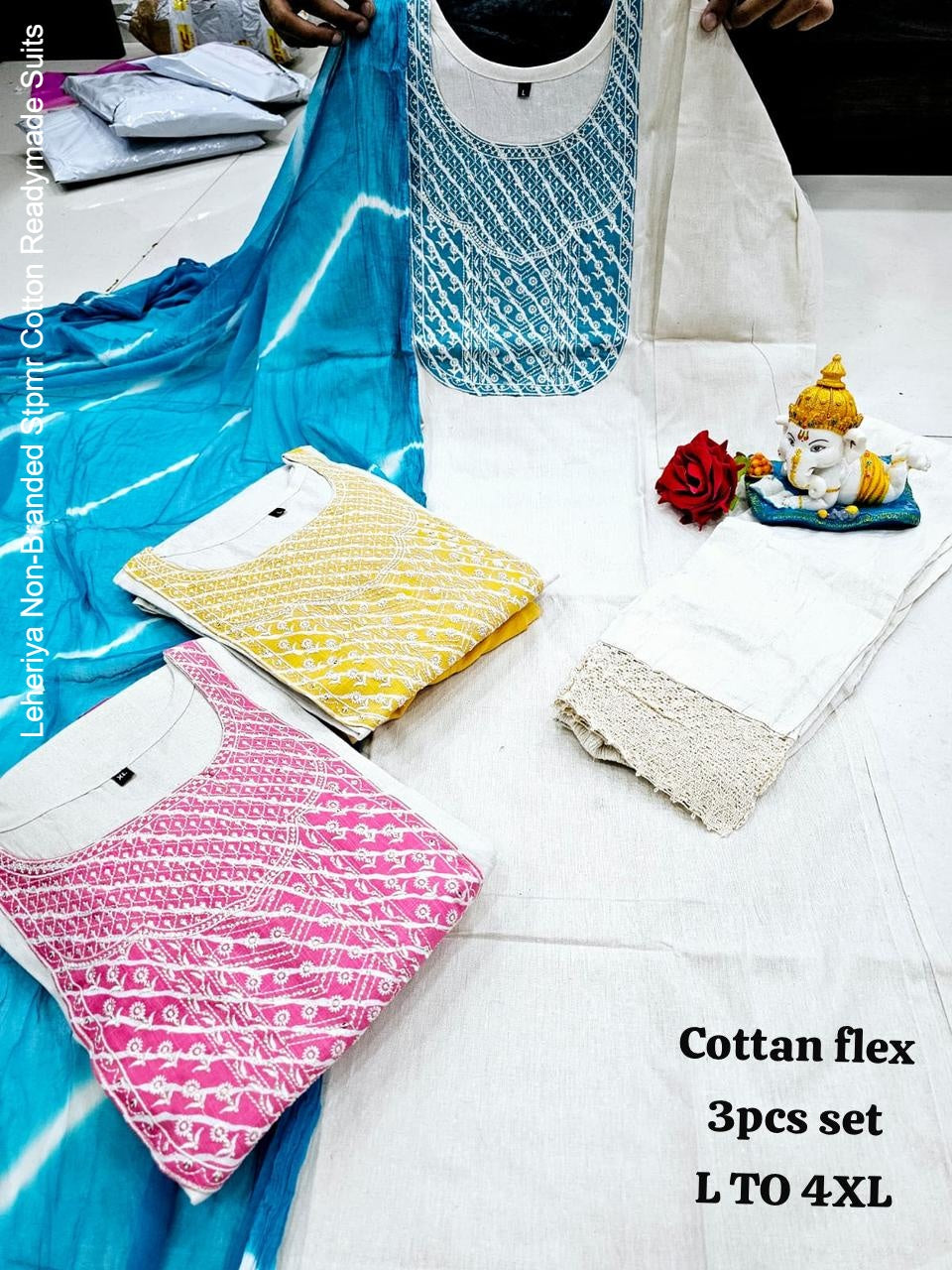 - Fabric Detail: Top : Cotton Flex With Embroidered Yoke Fully Stitched , Bottom : Cotton Flex With Lace In Border , Dupatta : Nazneen Leheriya, Colours : Pink, Sky, Yellow, Size : L, Xl, 2Xl, 3Xl, 4Xl