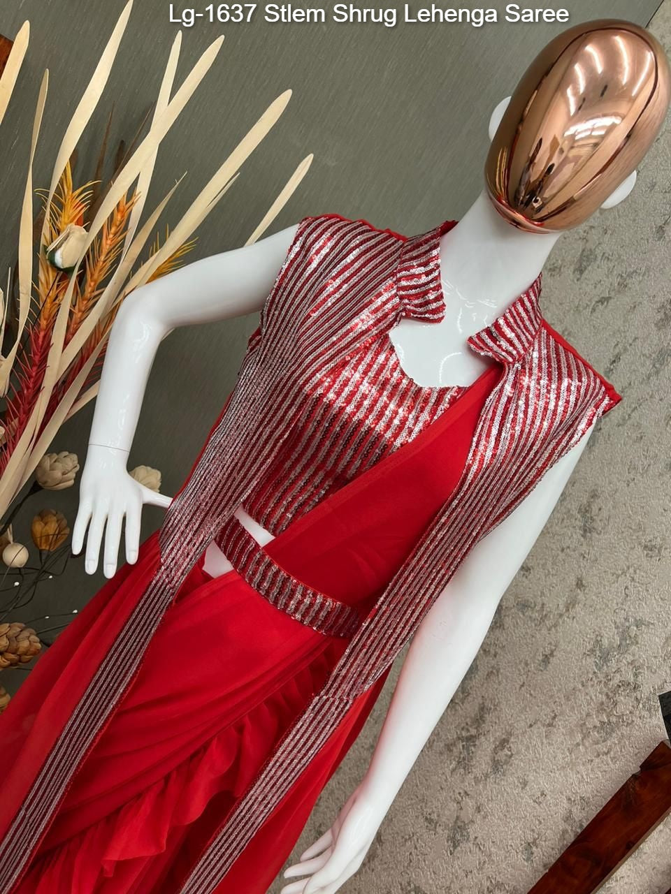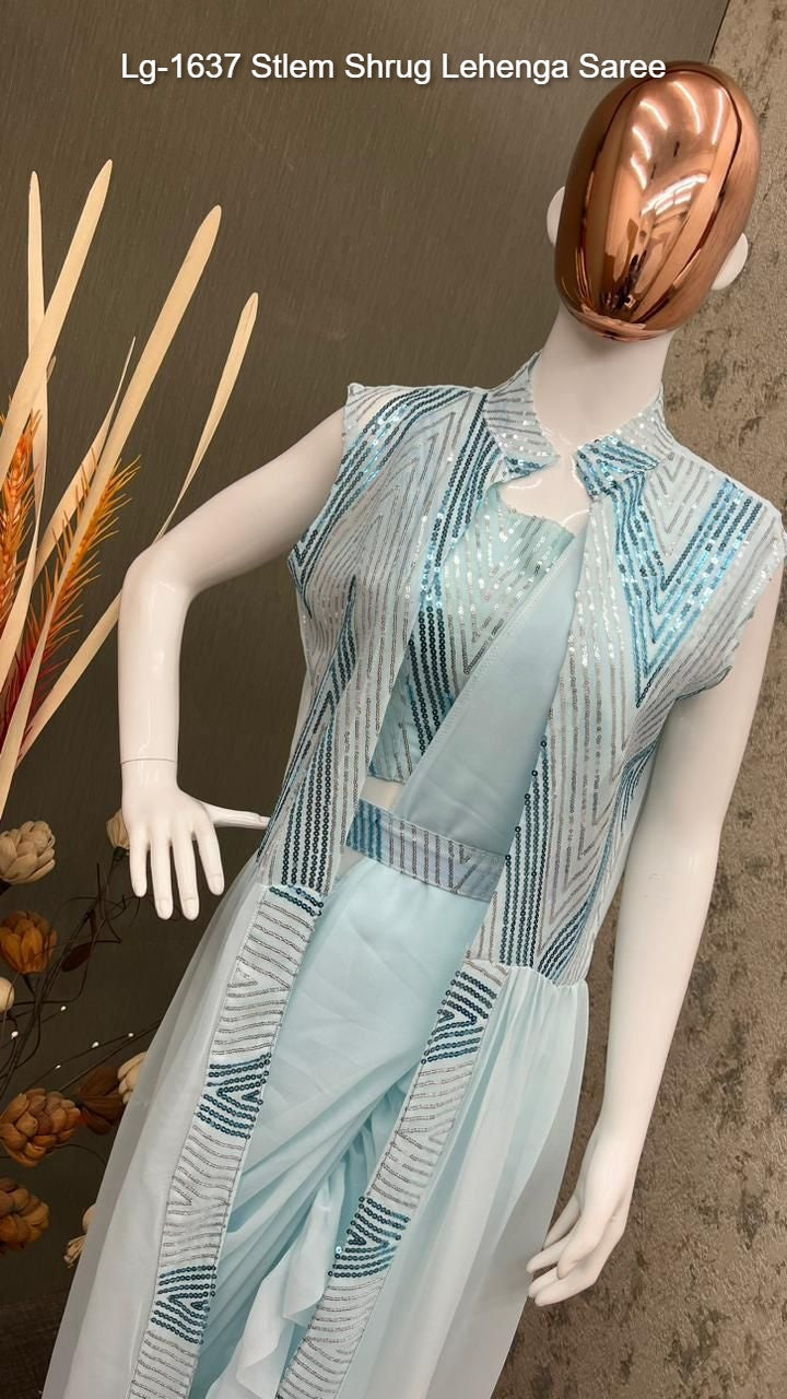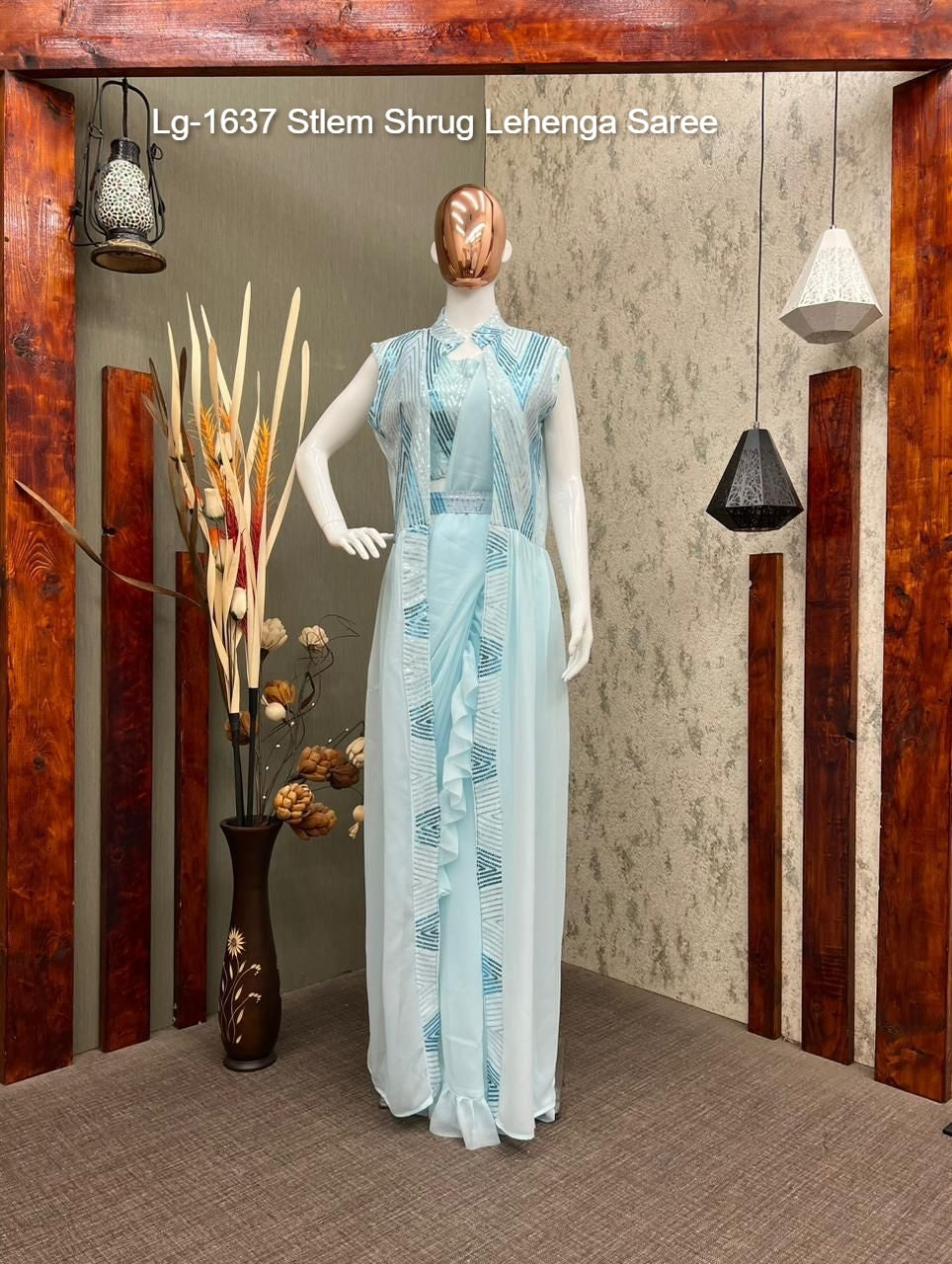 - Fabric Detail: Lehenga Saree : Georgette With Ruffle Sequence Work Belt Also, Length : 5.5 Mtr , Blouse : Georgette With Sequence Embroidery Work,Cut : 0.80 Mtr Unstitched , Shrug : Georgette Koti With Sequence Embroidered Work All Over The Koti Fullstitched Freesize, Length : 57 Apx,