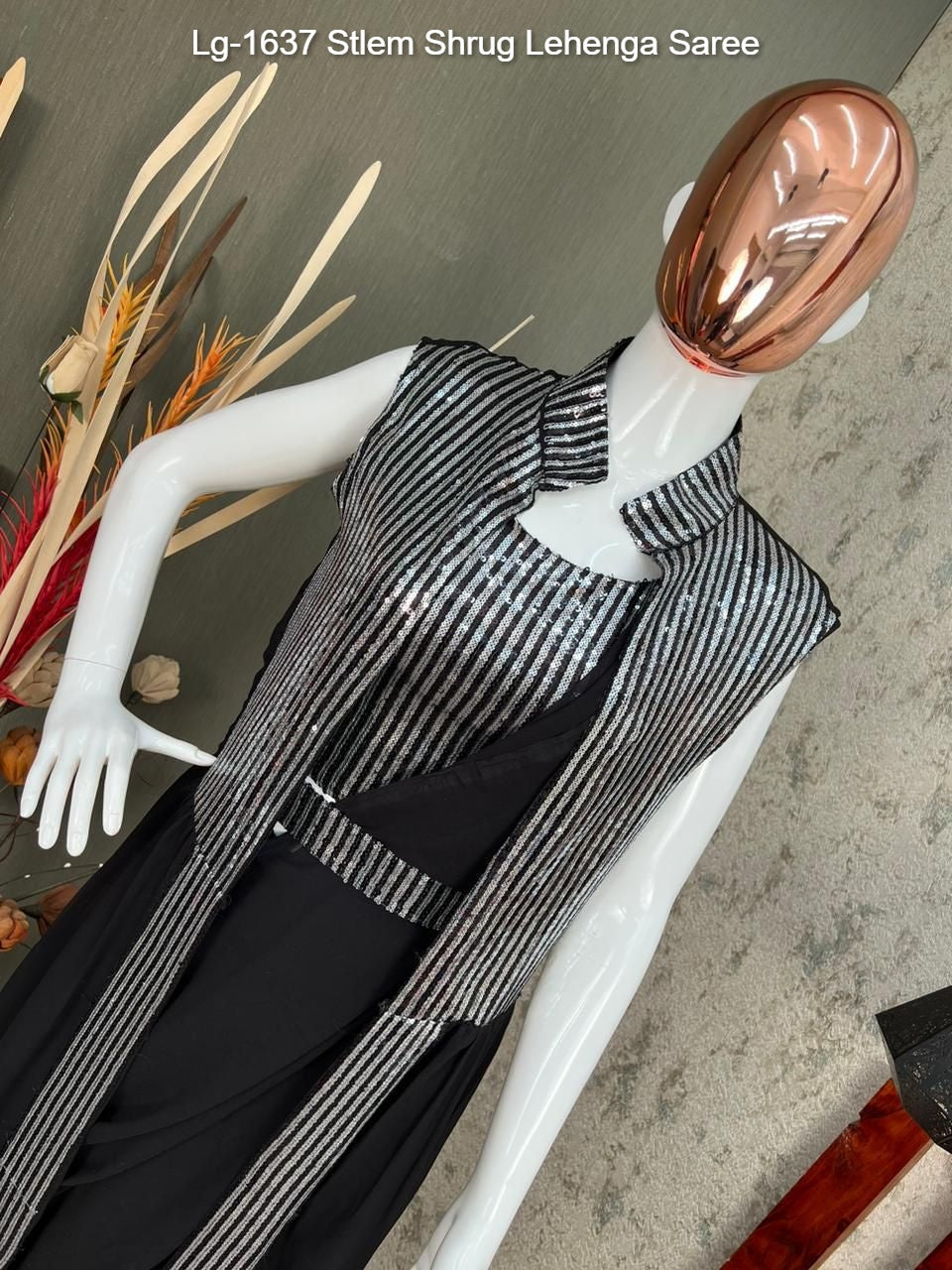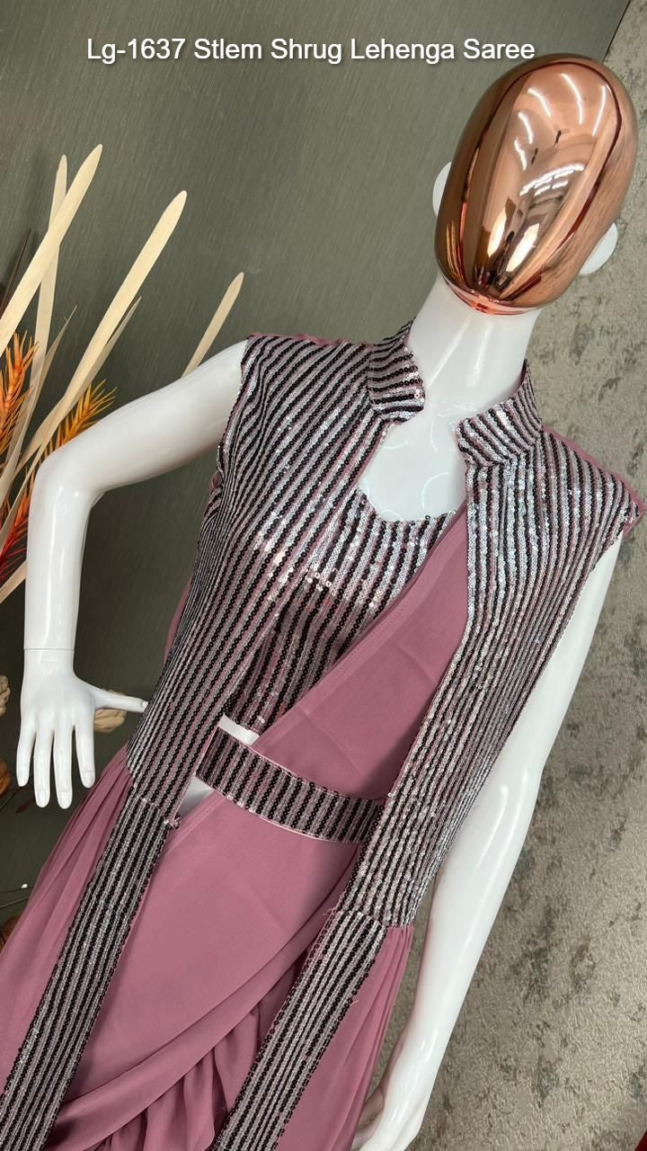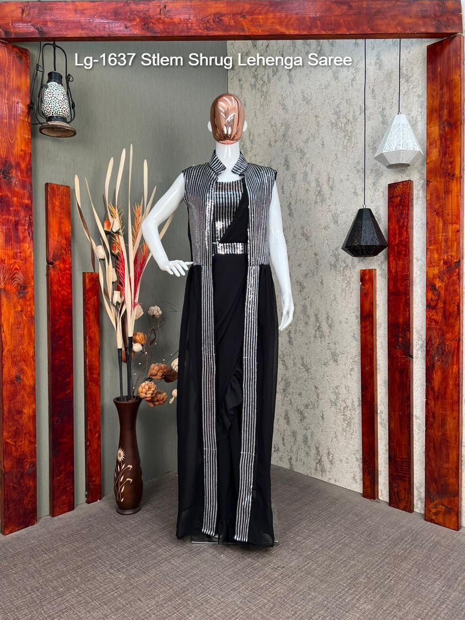 - Fabric Detail: Lehenga Saree : Georgette With Ruffle Sequence Work Belt Also, Length : 5.5 Mtr , Blouse : Georgette With Sequence Embroidery Work,Cut : 0.80 Mtr Unstitched , Shrug : Georgette Koti With Sequence Embroidered Work All Over The Koti Fullstitched Freesize, Length : 57 Apx,