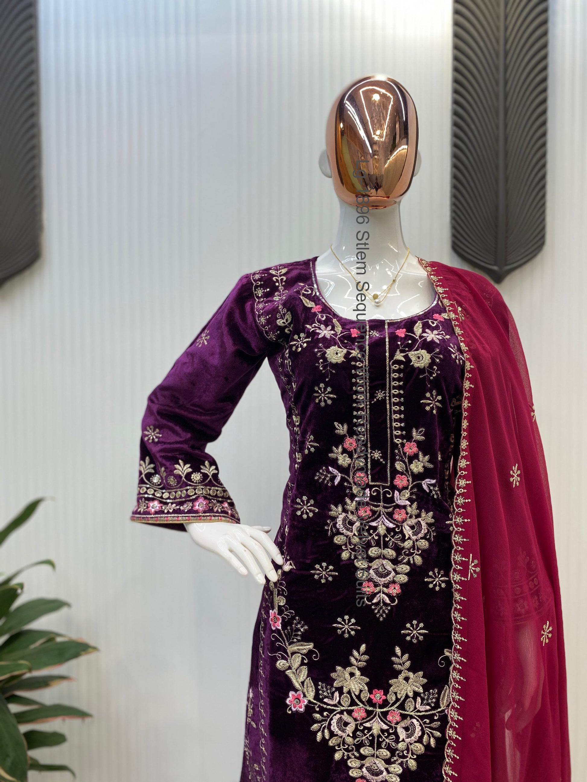 - Fabric Detail: Top : Velvet Embroidery Sequence Work Fancy Sleeves On Work, Length : 49 Apx, Inner : Micro , Bottom : Santoon Full Stitched Free Size, Length : 40 Apx, Dupatta : Georgette Embroidery Sequence Work Border Both Side, Size : M, L, Xl, 2Xl