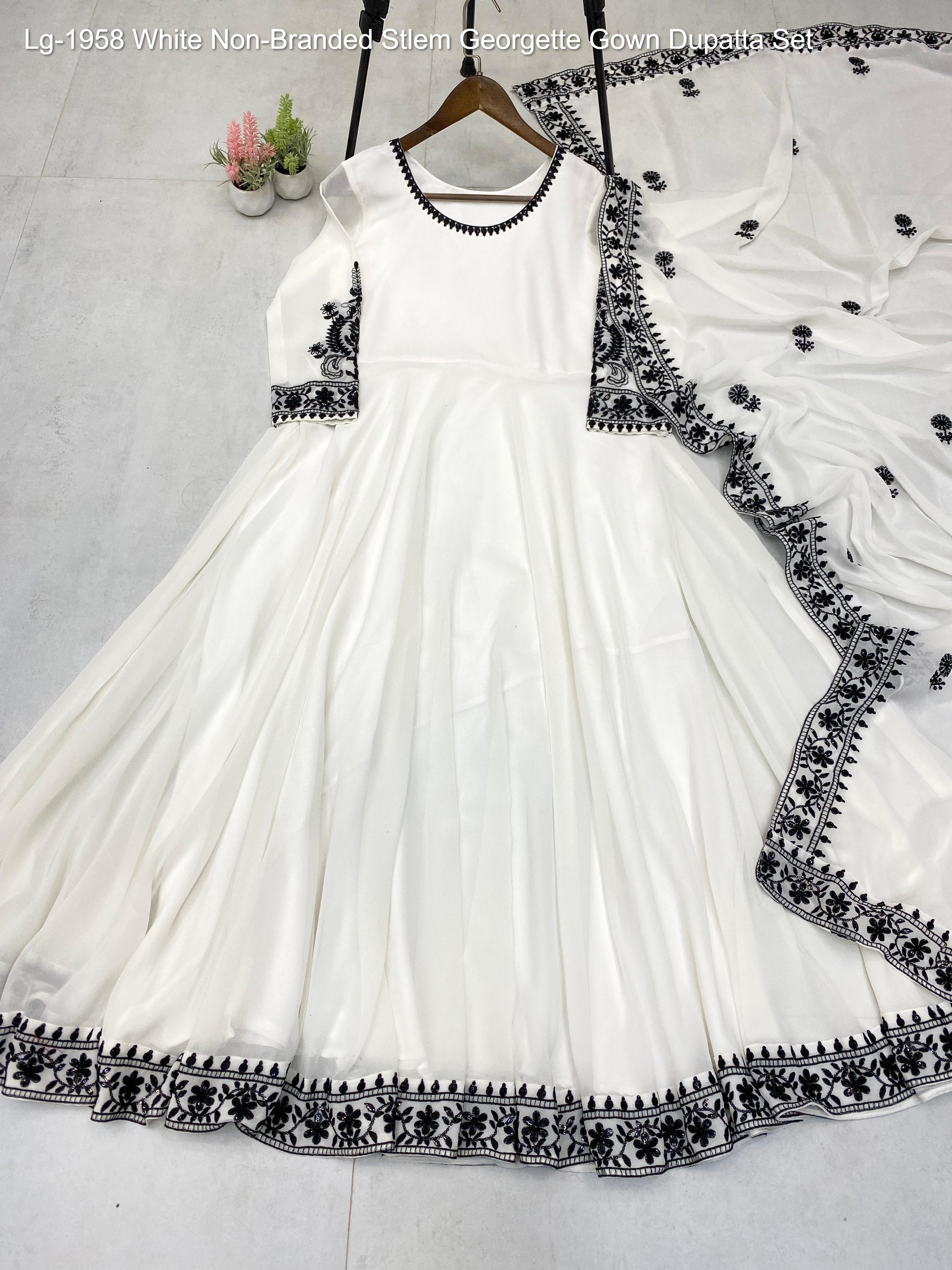 - Lg-1958 White Non-Branded Stlem Georgette Gown Dupatta Set Dealer Ahmedabad Surat Wholesale Gujarat India Lowest Price Best Quality Buy Purchase Shipping Kurta Salwaar Kameez Also free Cash on delivery