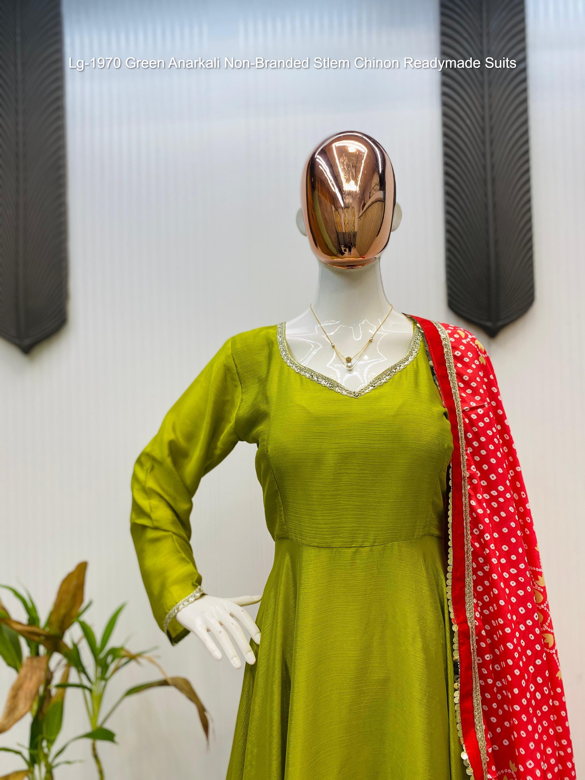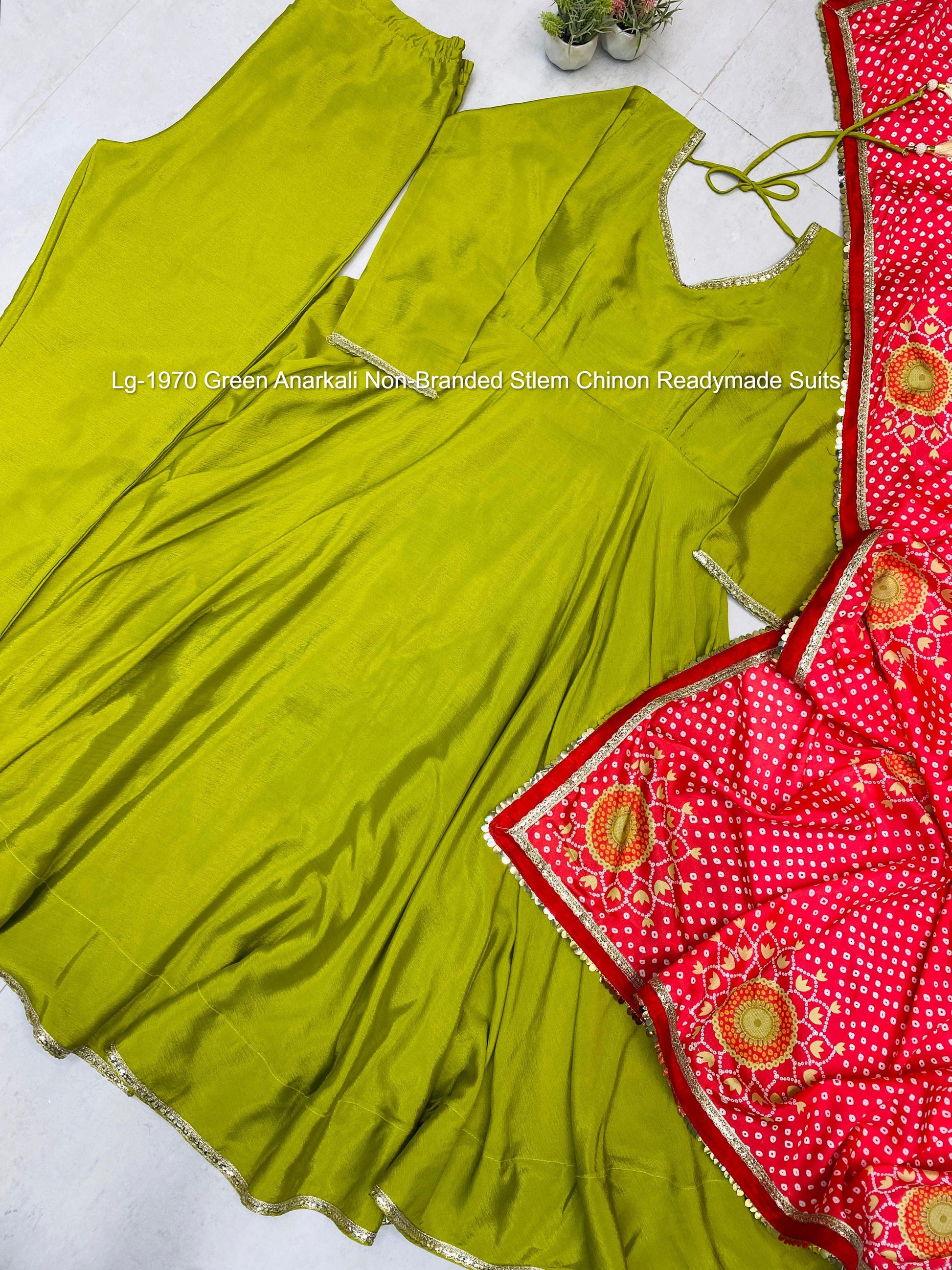 Lg-1970 Green Anarkali Non-Branded Stlem Chinon Readymade Suits
