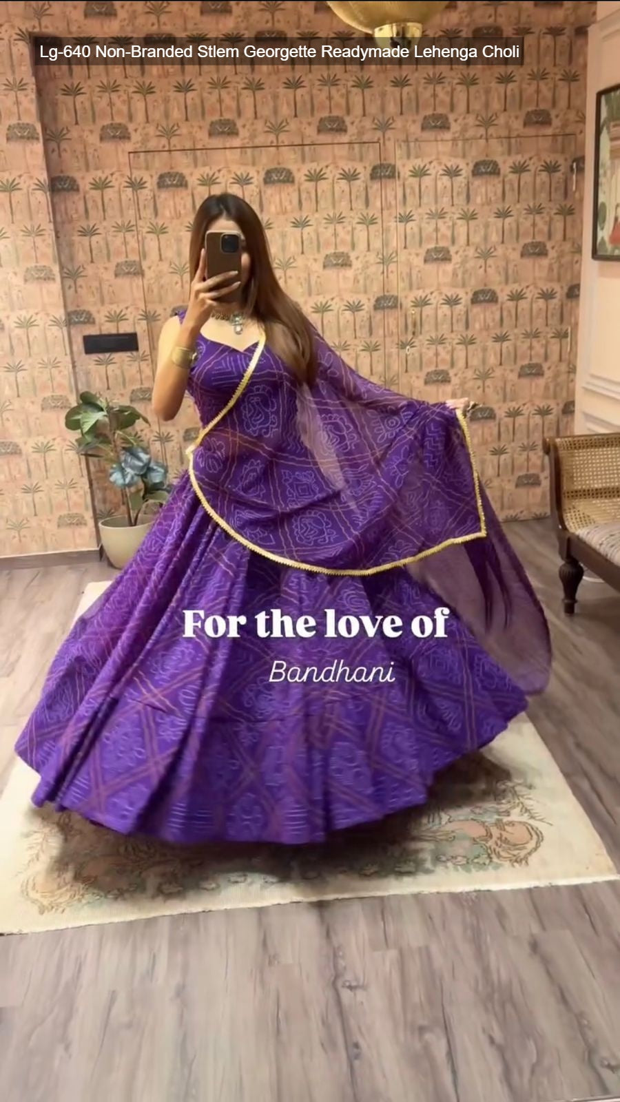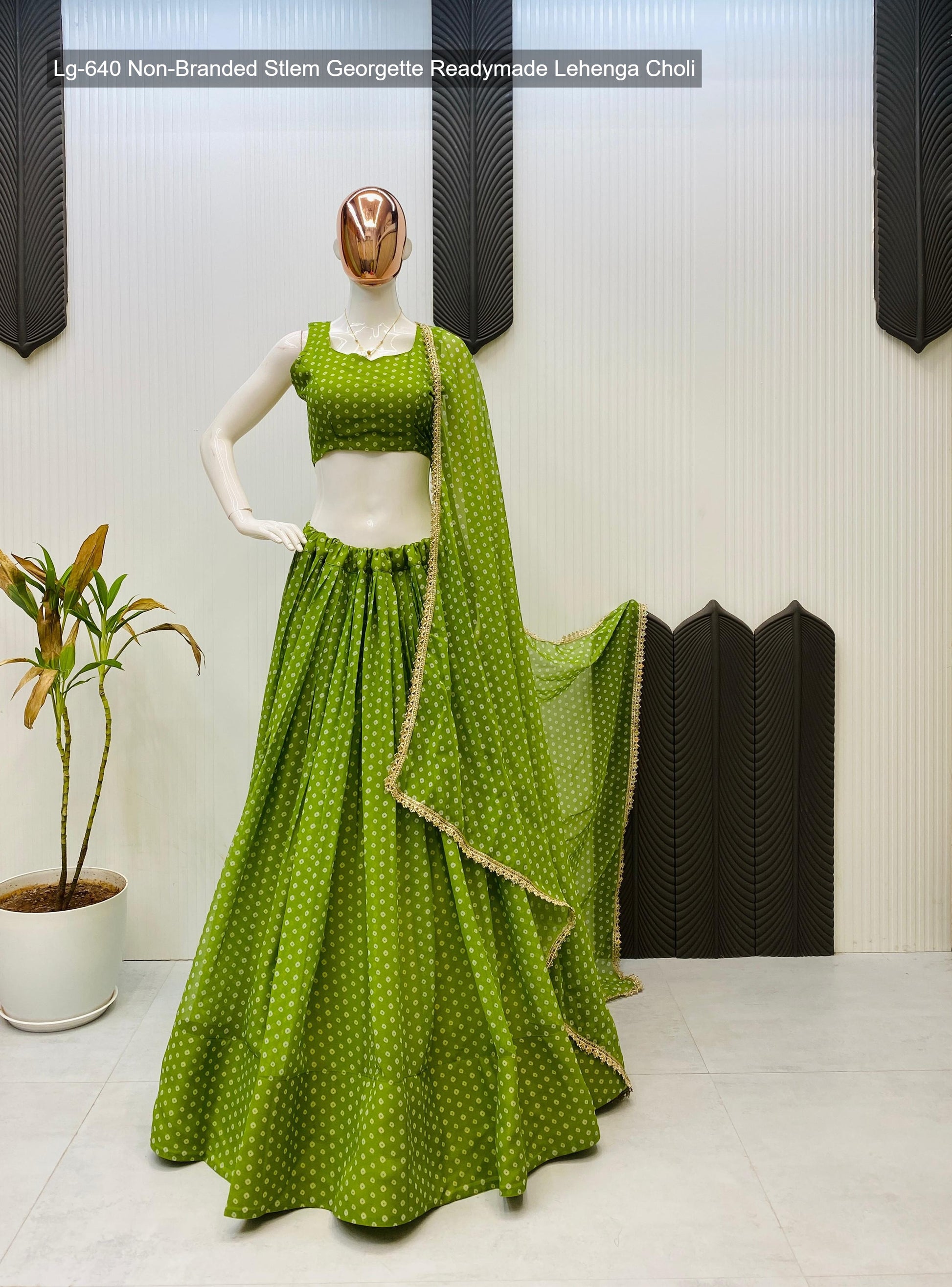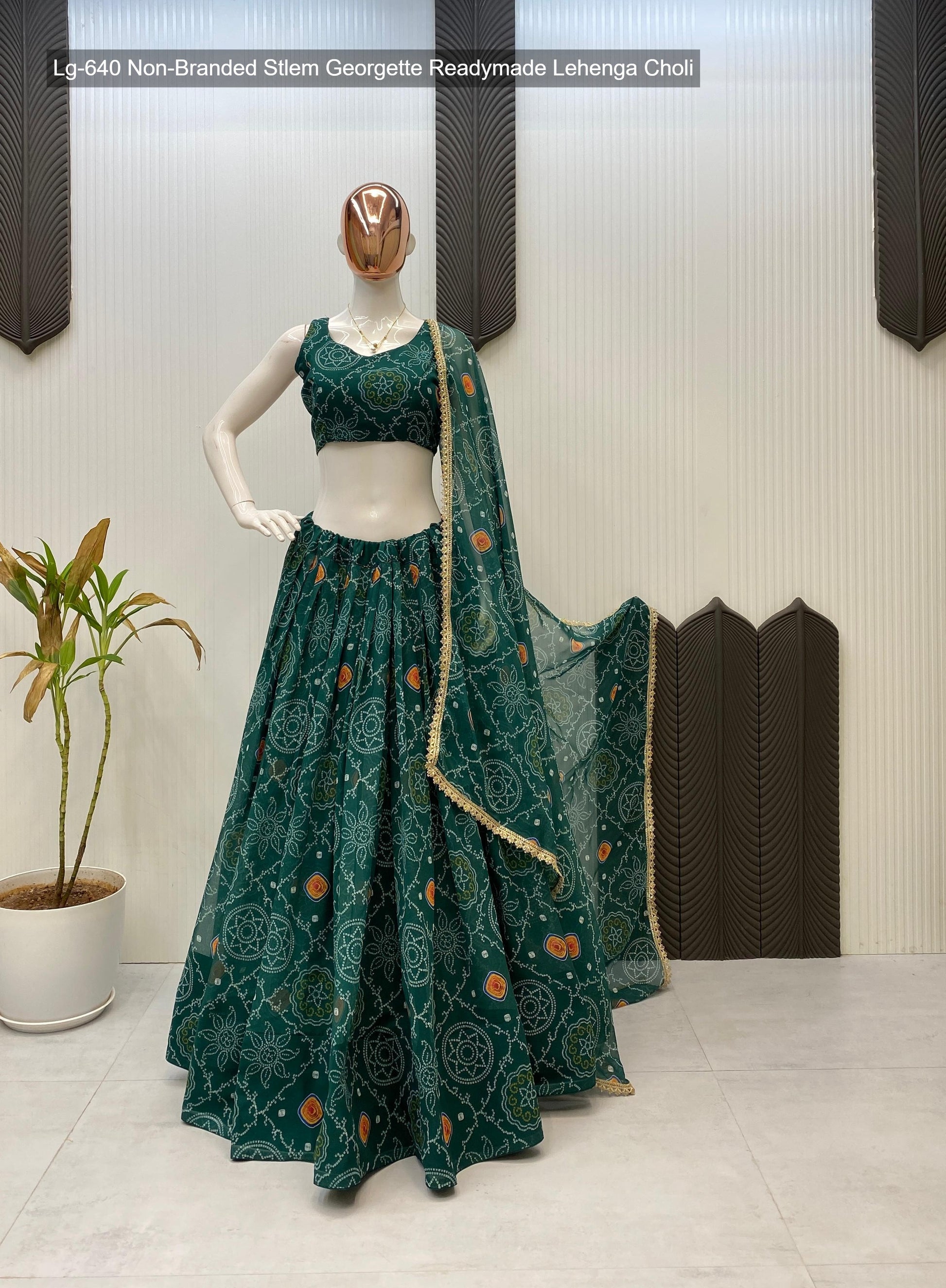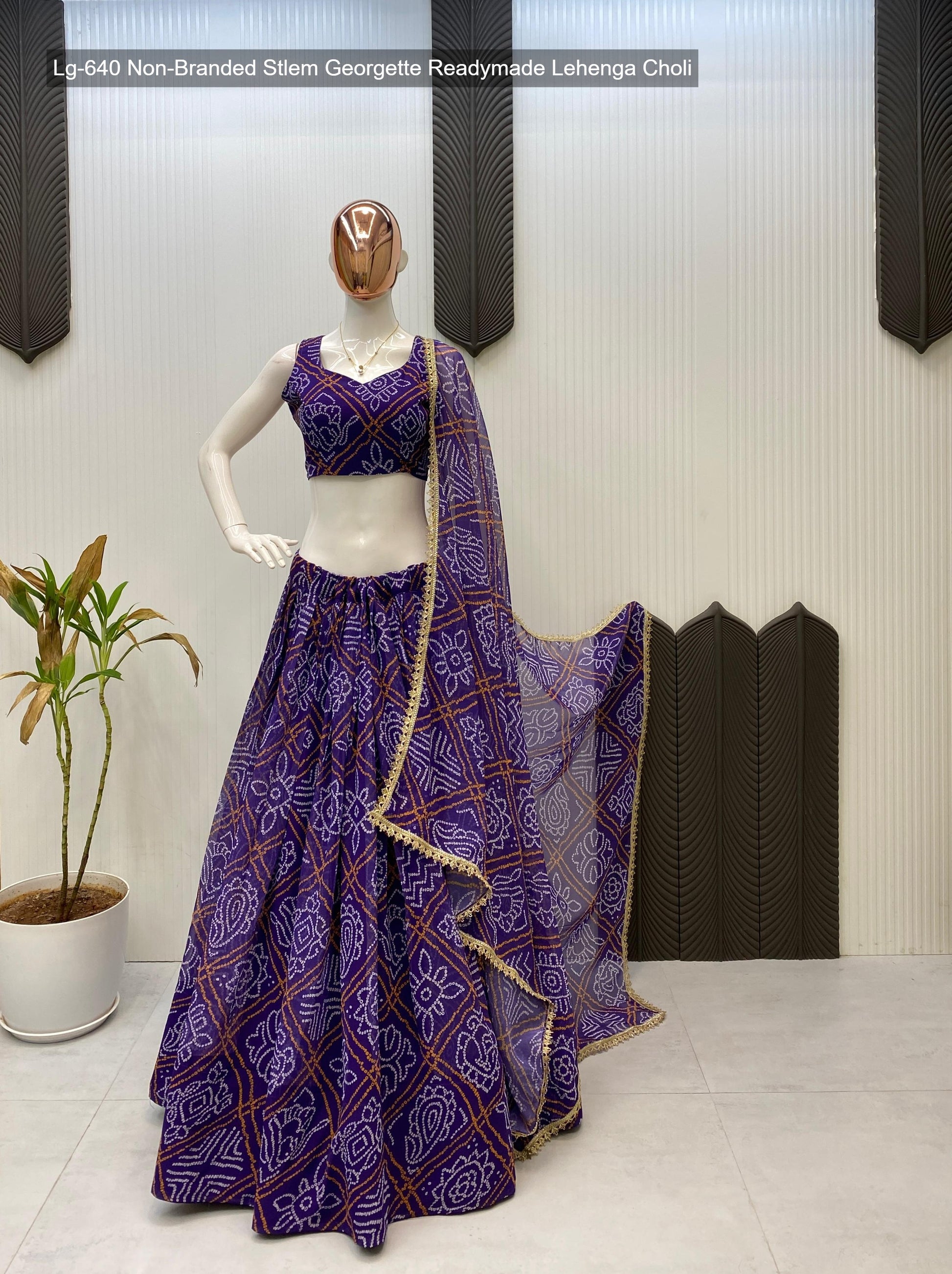 - Fabric Detail: Lehenga : Bandhani Printed Georgette Geometric Motifs Inner : Micro Height : 42 Inch Apx, Full Stitched And Full Flair ( Free Size ) , Blouse : Printed Georgette Sleeve Less Open Sleeves Attached Inner : Micro Height : 14 Inch Apx, Free Size , Dupatta : Georgette With Digital Print And Heavy Lace Work Cut : 2.2 Mtr Apx , Size Free Size ( Colour : Green, Purple, Yellow, Pink, Navy Blue, Lime Green )