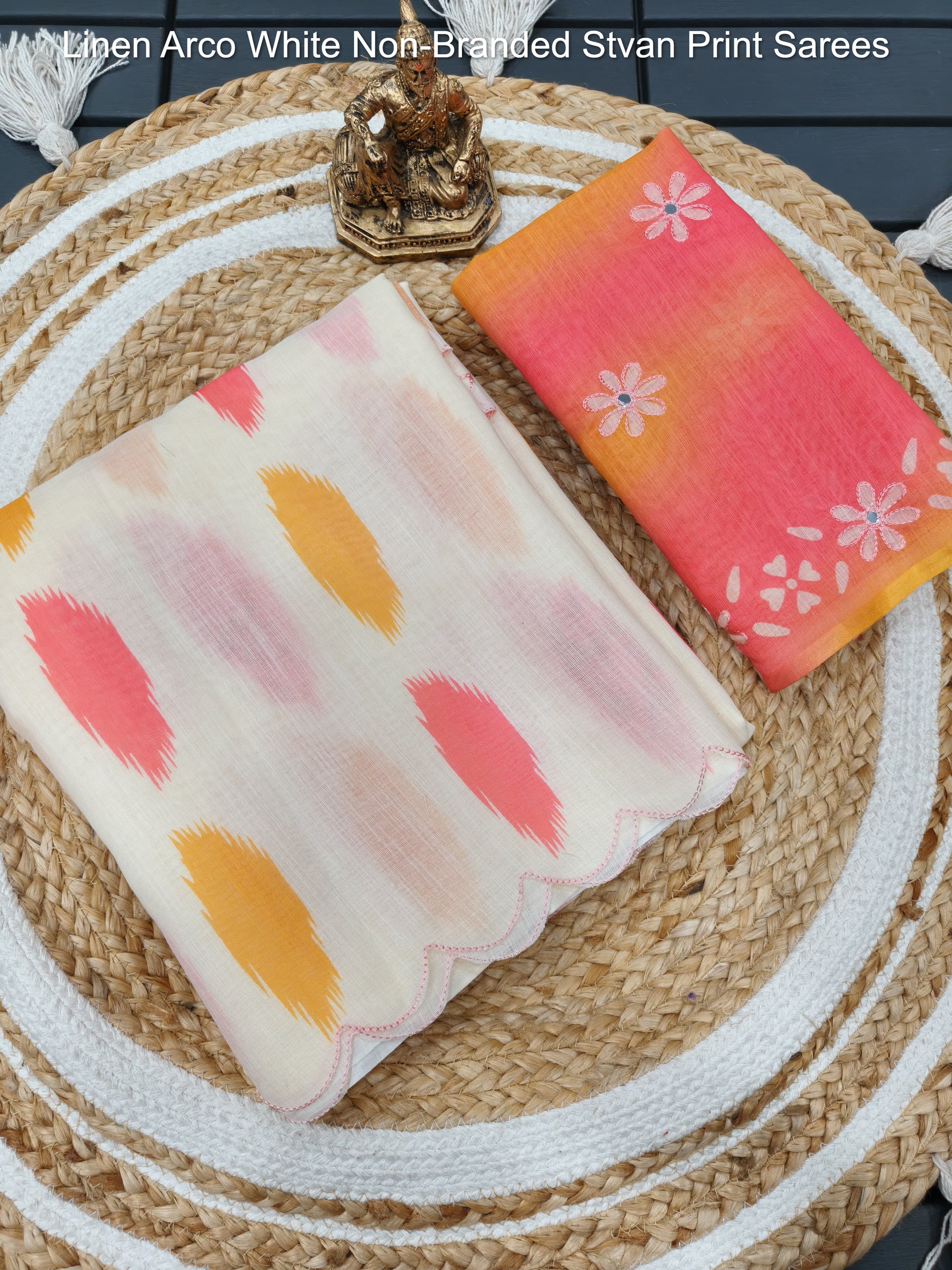 - Linen Arco White Non-Branded Stvan Print Sarees Dealer Ahmedabad Surat Wholesale Gujarat India Lowest Price Best Quality Buy Purchase Shipping Kurta Salwaar Kameez Also free Cash on delivery