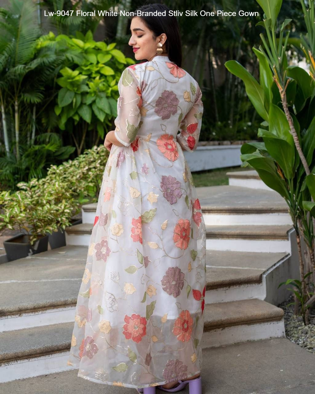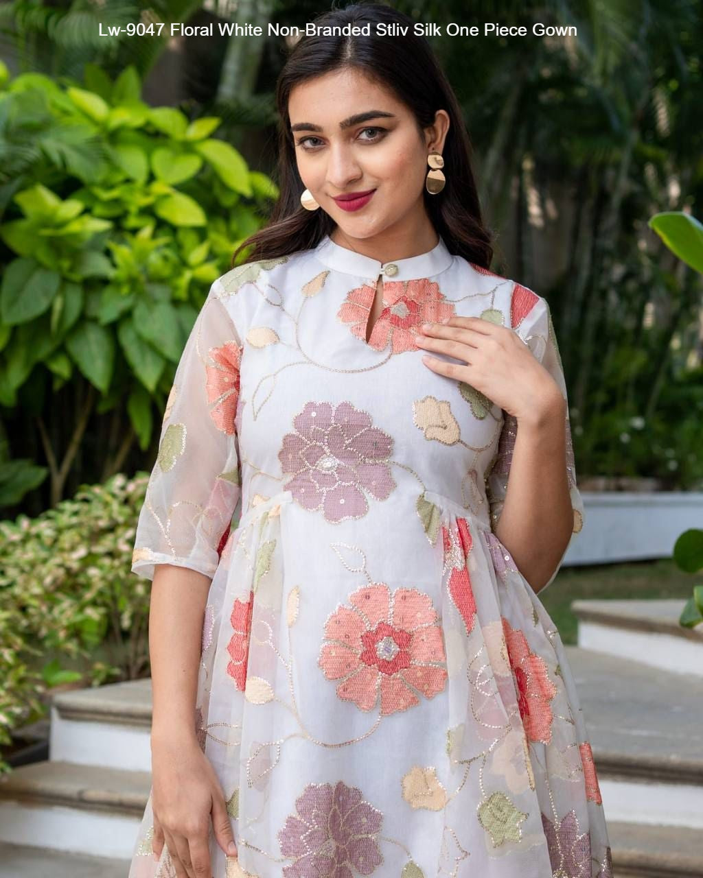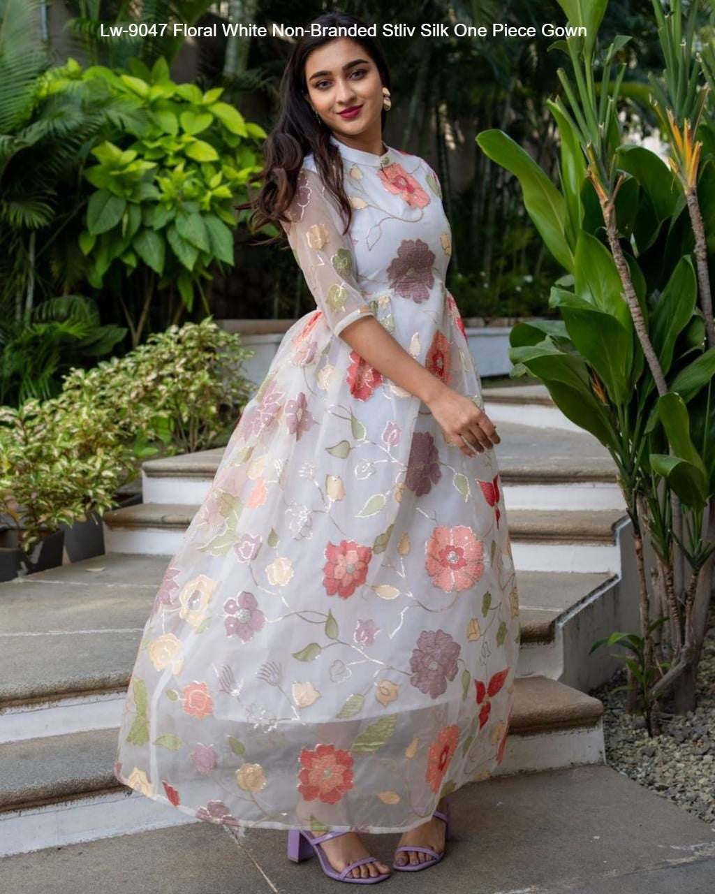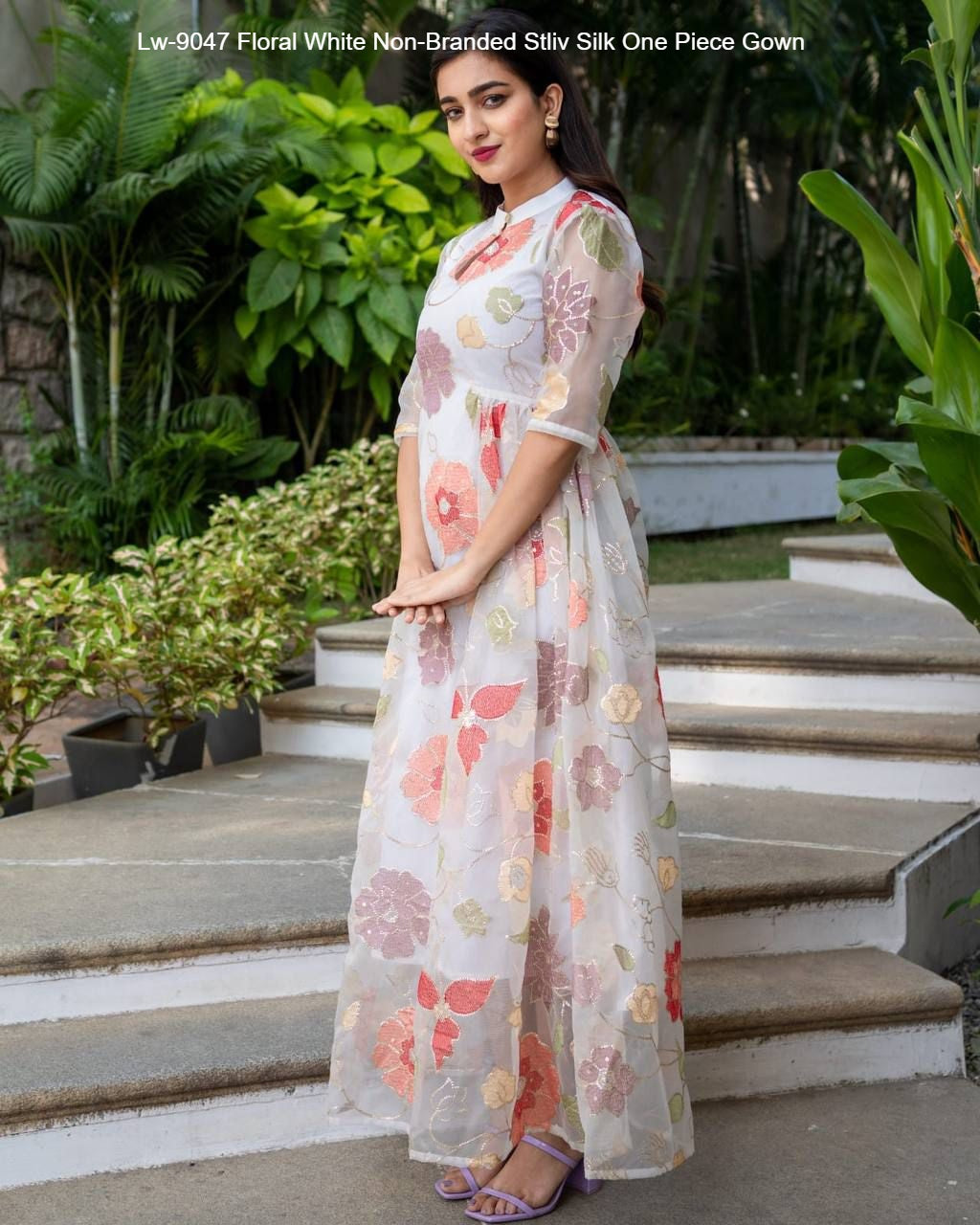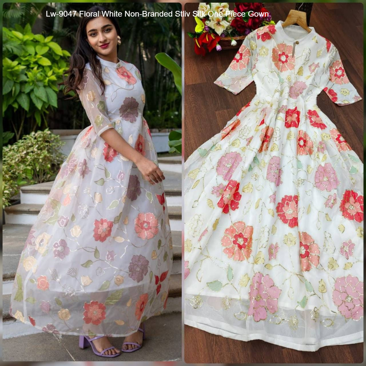 - Lw-9047 Floral White Non-Branded Stliv Silk One Piece Gown Dealer Ahmedabad Surat Wholesale Gujarat India Lowest Price Best Quality Buy Purchase Shipping Kurta Salwaar Kameez Also free Cash on delivery