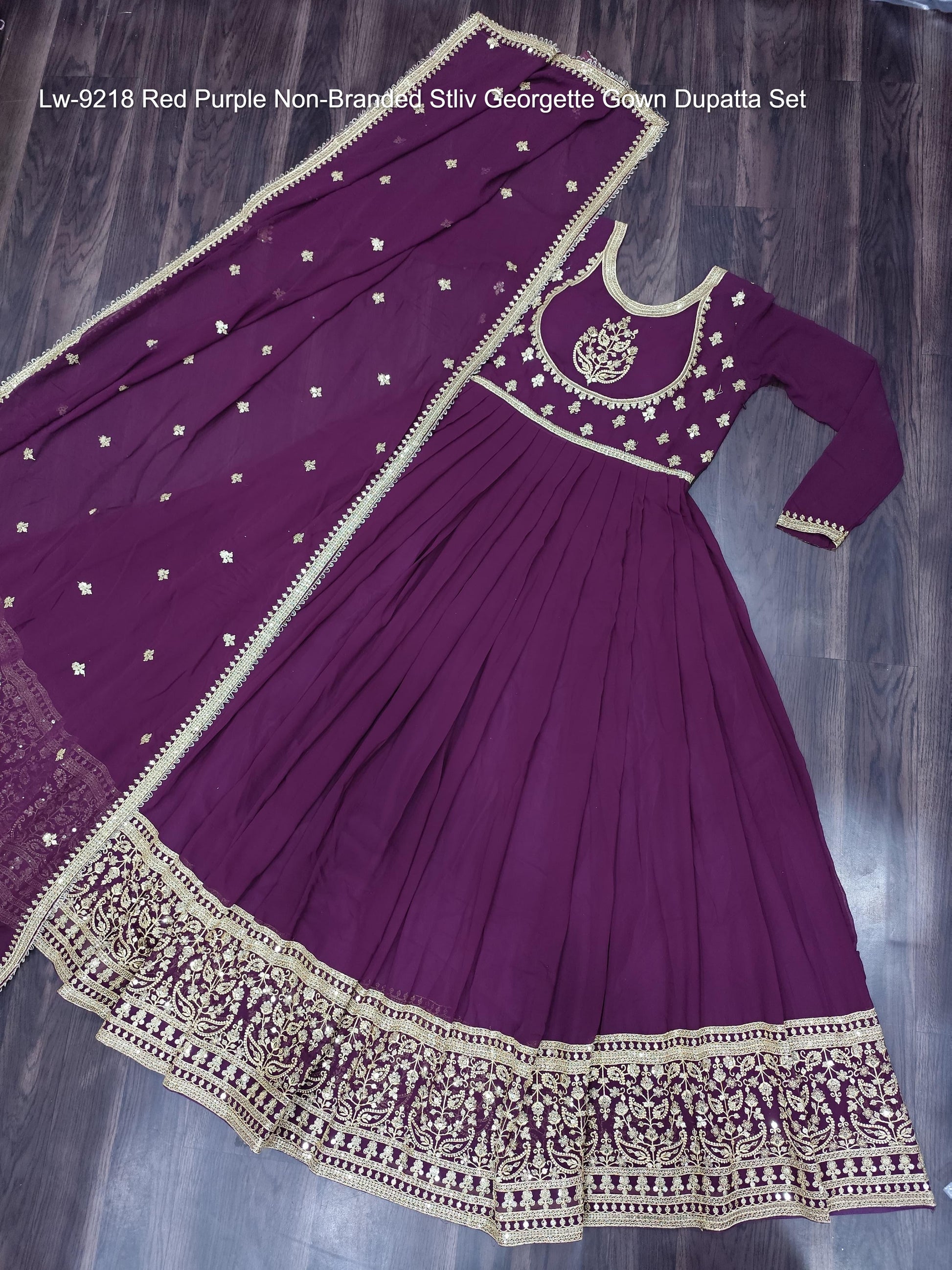 - Lw-9218 Red Purple Non-Branded Stliv Georgette Gown Dupatta Set Dealer Ahmedabad Surat Wholesale Gujarat India Lowest Price Best Quality Buy Purchase Shipping Kurta Salwaar Kameez Also free Cash on delivery