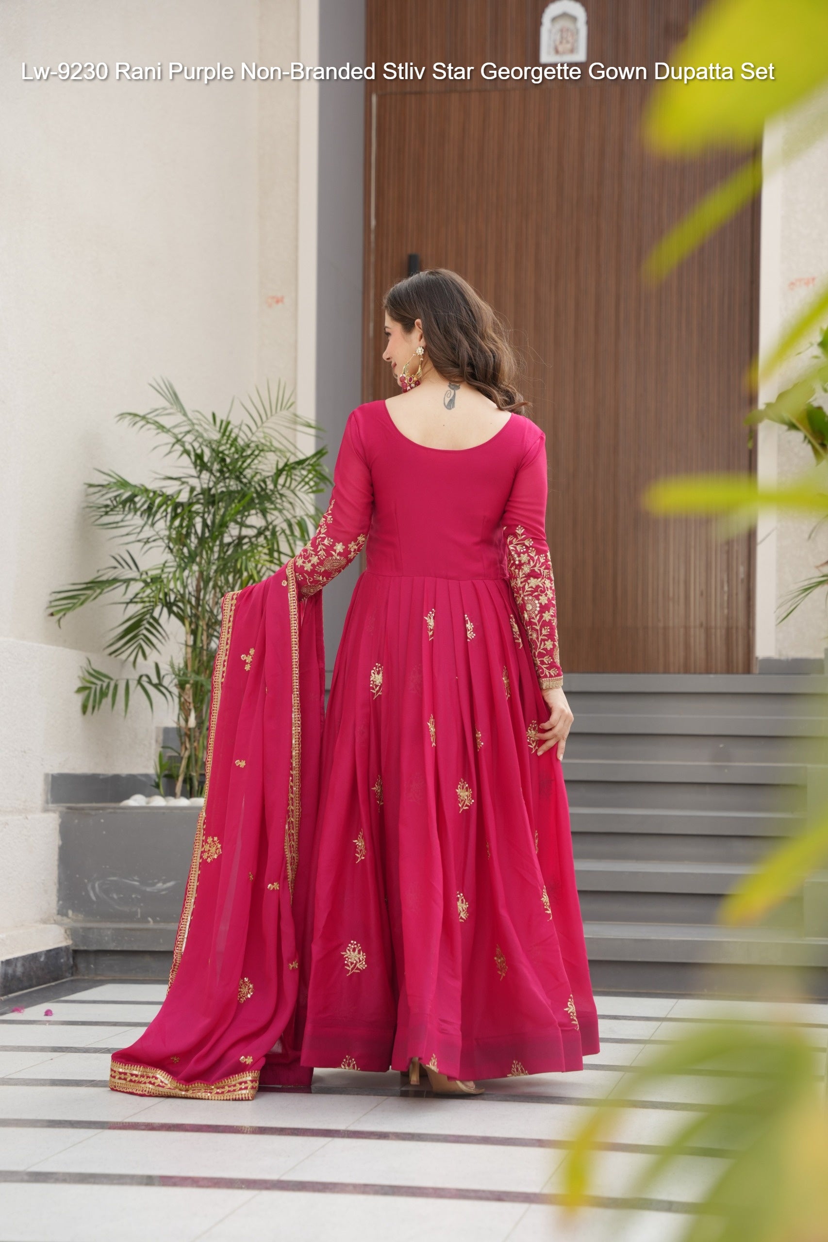Lw-9230 Rani Purple Non-Branded Stliv Star Georgette Gown Dupatta Set