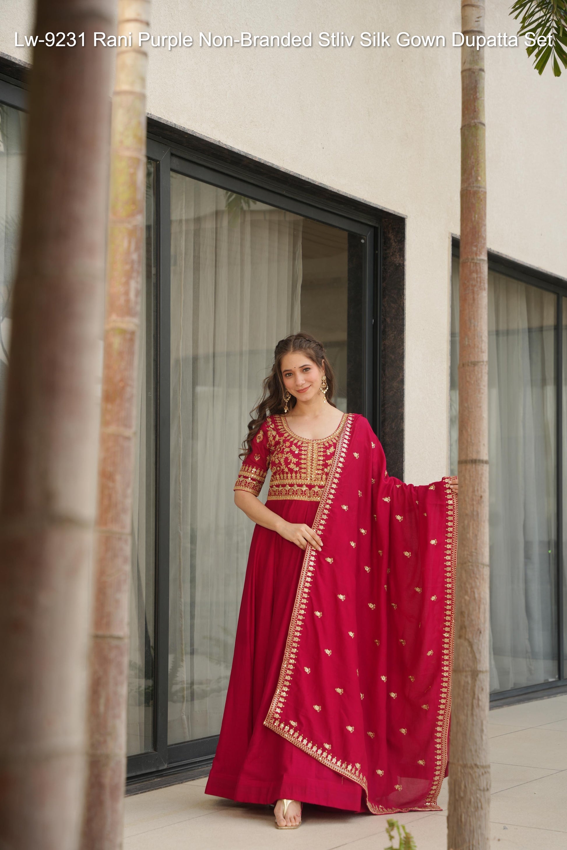 - Lw-9231 Rani Purple Non-Branded Stliv Silk Gown Dupatta Set Dealer Ahmedabad Surat Wholesale Gujarat India Lowest Price Best Quality Buy Purchase Shipping Kurta Salwaar Kameez Also free Cash on delivery