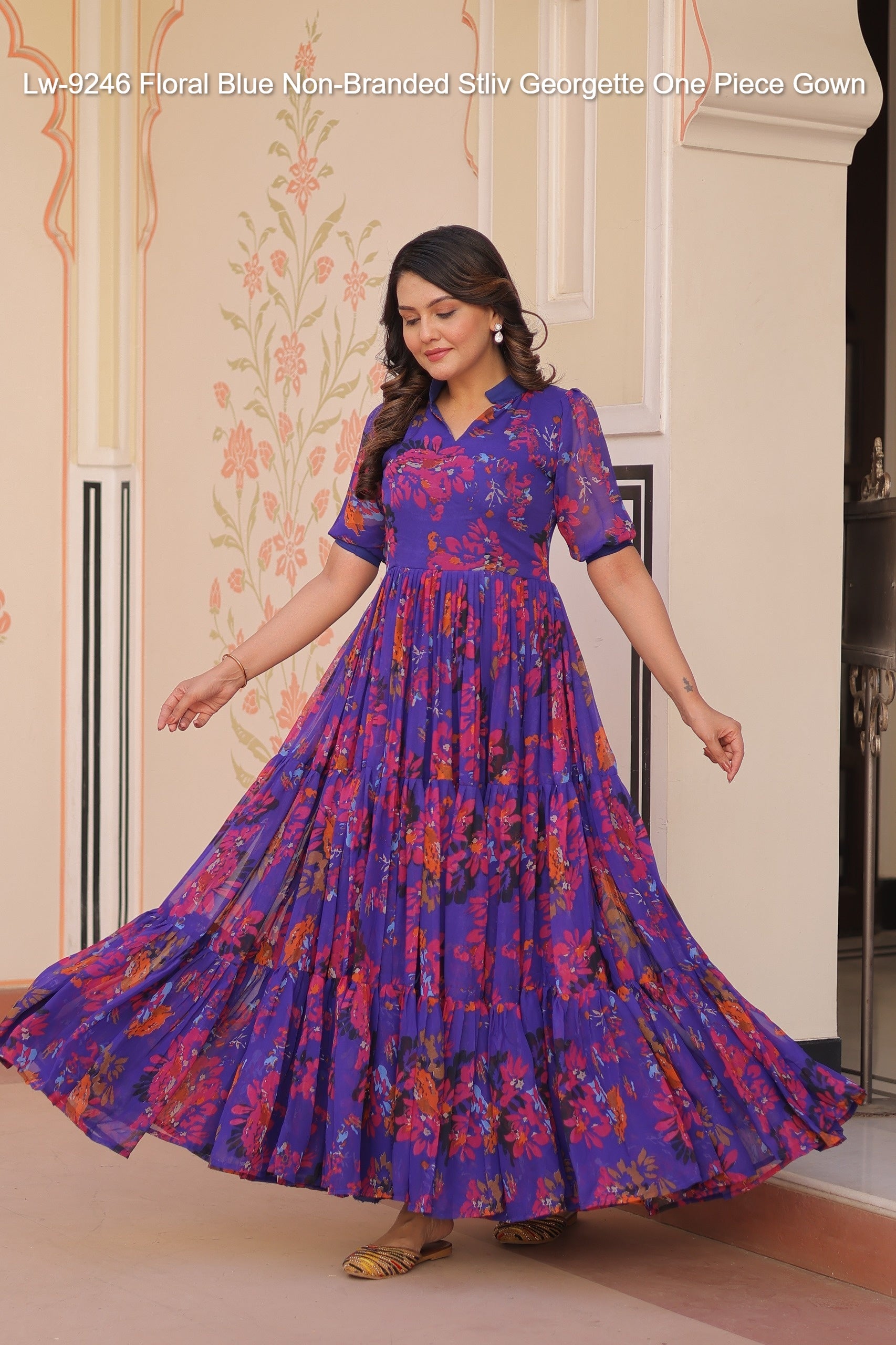 - Lw-9246 Floral Blue Non-Branded Stliv Georgette One Piece Gown Dealer Ahmedabad Surat Wholesale Gujarat India Lowest Price Best Quality Buy Purchase Shipping Kurta Salwaar Kameez Also free Cash on delivery