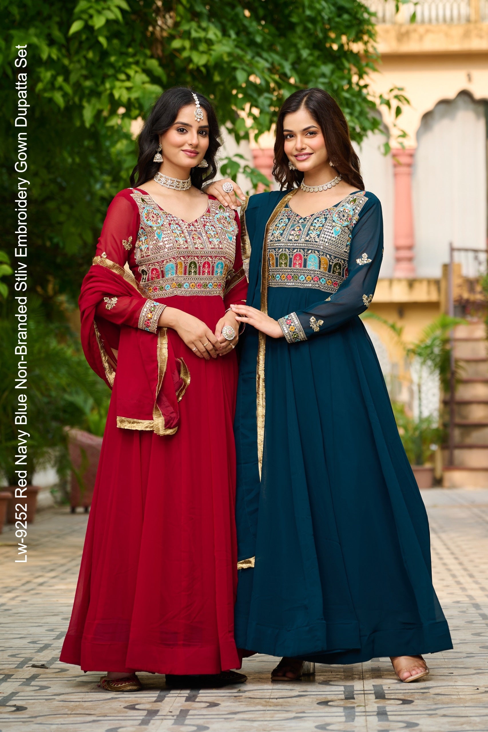 Lw-9252 Red Navy Blue Non-Branded Stliv Embroidery Gown Dupatta Set