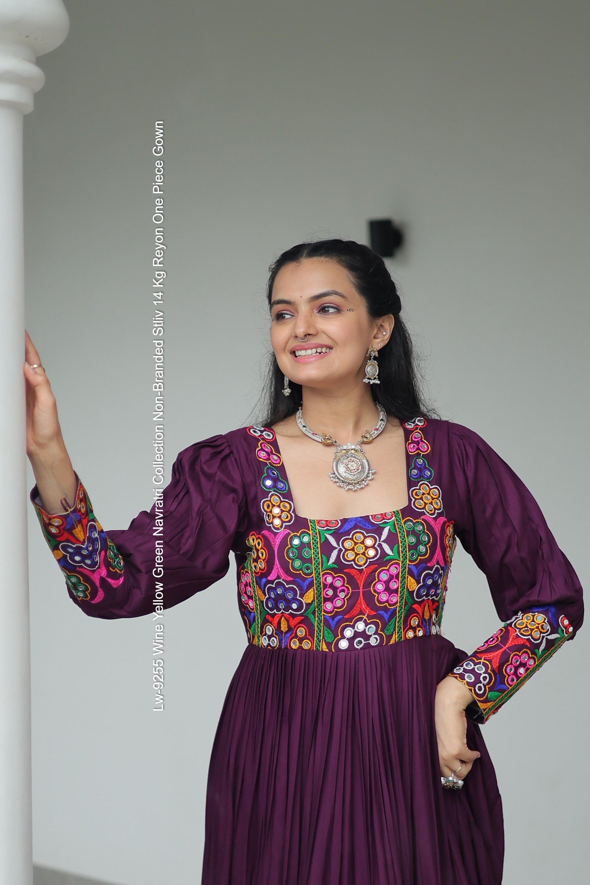 Lw-9255 Wine Yellow Green Navratri Collection Non-Branded Stliv 14 Kg Reyon One Piece Gown