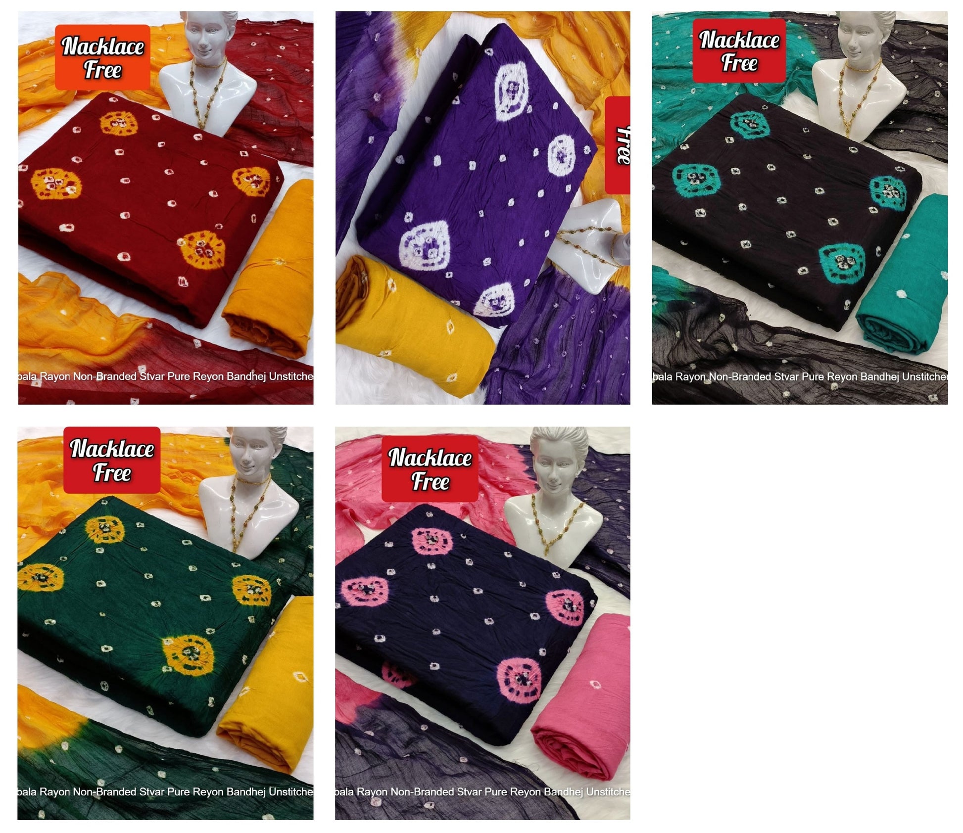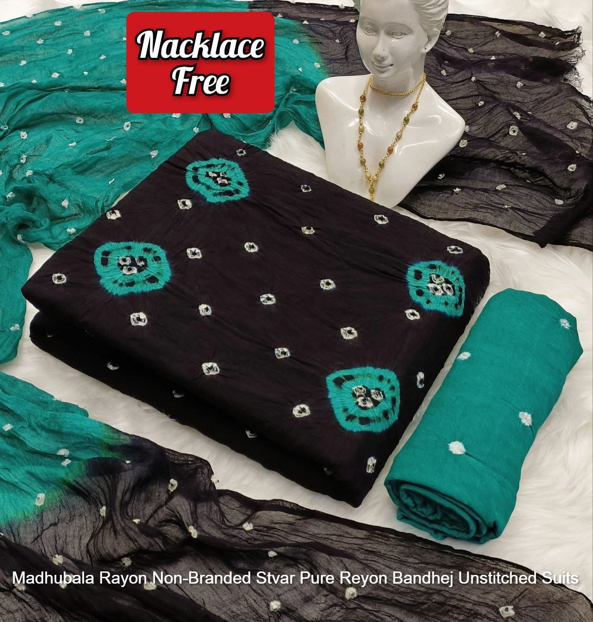 - Fabric Detail: Top : Pure Reyon Bandhej Reyon 2.30 Mtr Apx,Unstitched With Nacklace, Bottom : Reyon 2.10 Mtrs Apx,Unstitched, Duppata : Reyon 2.10 Mtrs Apx,