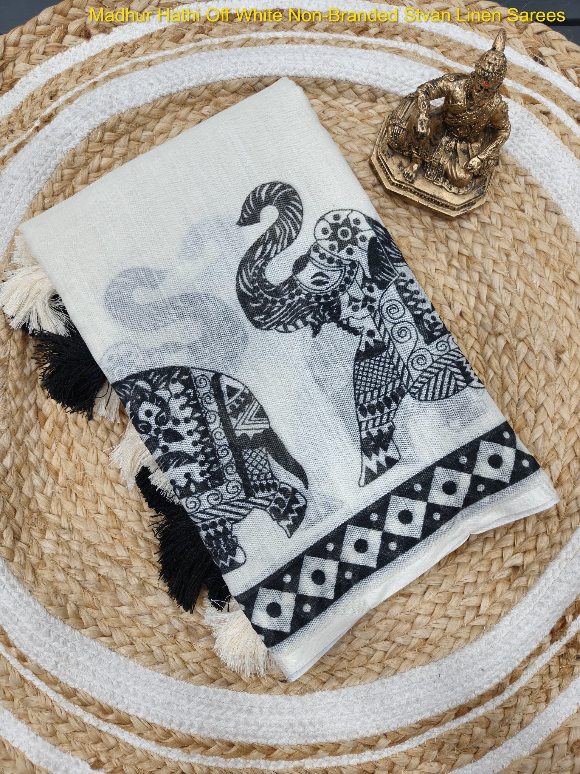 Madhur Hathi Off White Non-Branded Stvan Linen Sarees