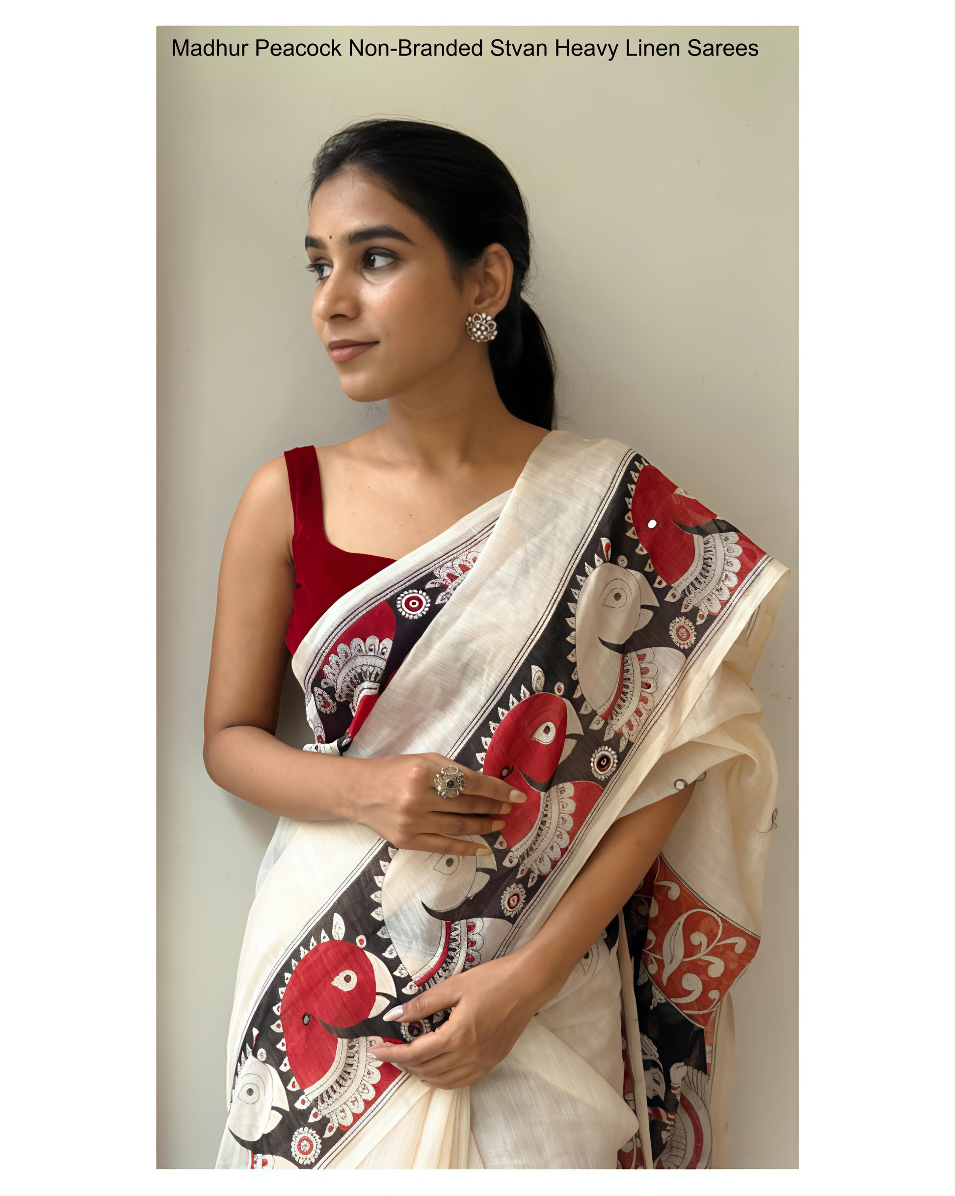 Madhur Peacock Non-Branded Stvan Heavy Linen Sarees