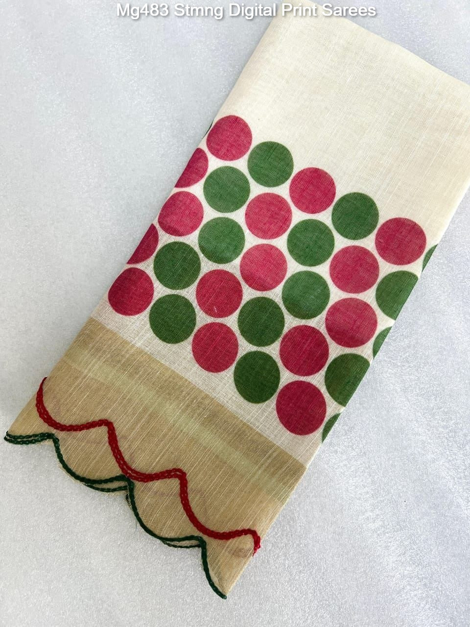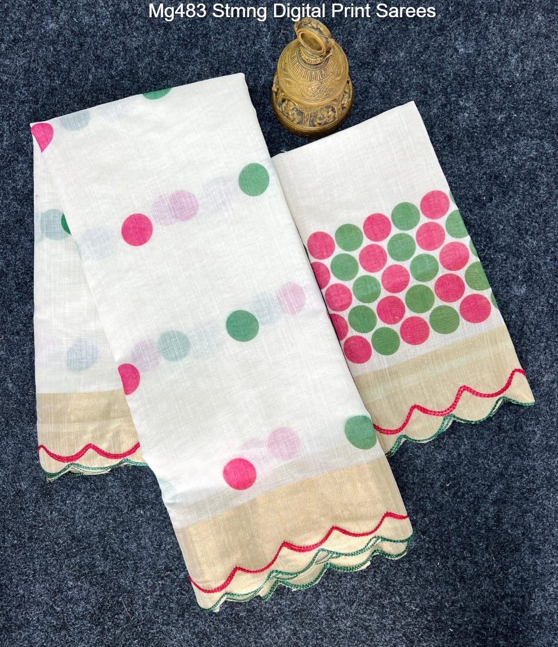 - Fabric Detail: Saree : Linen With Gold Zari Border Digital Print Cutwork Border With Handwork, Cut : 5.5 Mtr , Blouse : Linen With Gold Zari Border With Digital Print Cut Work, Cut : 1 Mtr Unstitched , ,