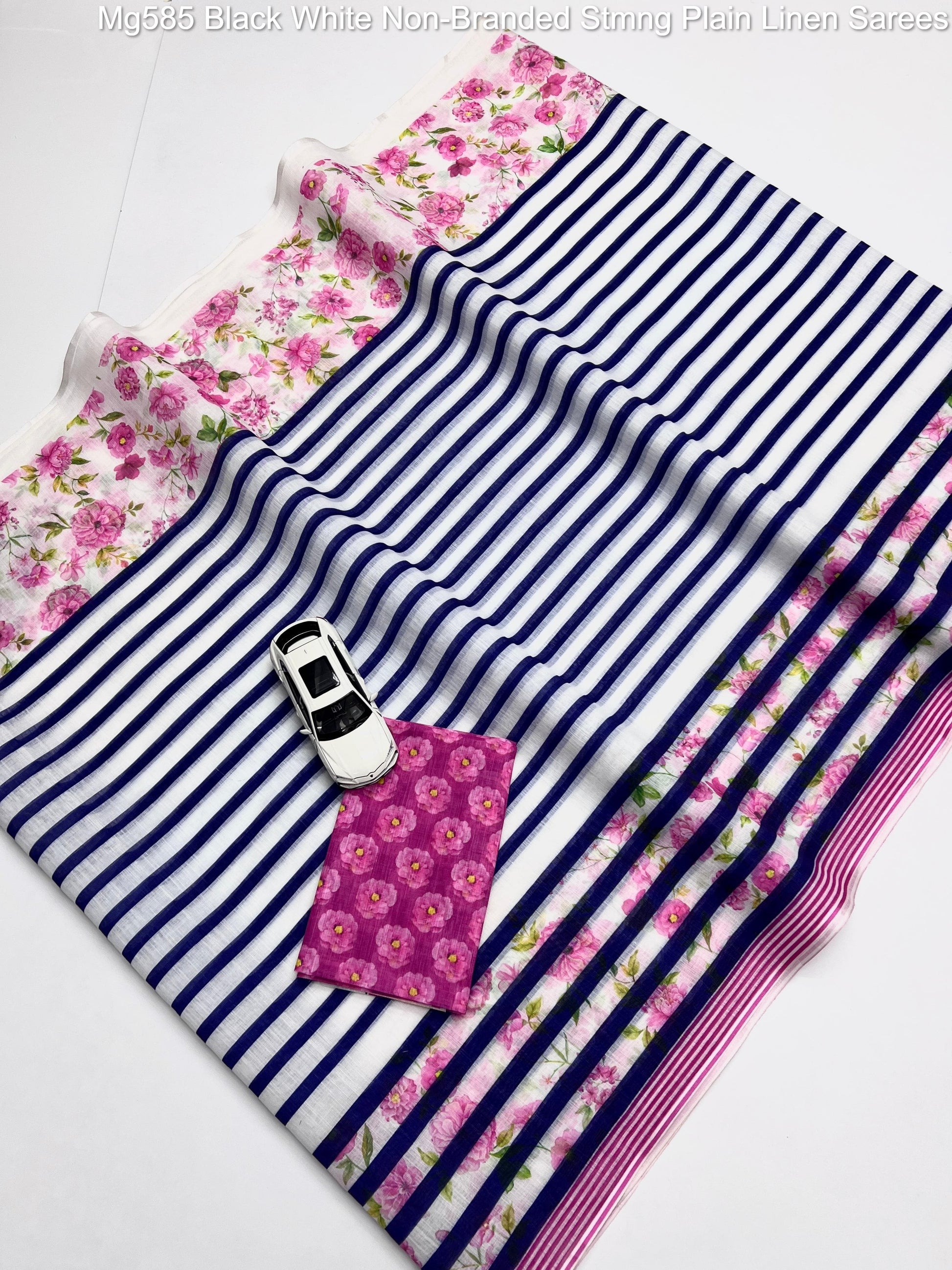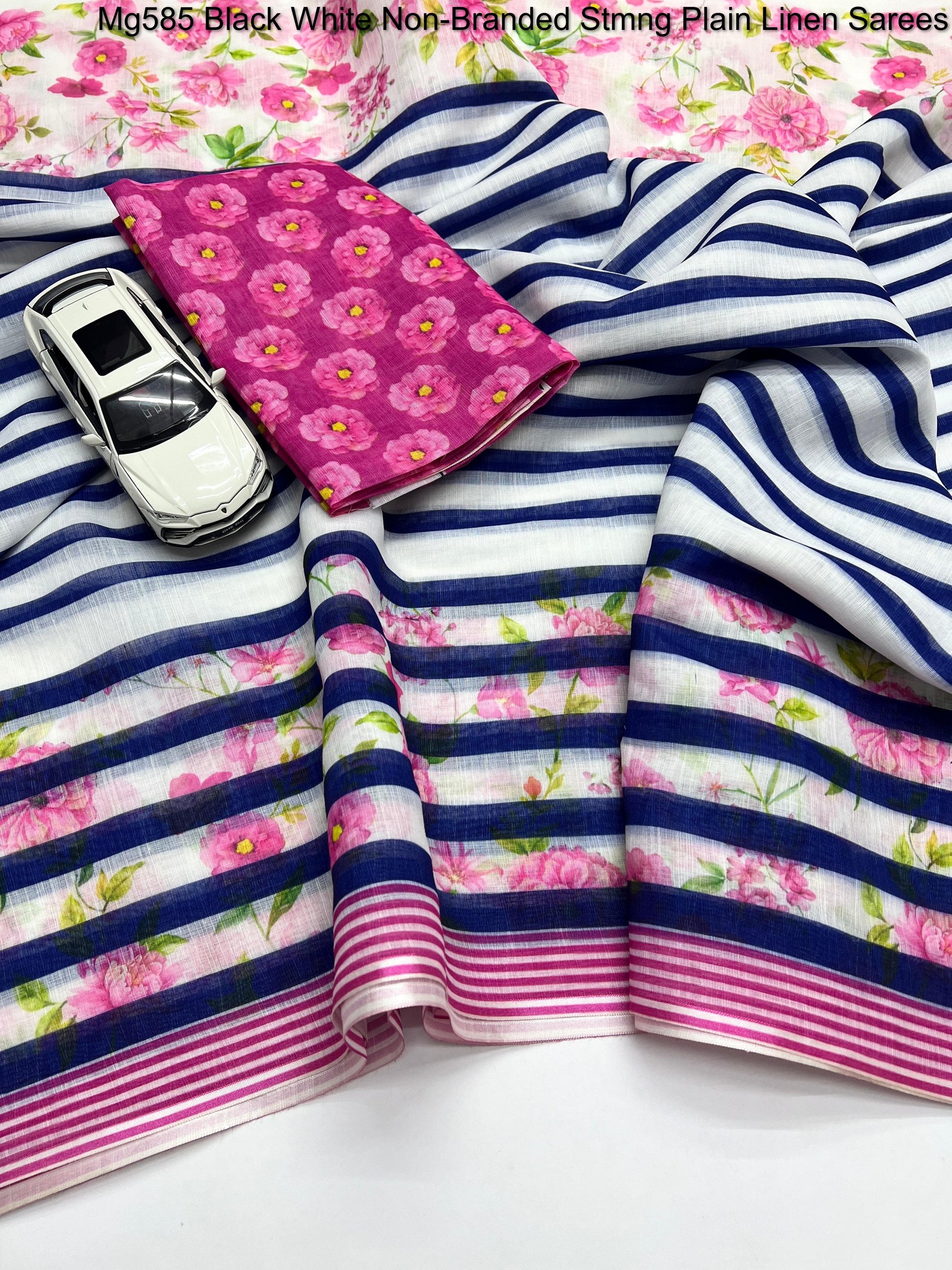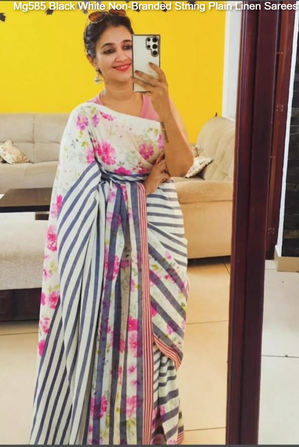Mg585 Black White Non-Branded Stmng Plain Linen Sarees