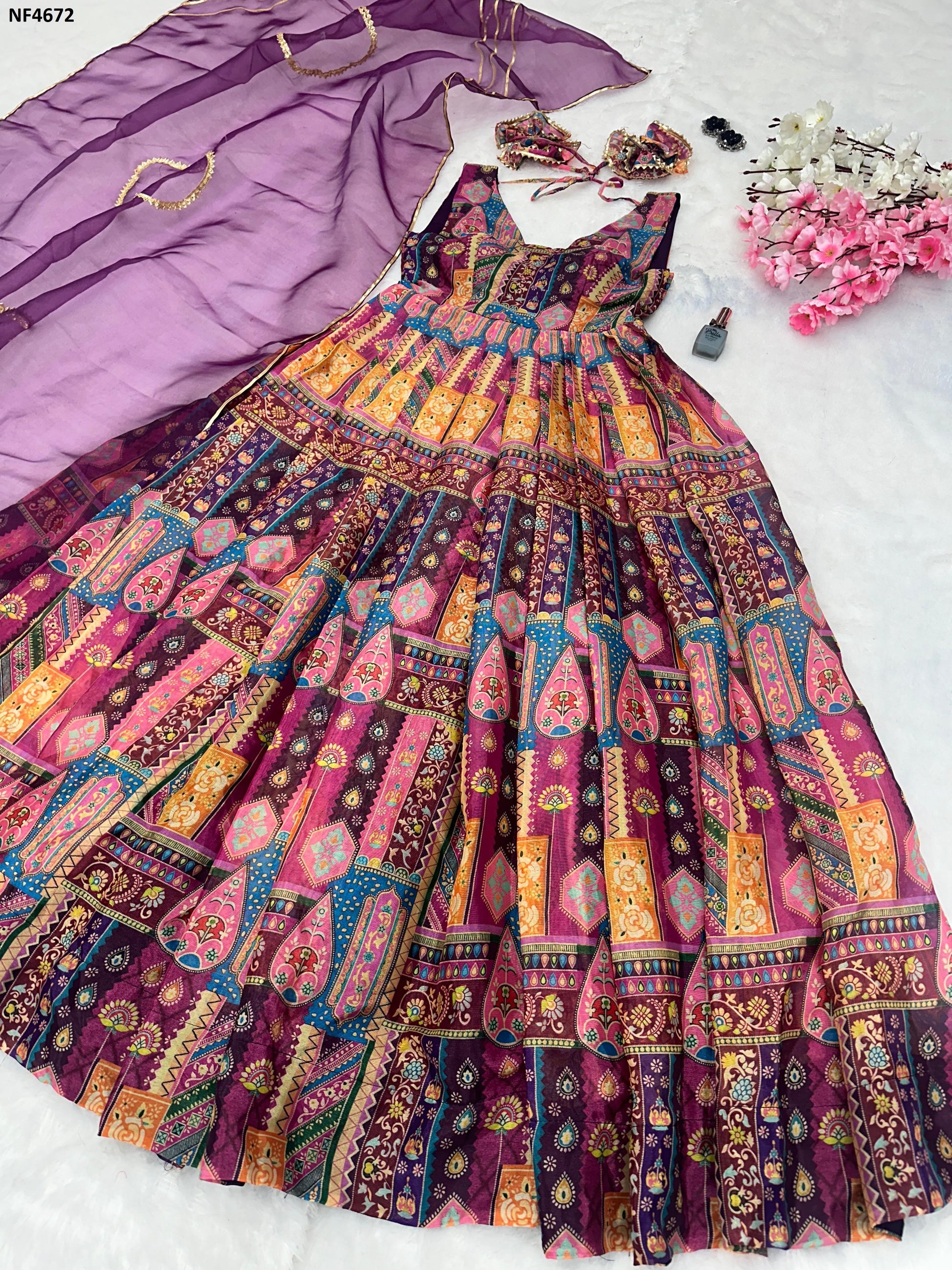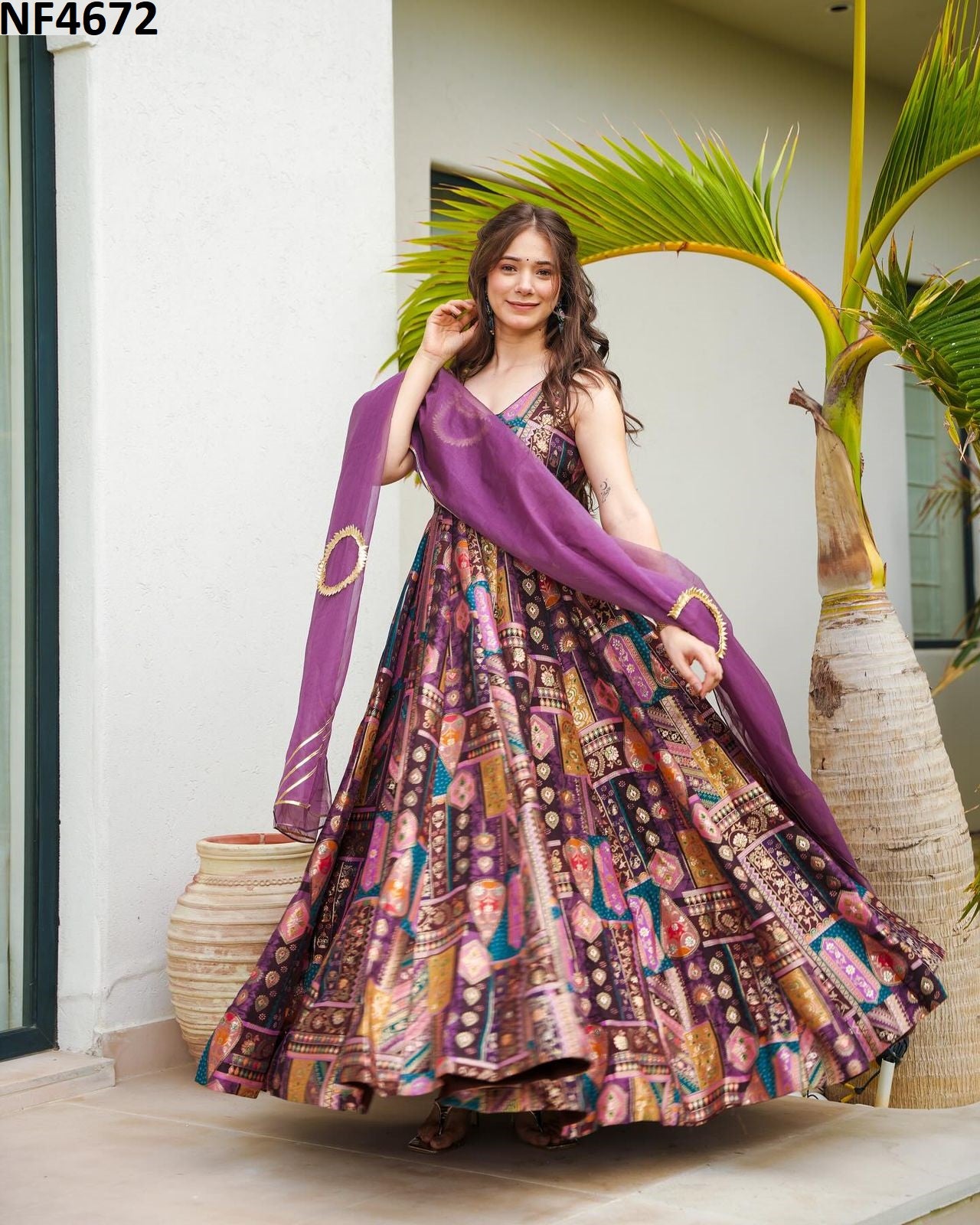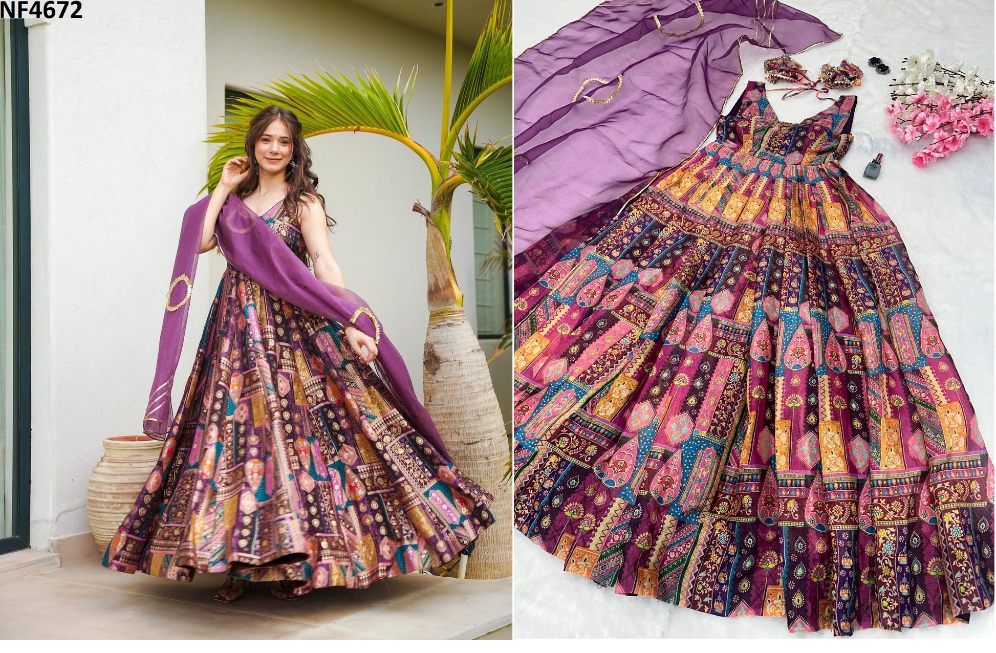 - Fabric Detail: Top : Pure Jimmy Organza Silk Digital Printed Padded With 52Apx Gown Length, Flare : 8 Mtr Fully Stitched , Dupatta : Organza Silk With Designer Lace, , Size : 34, 36, 38, 40, 42 ( Margin Available For 44 )