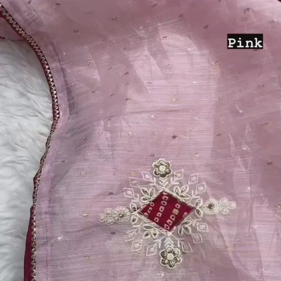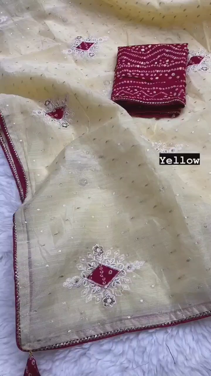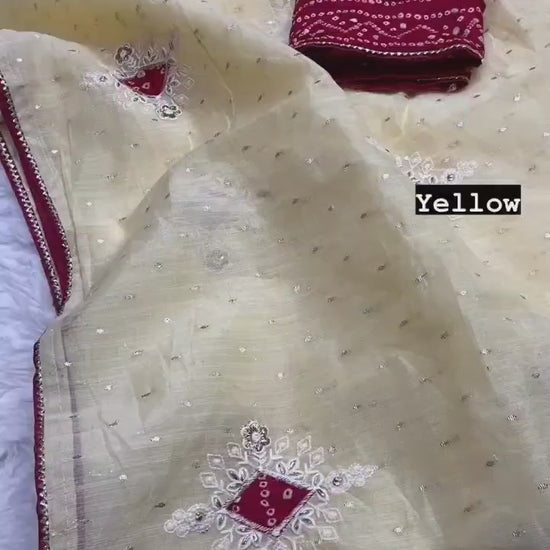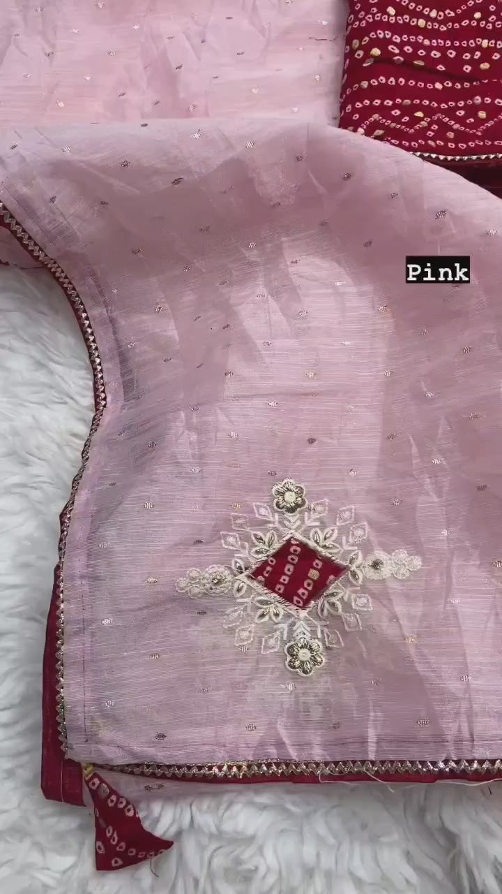 - Fabric Detail: Saree : Beautiful Cotton With Rich Look Bandej Cording Butta In Whole All Over Zari Work With Latkan, Blouse : Soft Cotton Bandhej Unstitched , ,